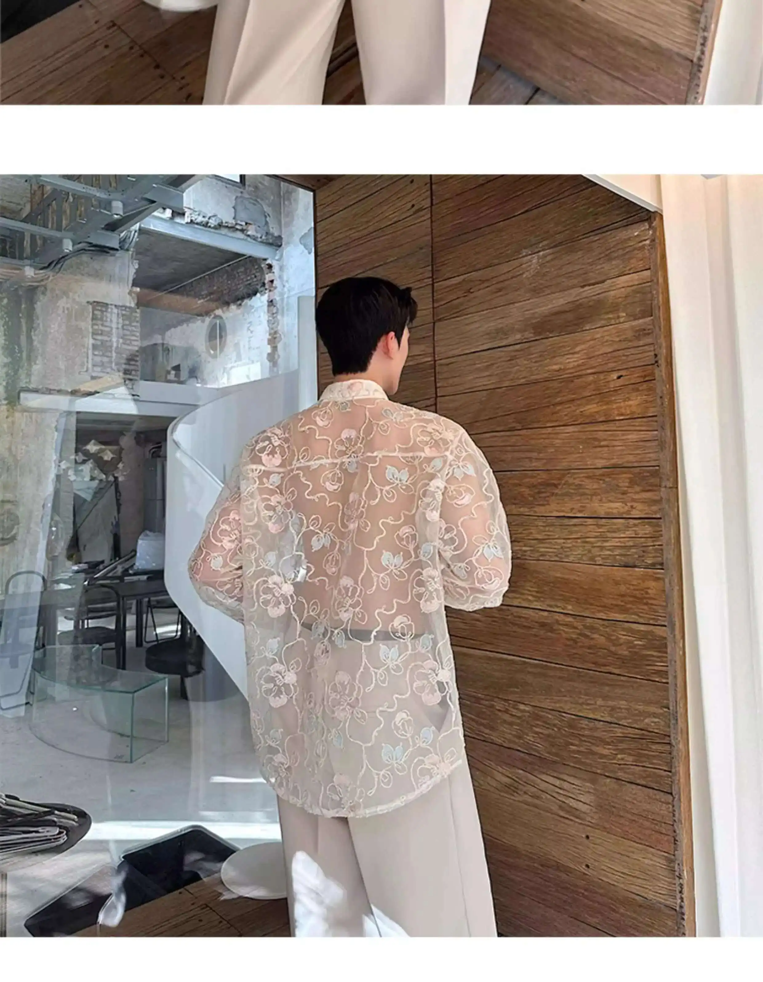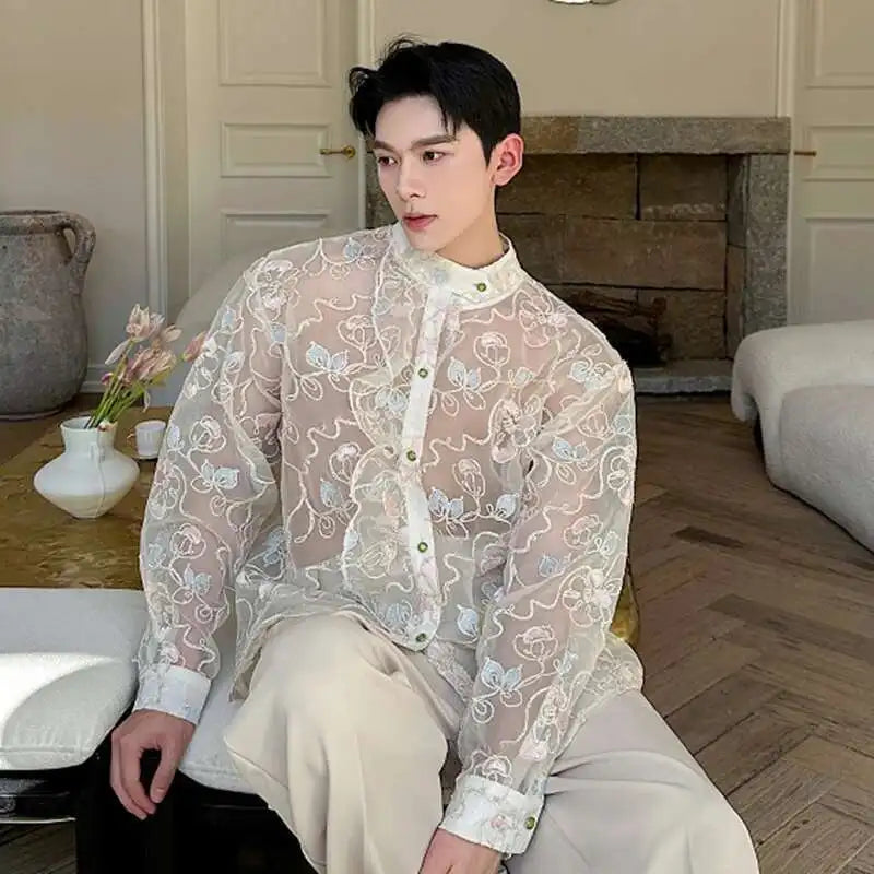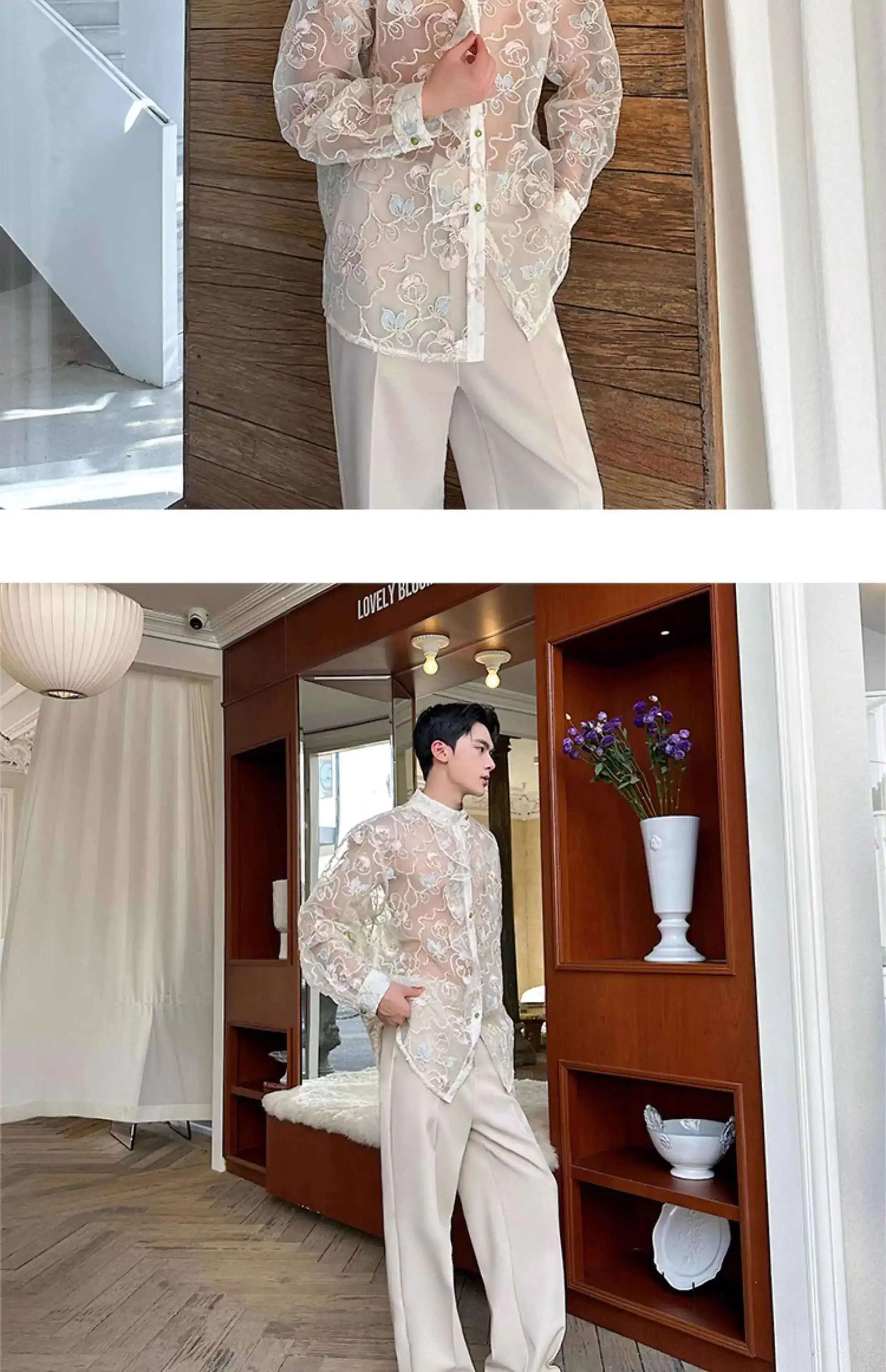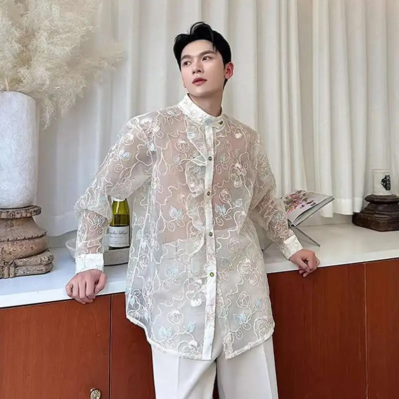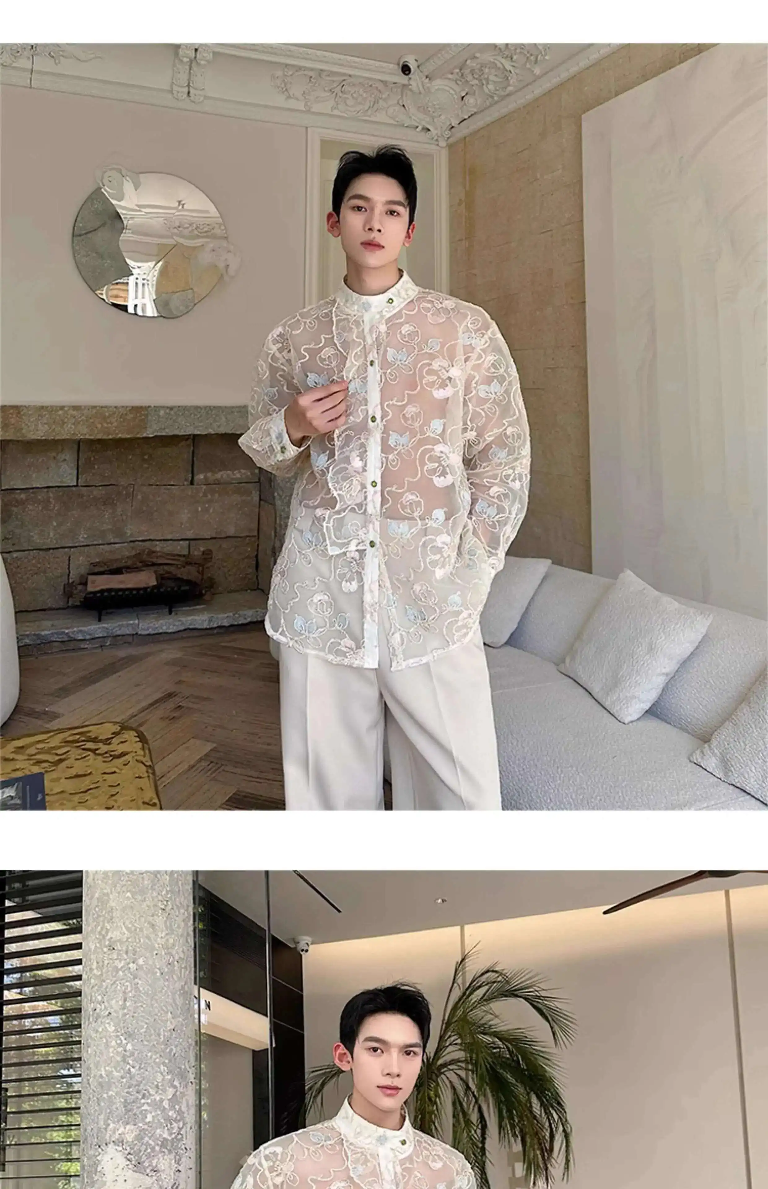 AIDASE - New Summer Male Shirts Long Sleeve Threedimensional Embroidery Jacquard Decoration Singel Breasted Stand Menwear