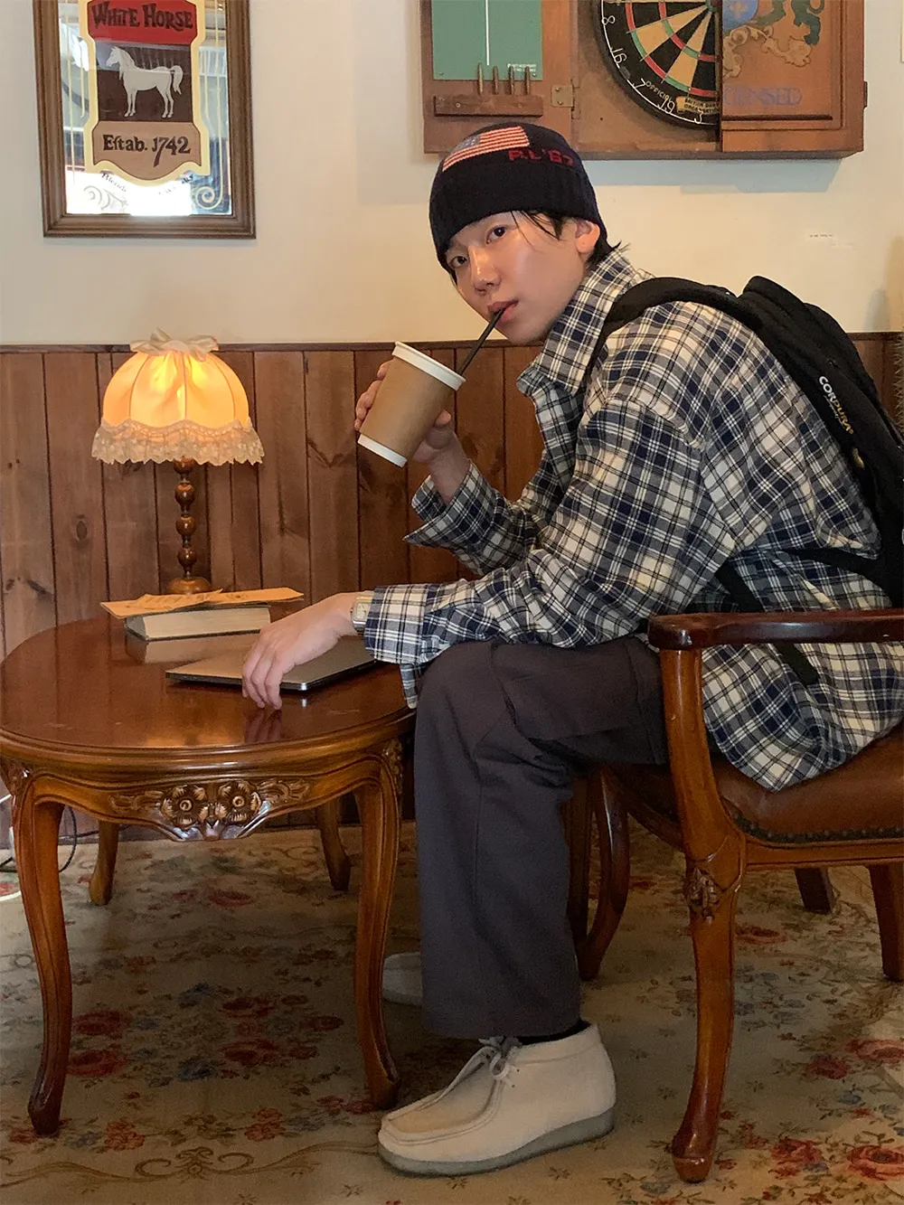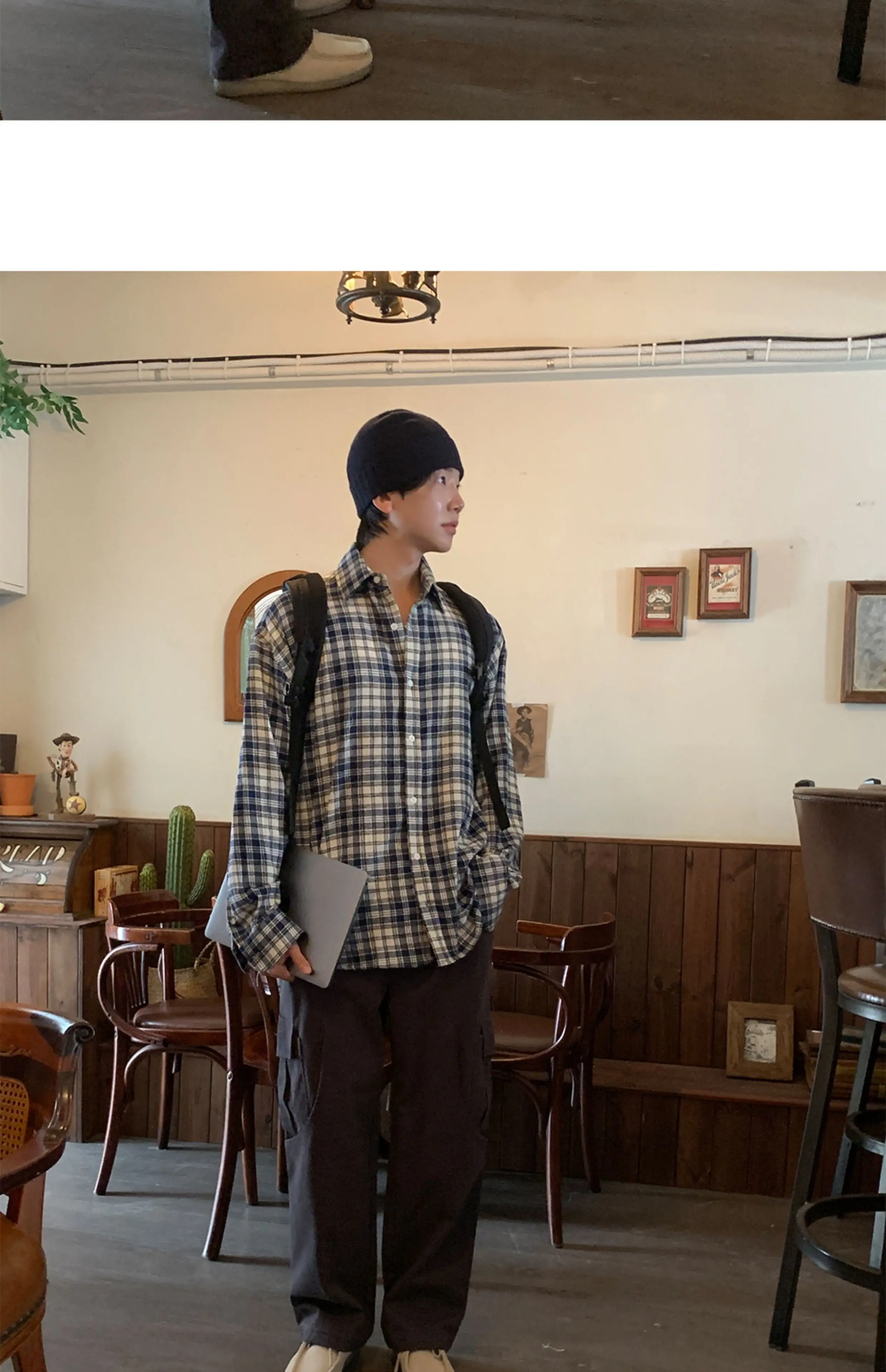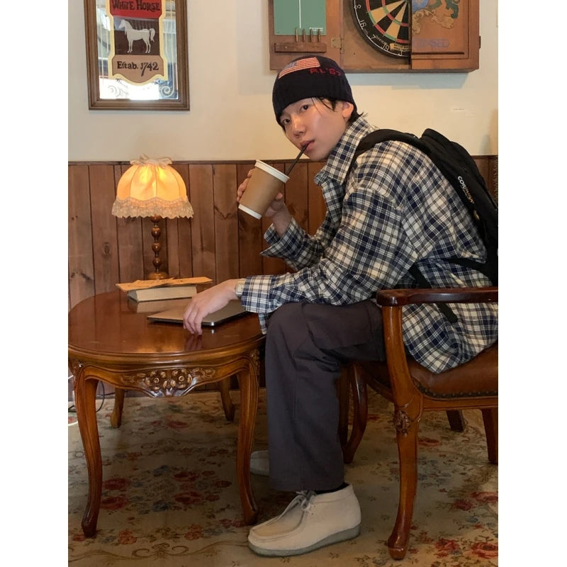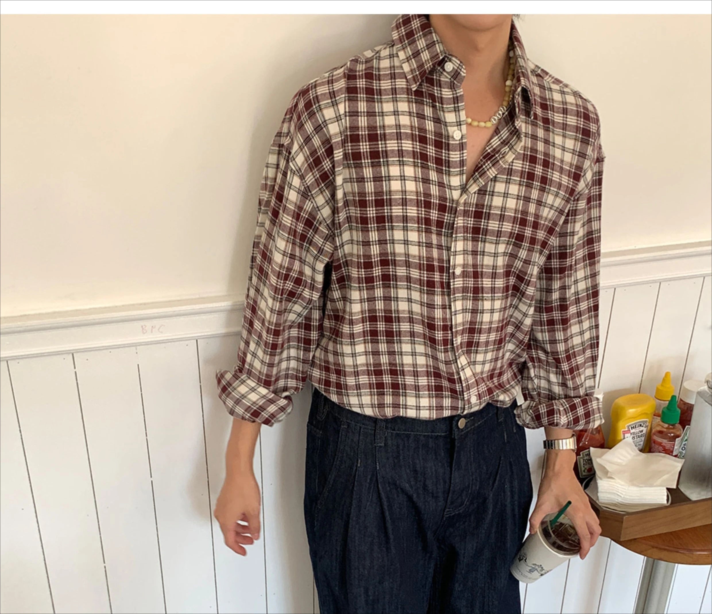 AIDASE - Oversized Men's Plaid Long Sleeve Korean Style Shirt, Trendy Loose Plaid Shirt, Handsome Jacket, Unisex American Retro Plaid