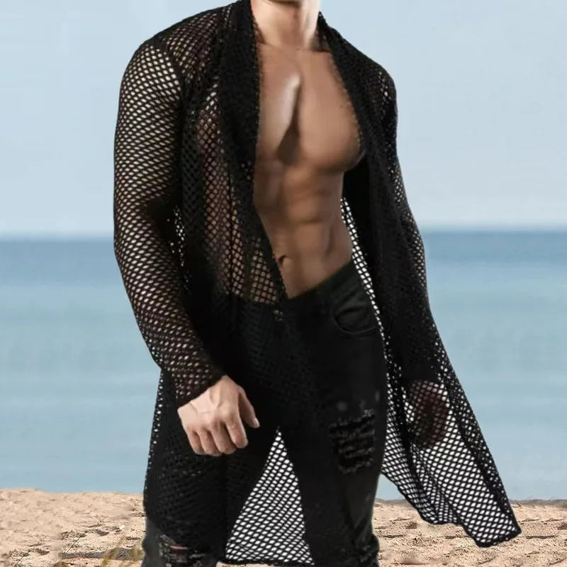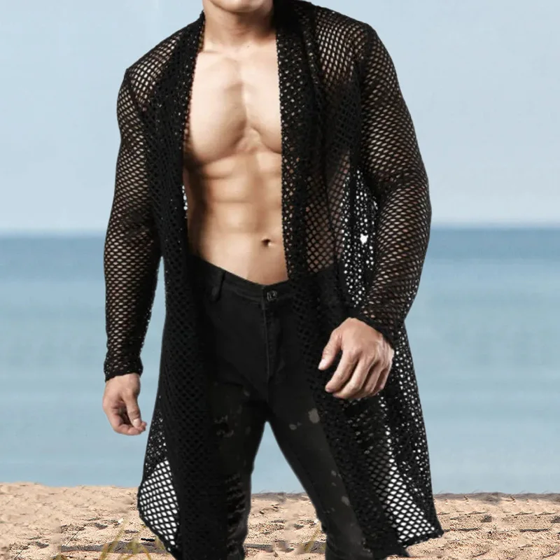 Aidase Sexy Hollow Out Loose Cardigan Shawl Mens Spring Summer Long Sleeve Beach Shirts Mesh Perspective Long Coat Cloak Streetwear