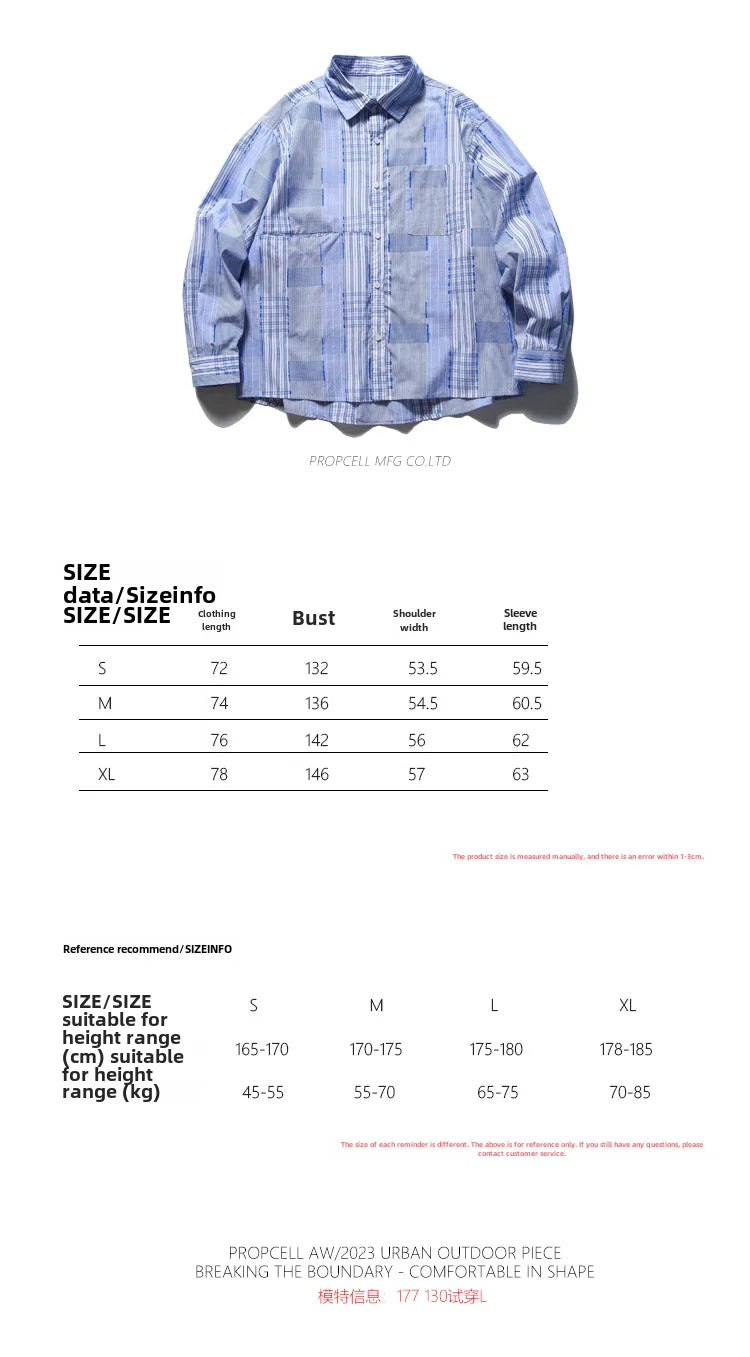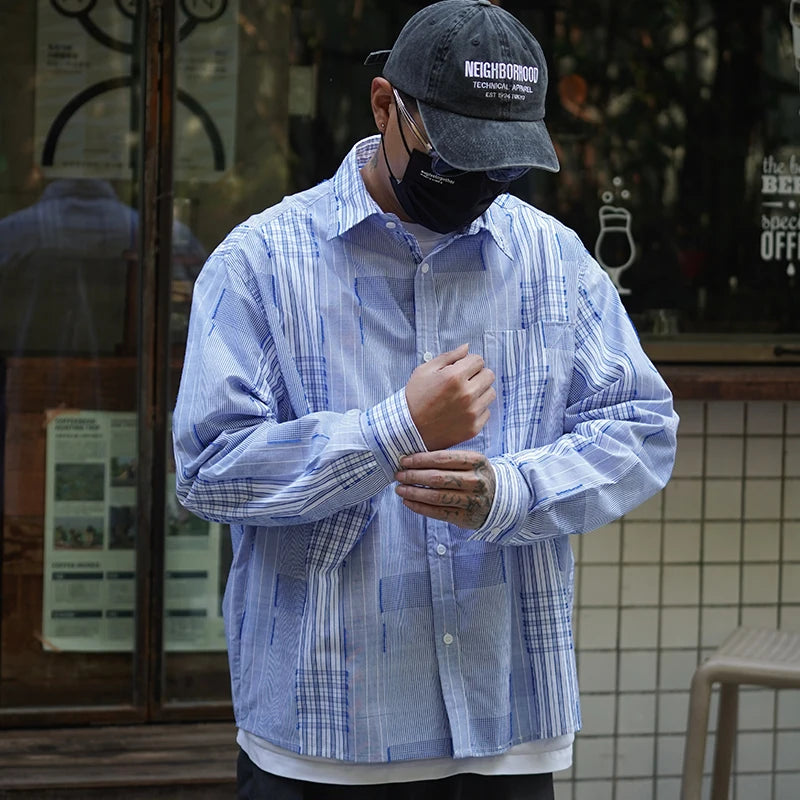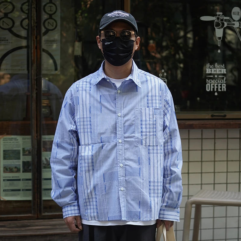 Spring New Japan fashion Retro Patchwork Plaid Long sleeve Shirts All-Matching Men's Shirt Casual Outerwear
