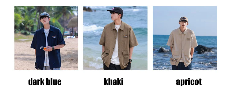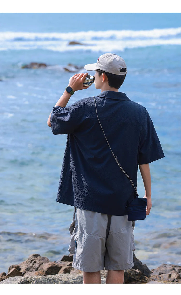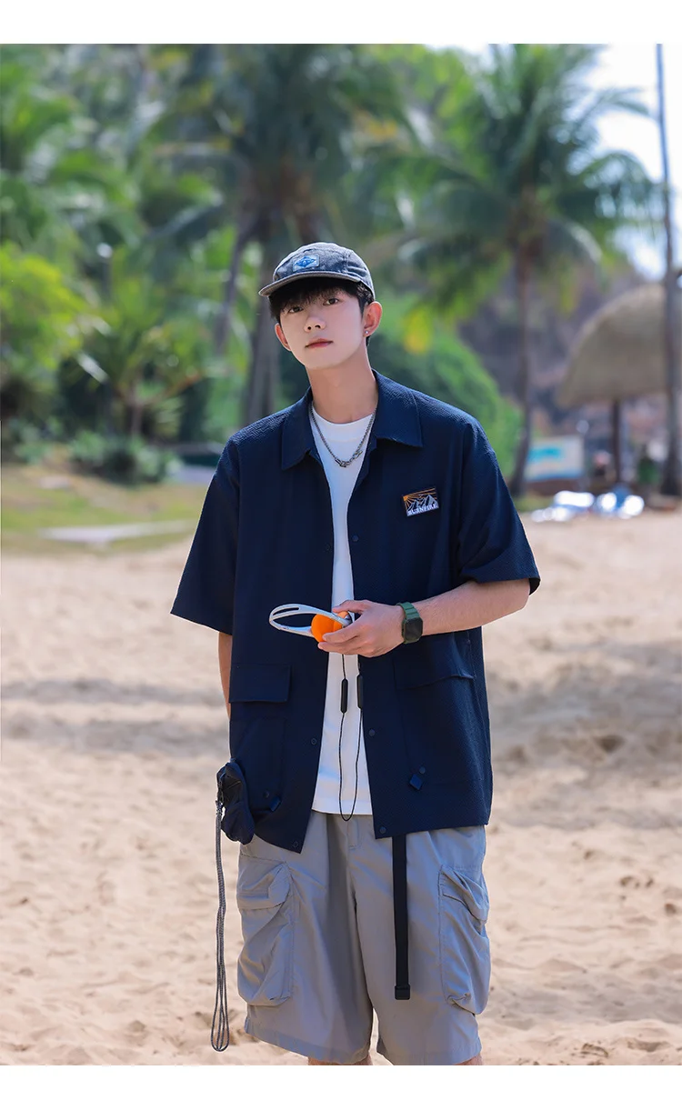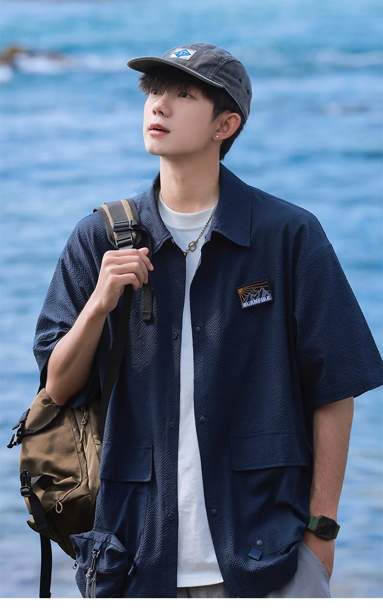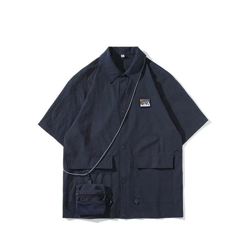 Summer Lapel Retro All-Match Shirt Men Big Pocket Design Versatile Shirts Loose Suit Solid Color Half-Sleeve High Quality Blouse
