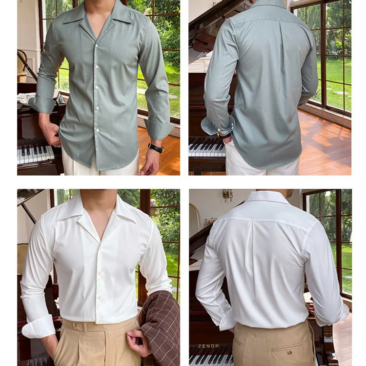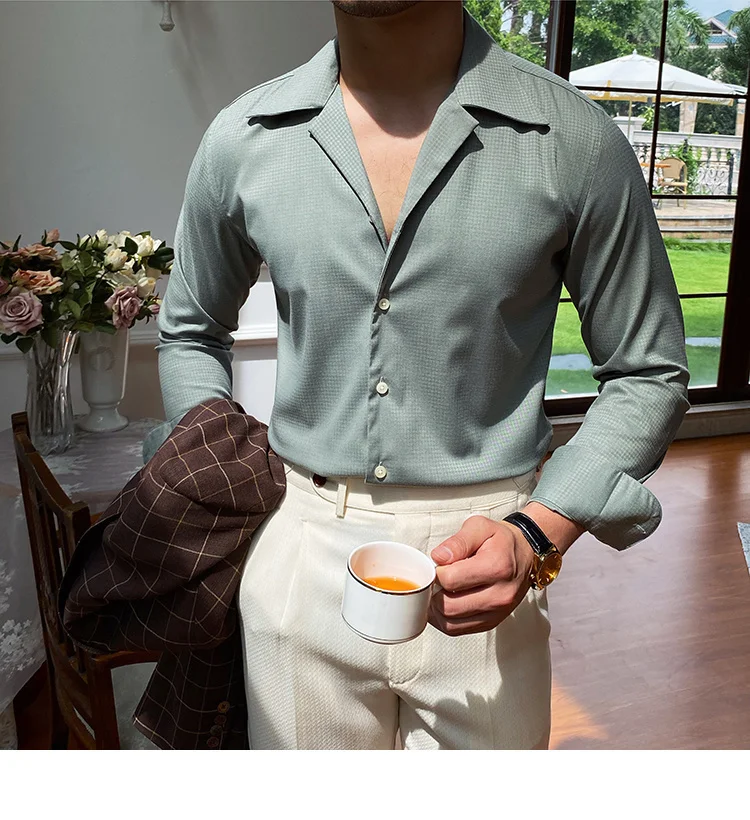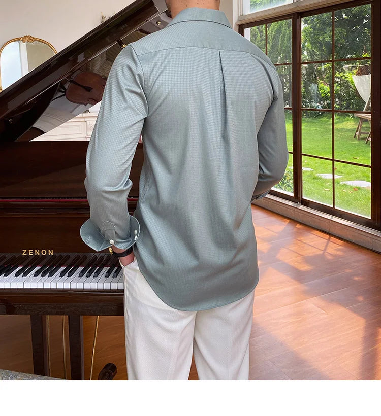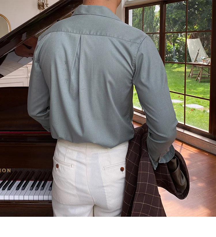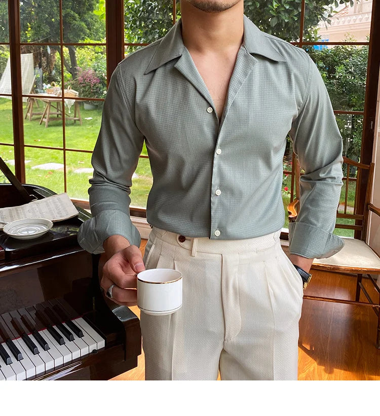 Summer Wrinkle Resistant Bird Check Dark Check Cuban Collar Shirt Men Business Shirt British Shirt Trend Men Shirt Tuxedo Shirt