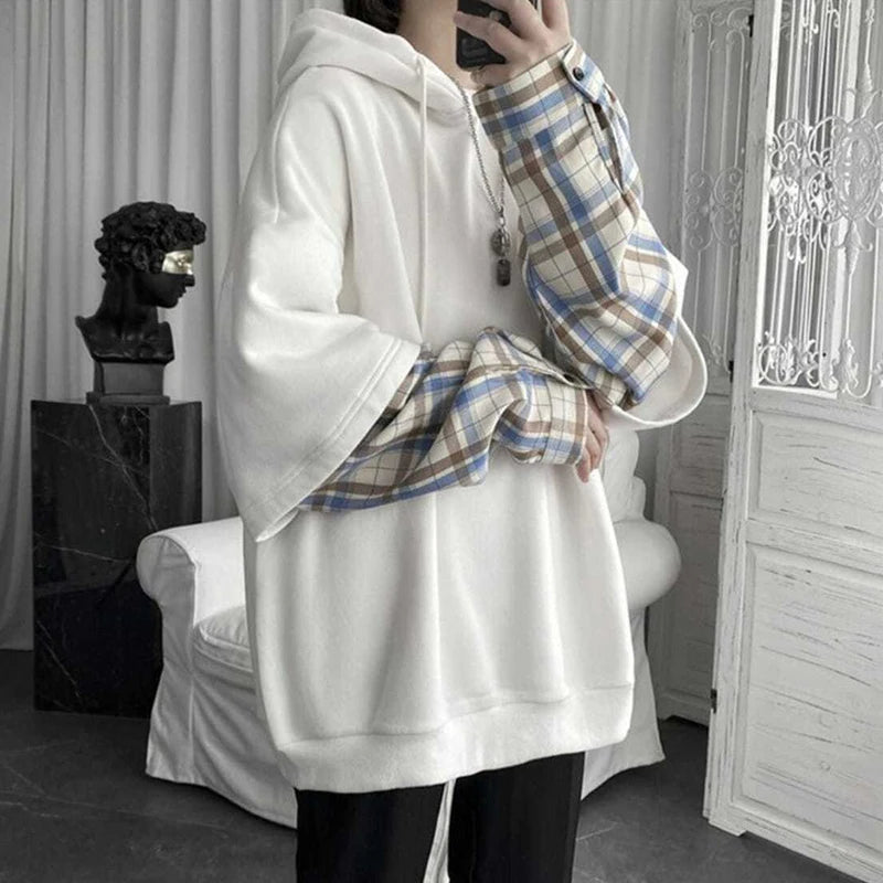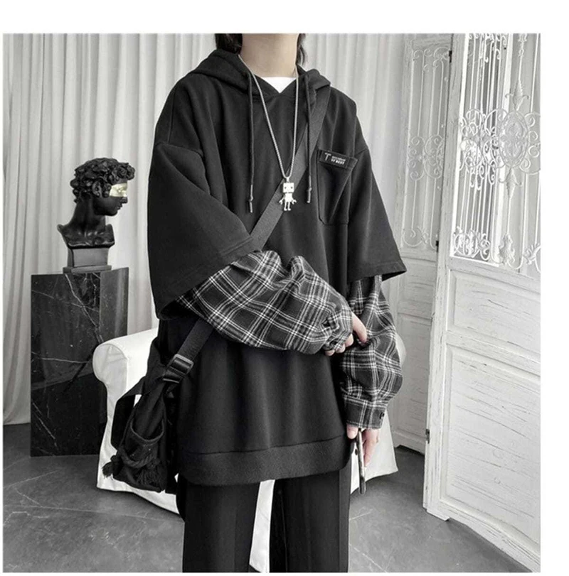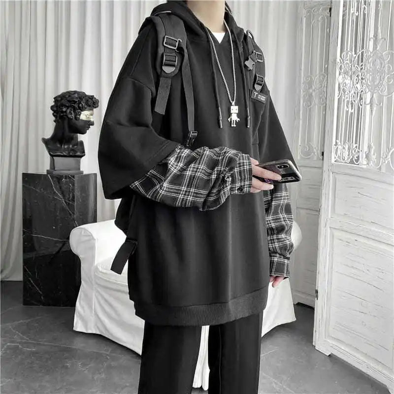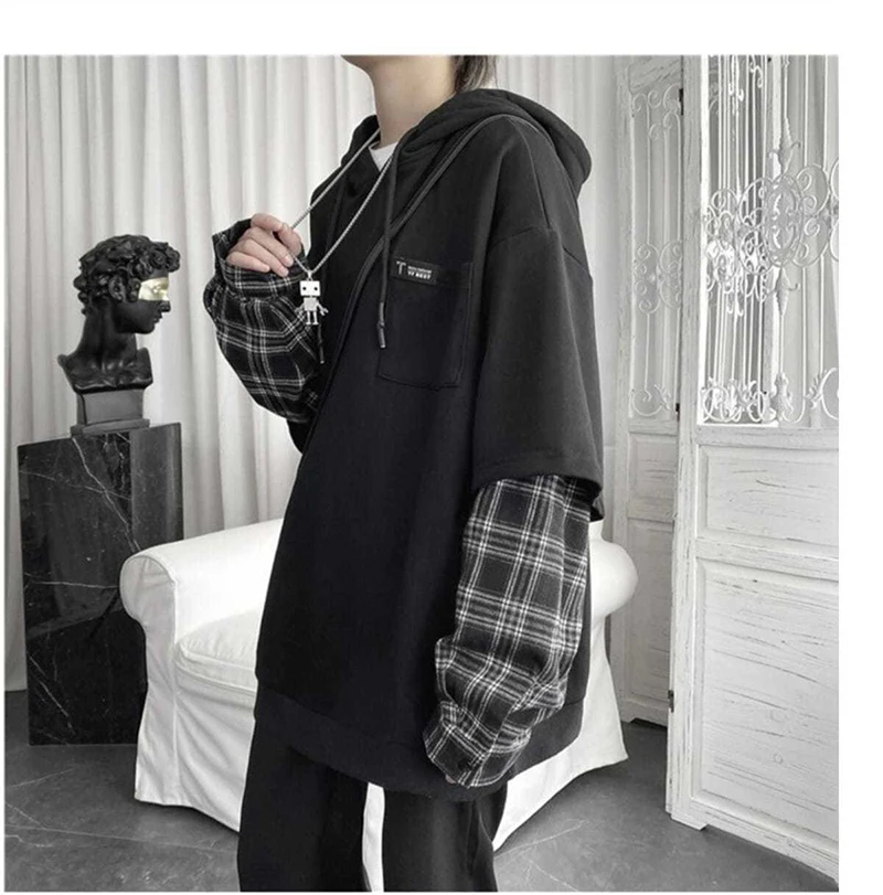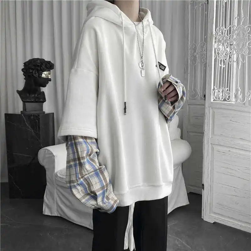 Fake Two Piece Plaid Patchwork Black White Oversize Harajuku Korean Fashion Casual Hoodie Long Sleeve Autumn Men Sweatshirt