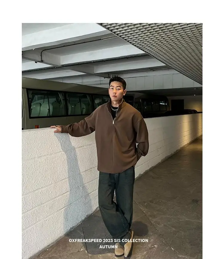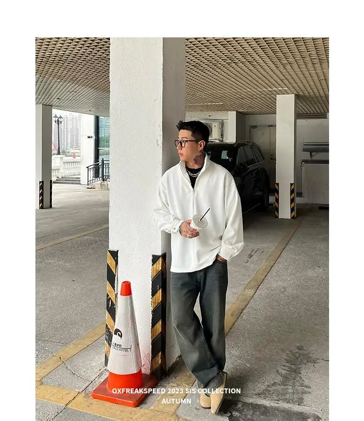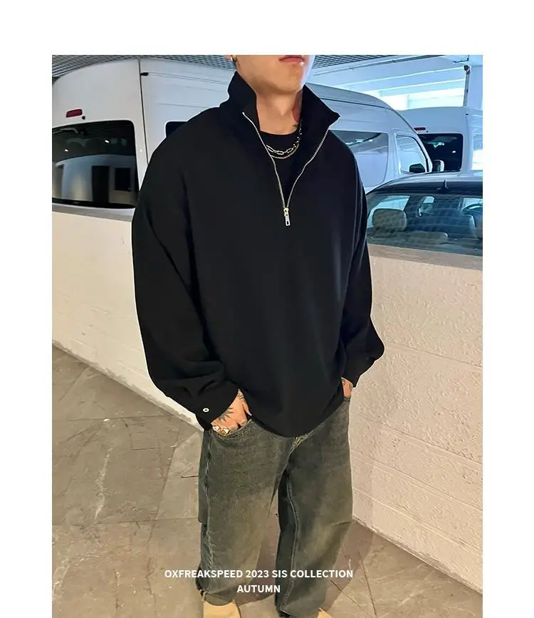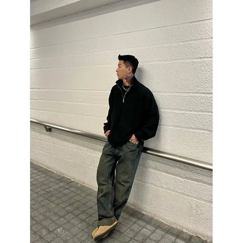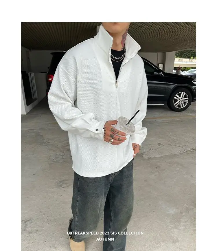 AIDASE - Ribbed Textured Fabric Semi-Zip Hoodie with Loose Shoulders