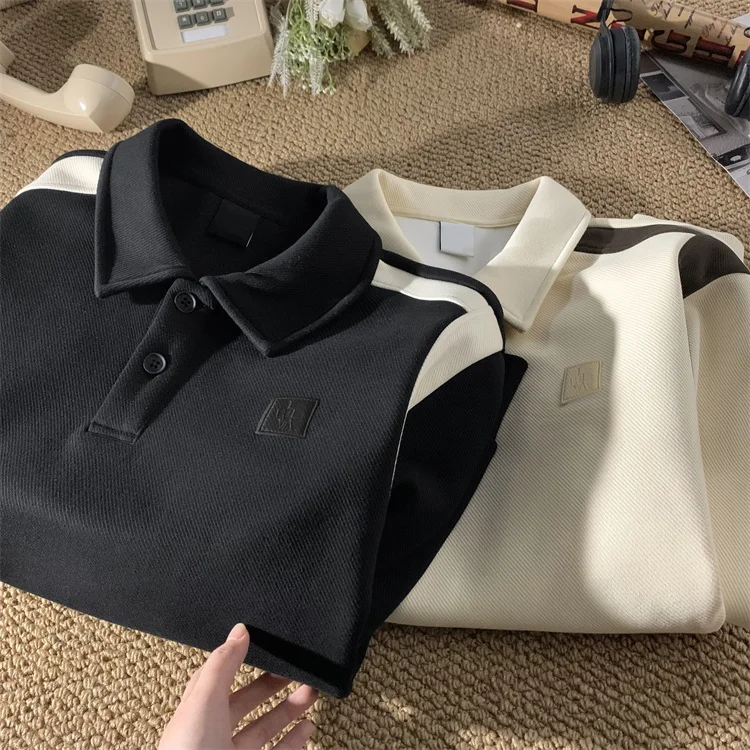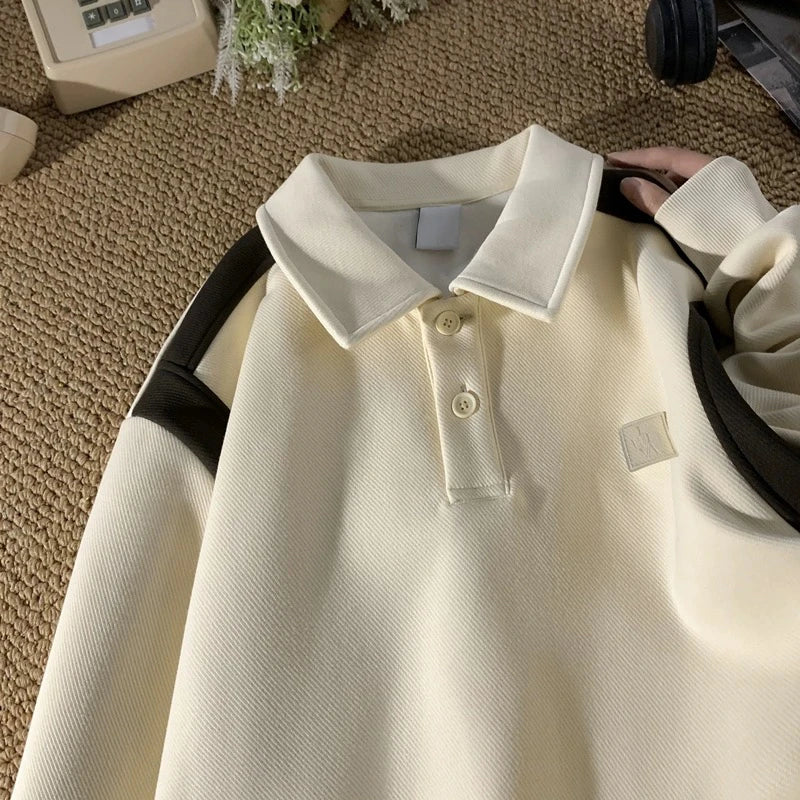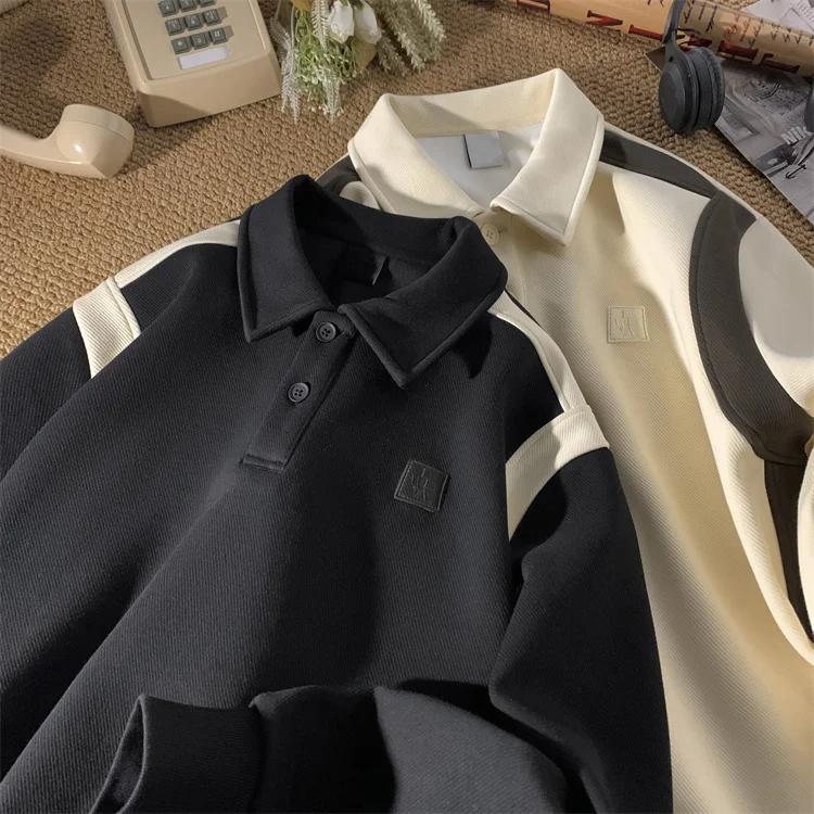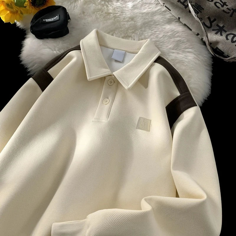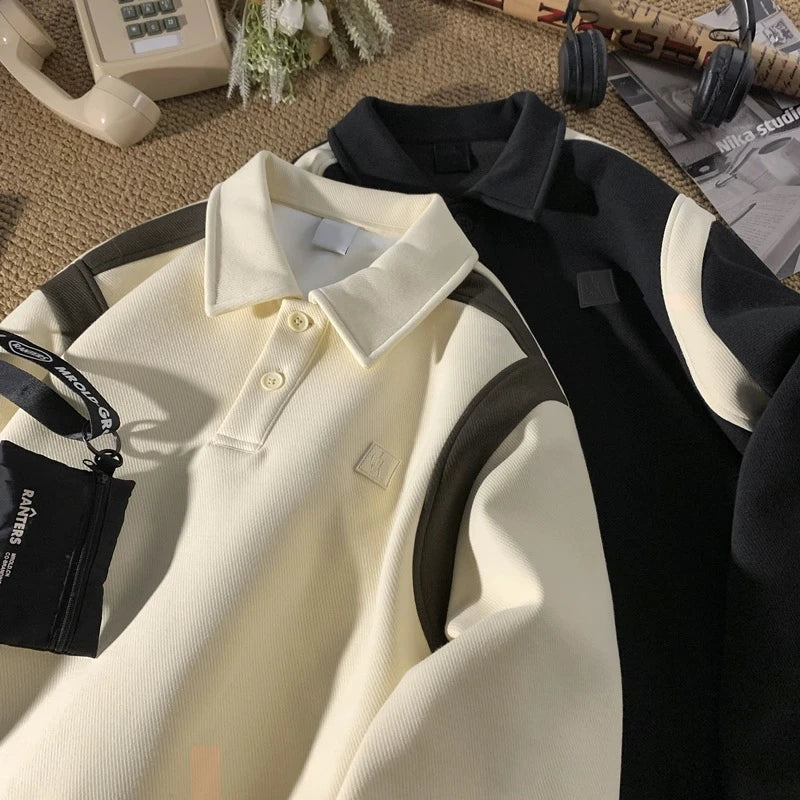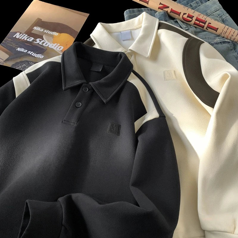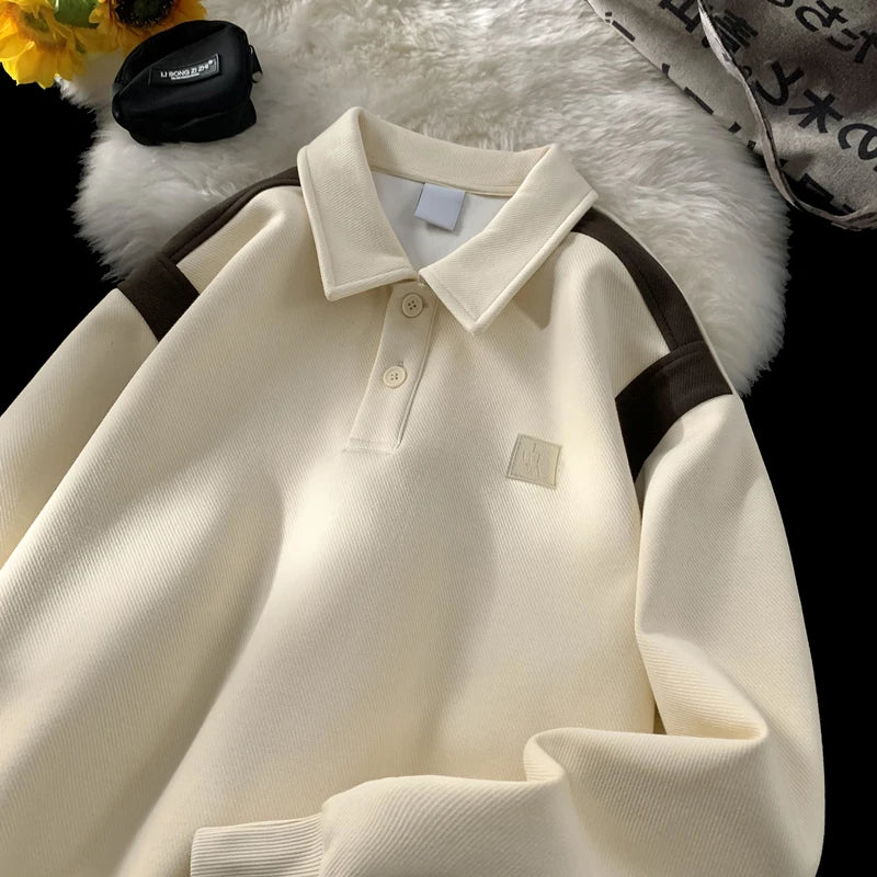 Aidase Simple Label Polo Neck Sweatshirt Youthful Energetic Sweatshirt Color Blocking Long Sleeve Top Loose Casual Pullover Sweatshirts