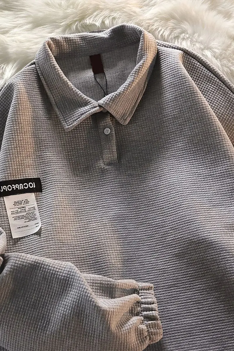 Waffle Grey Sweatshirt Men Korean Harajuku Patchwork Hoodies Autumn Pullover Casual Sweatshirts Turndown Collar Clothing