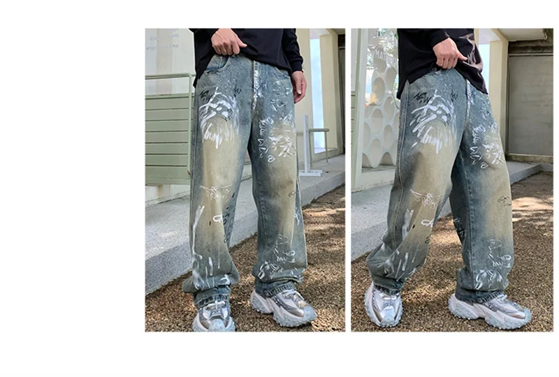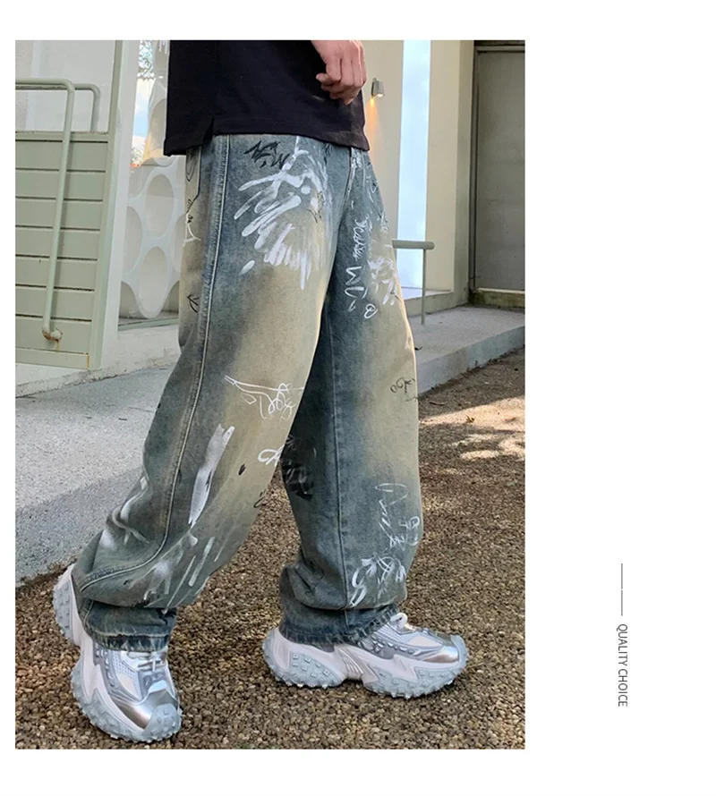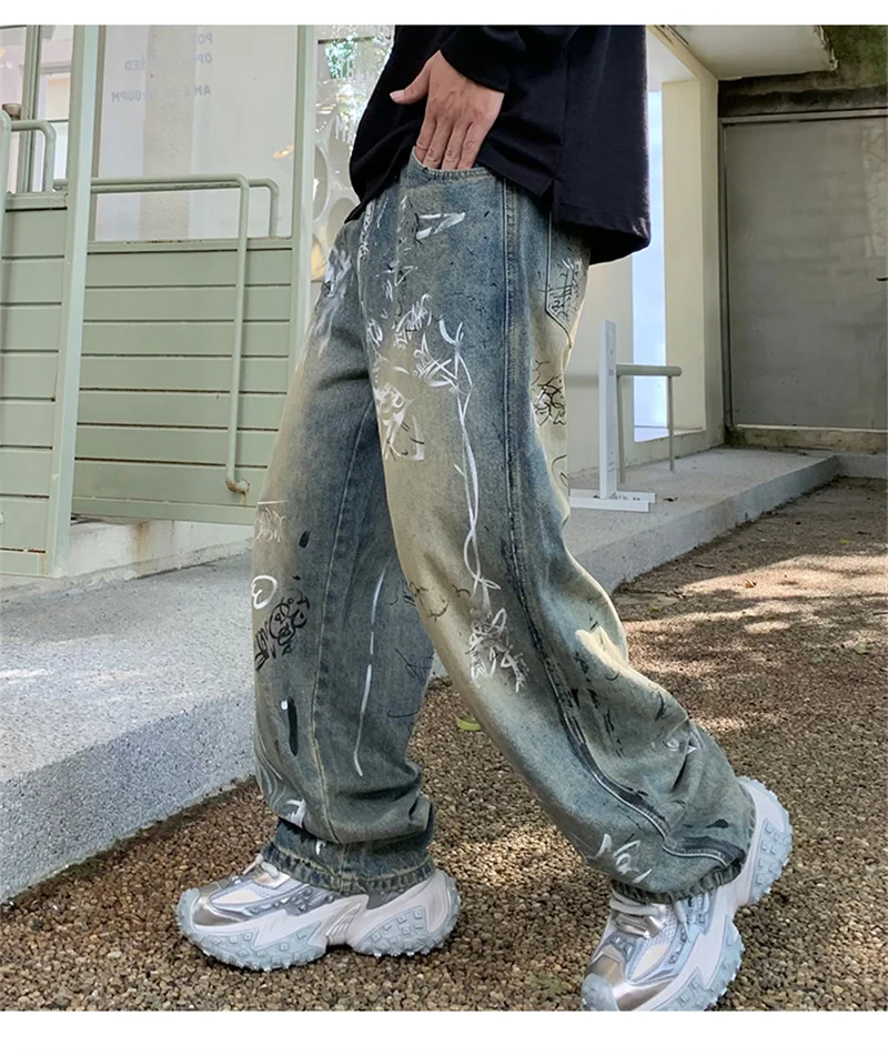 Aidase Men's Y2K Graffiti Printed Baggy Jeans New Vintage Distressed Blue Harajuku Denim Pants High Street Straight-leg Jean Trousers