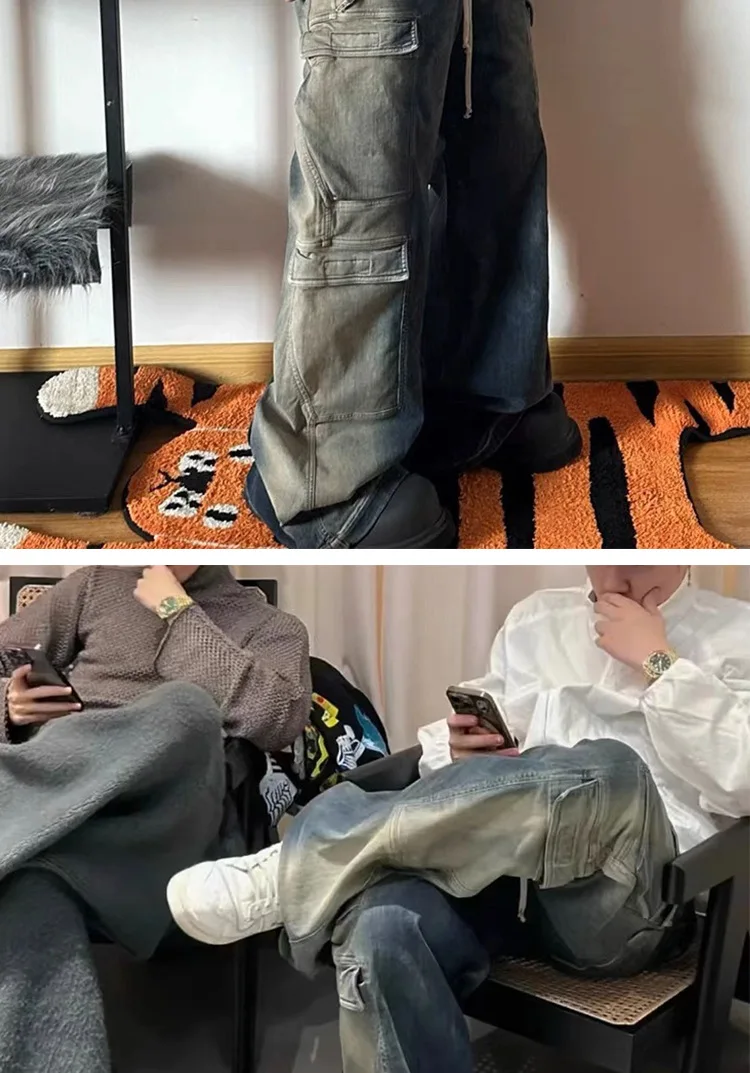 Aidase American Fashion Washed Old Gradient Stripe Multi Pocket Drawstring Jeans Men Harajuku Street Loose Denim Pants