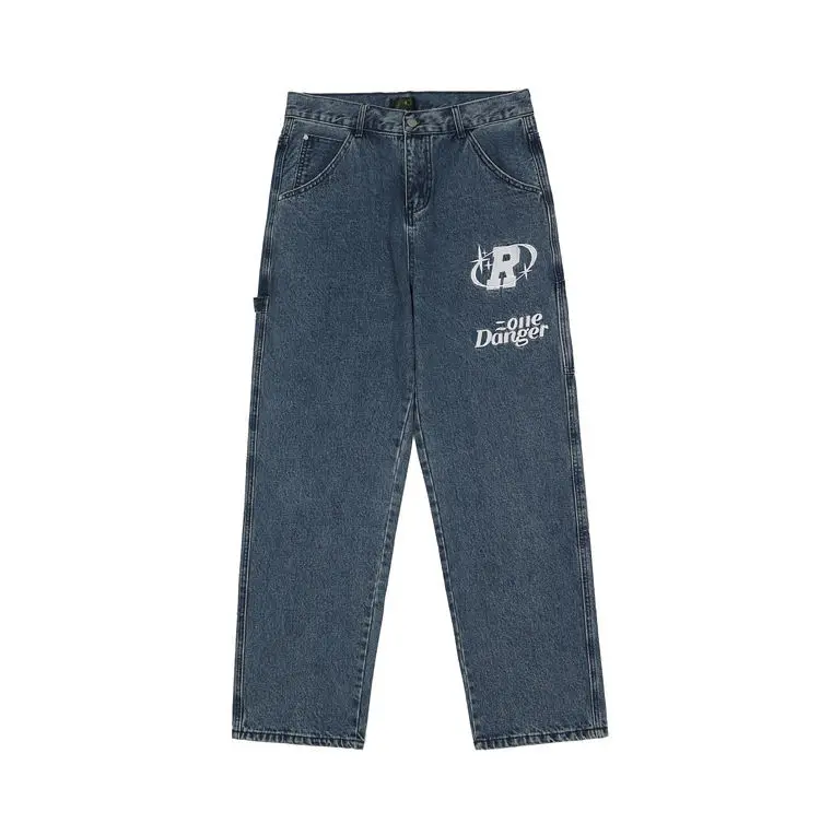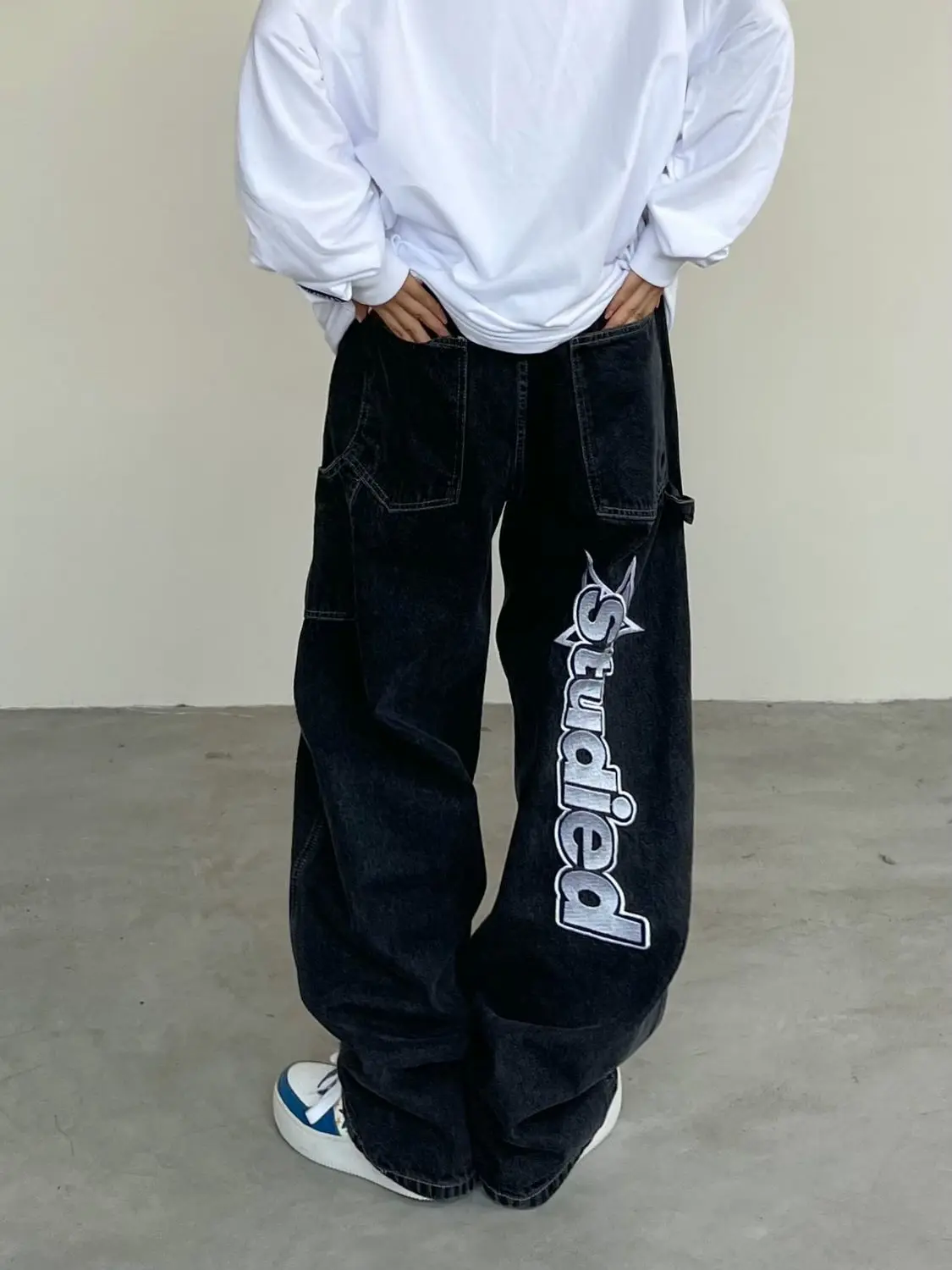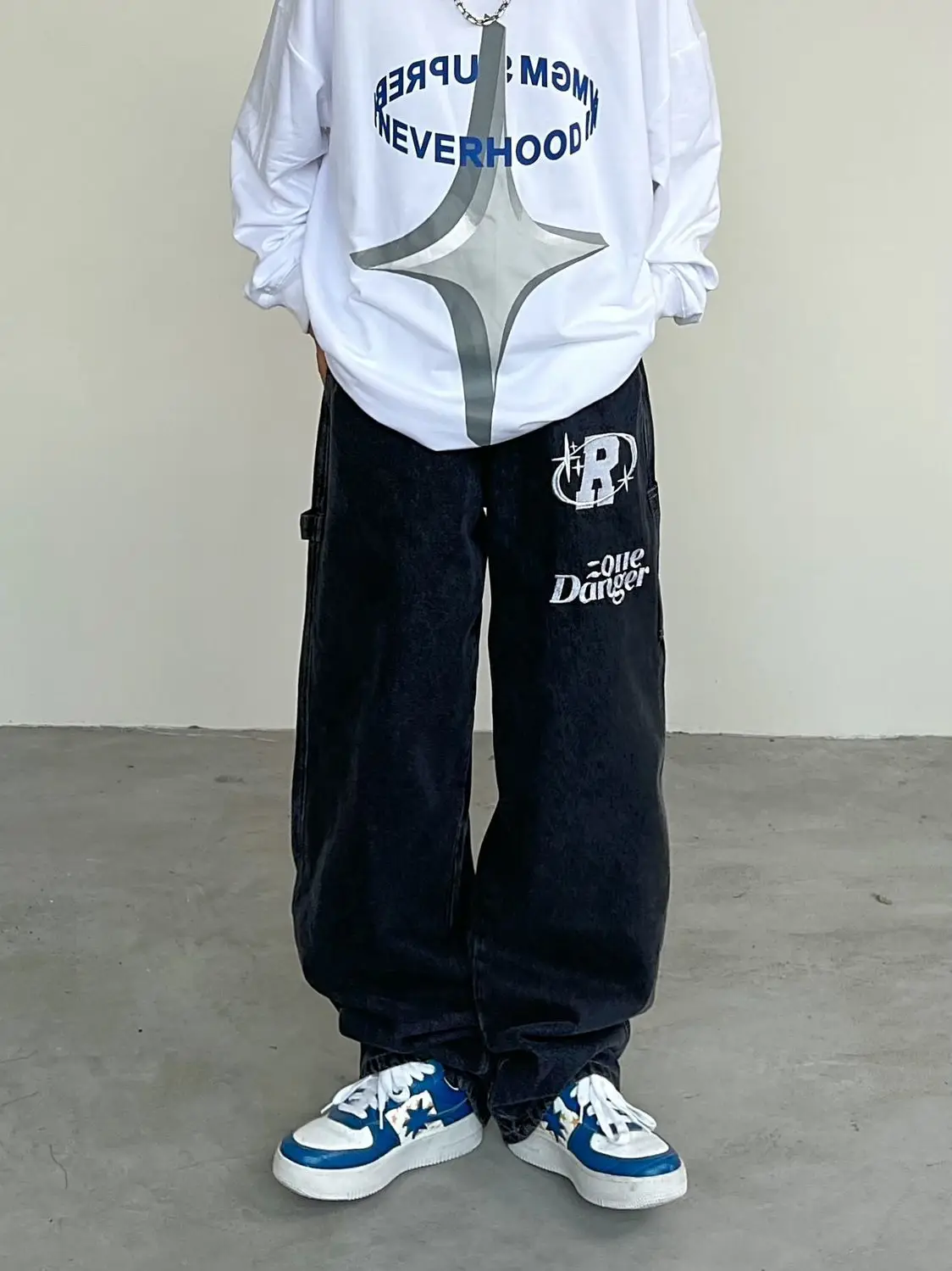 AIDASE  -  American Retro Letter Printed Jeans Men's Fashion Loose Straight Wide Leg Pants High Street Casual Trousers Punk Baggy Pants