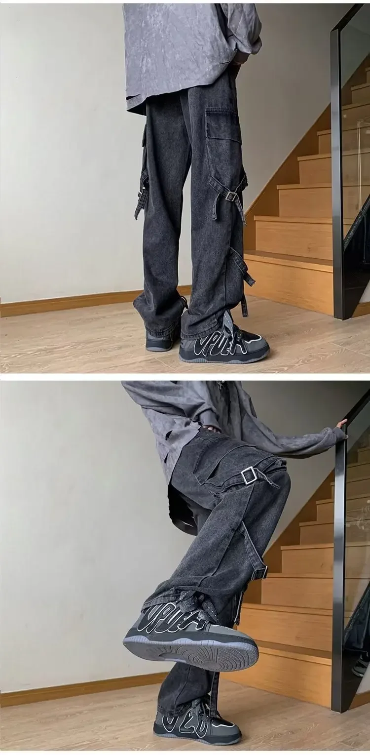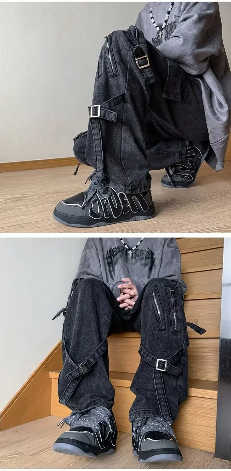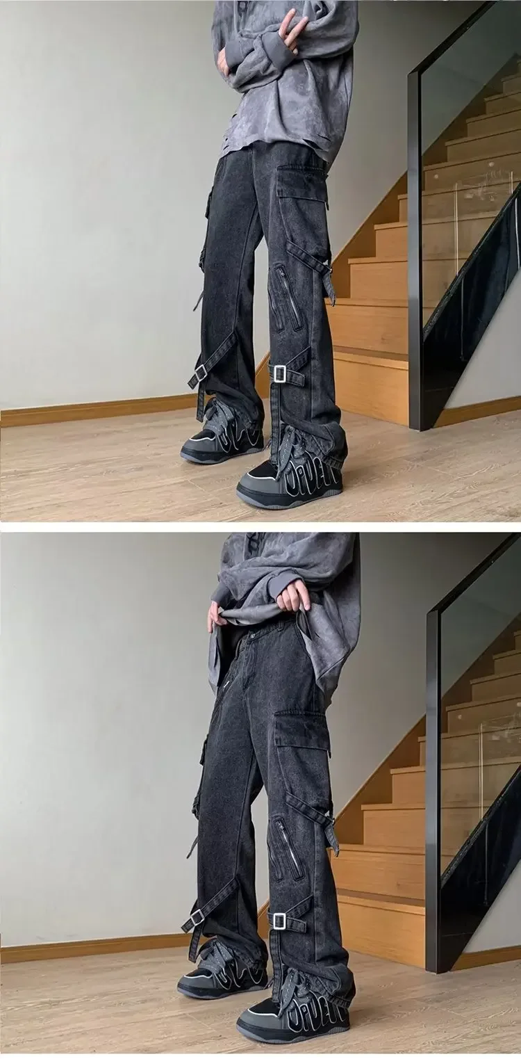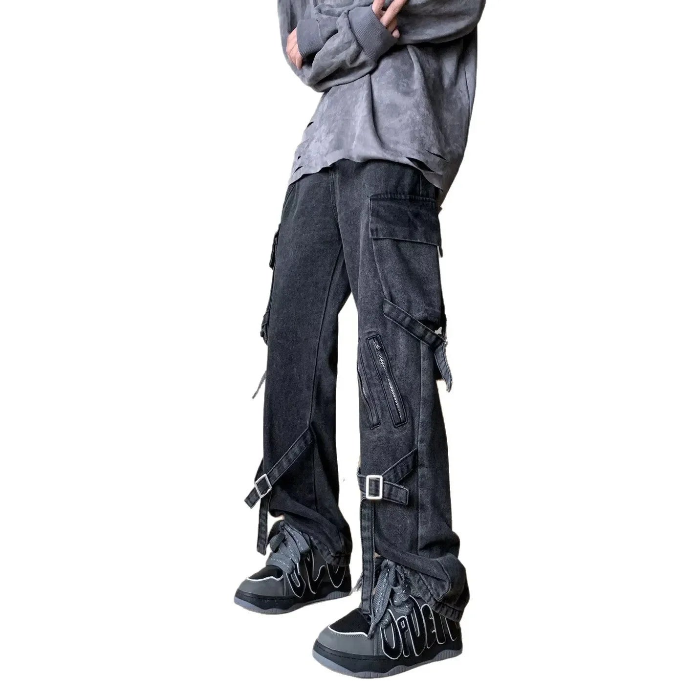 AIDASE - American Vibe Zipper Belted Men's Jeans High Street Cool Loose Workwear Wide Leg Pants Street Style Fashionable Cargo Trousers