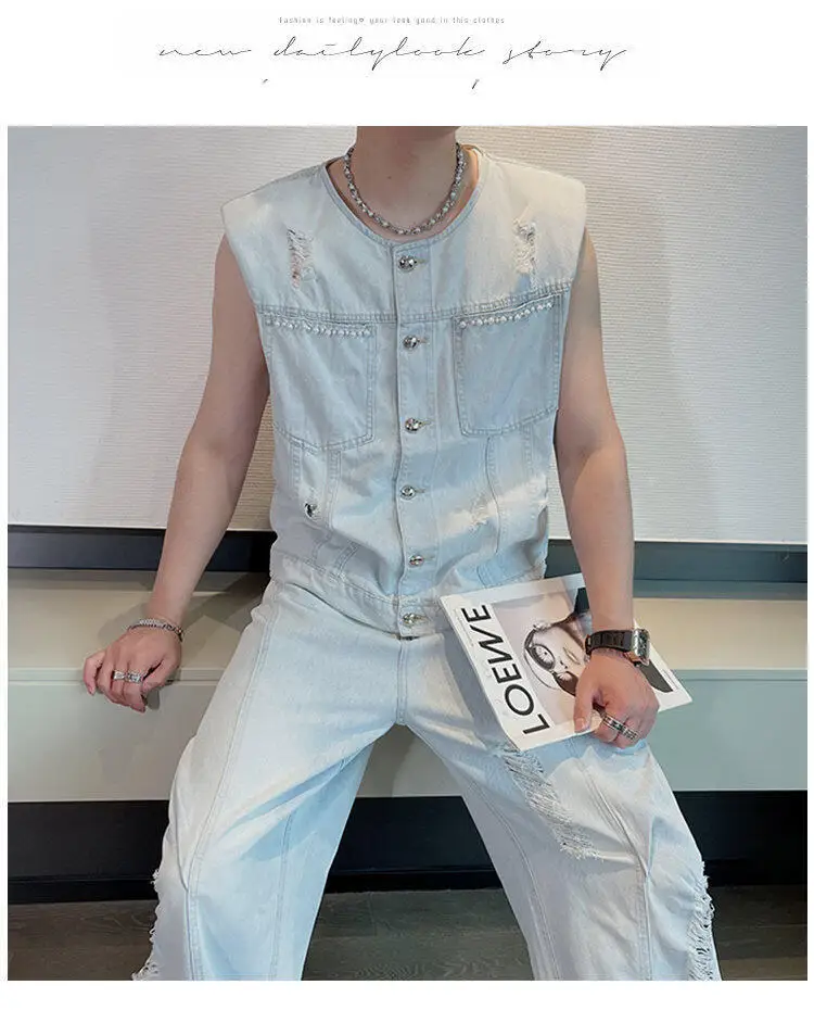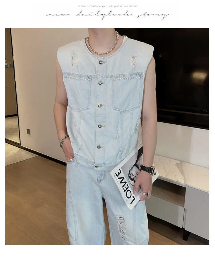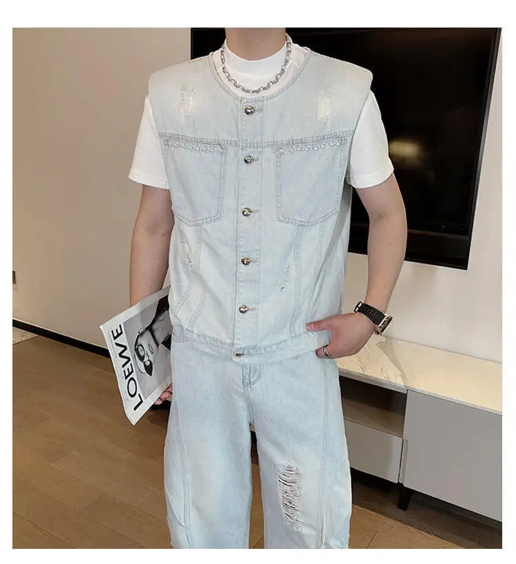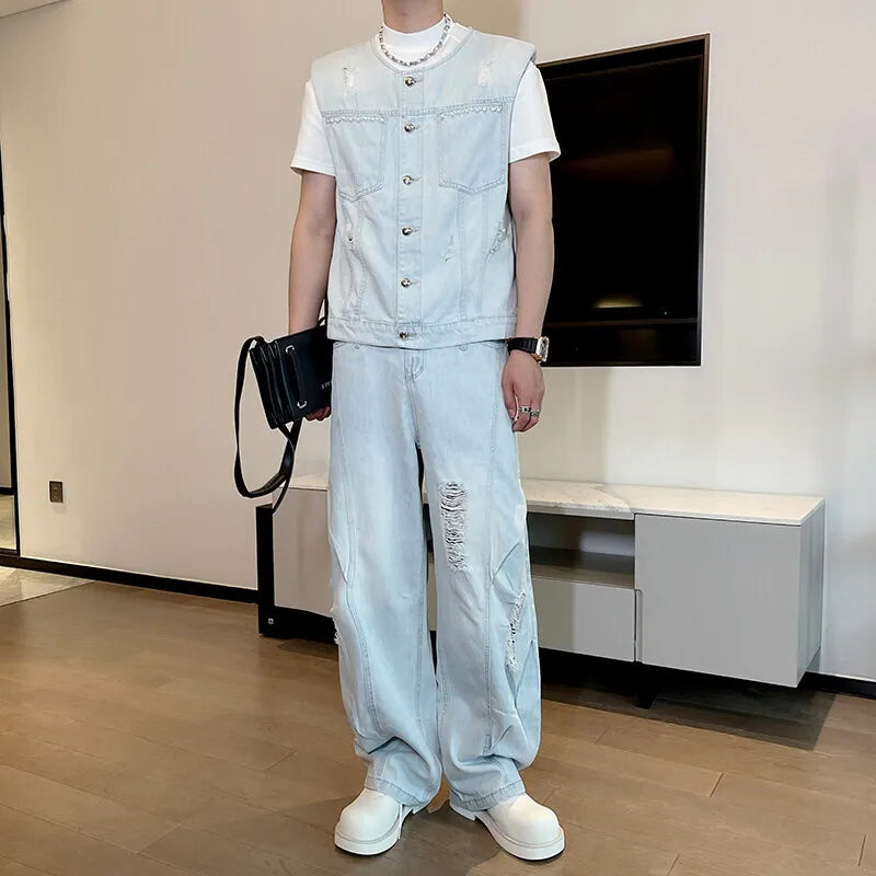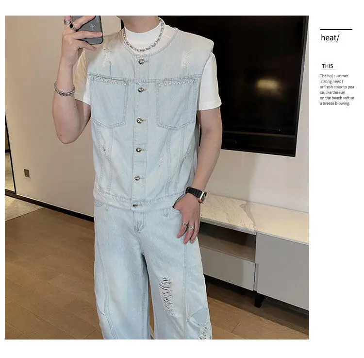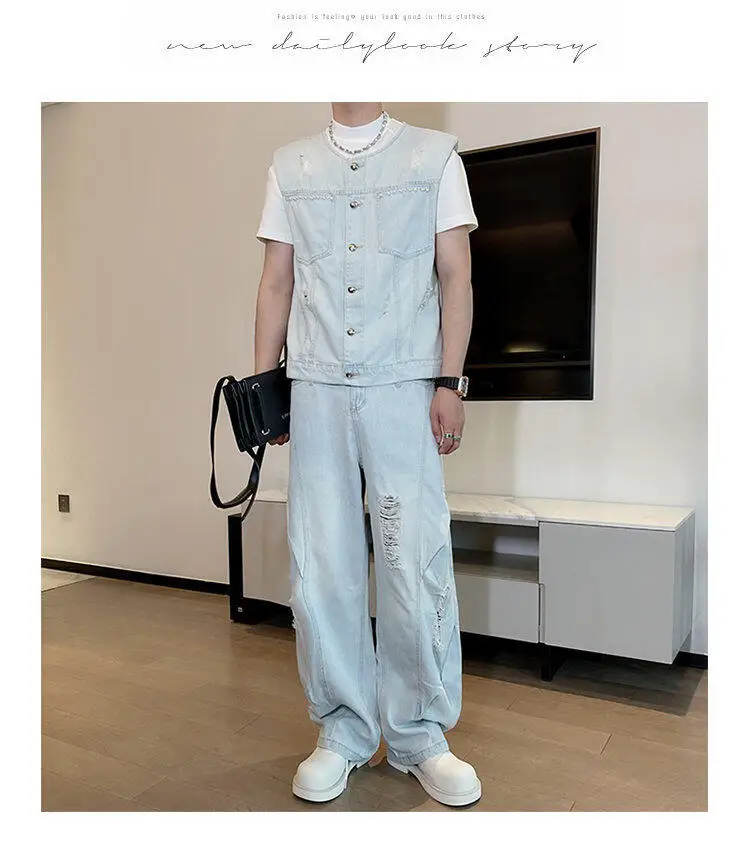 AIDASE - Denim Men's Sets Round Collar Solid Color Holes Design Single Breasted Sleeveless Vests Pleated Loose Male Jeans New 9W3269