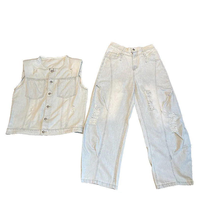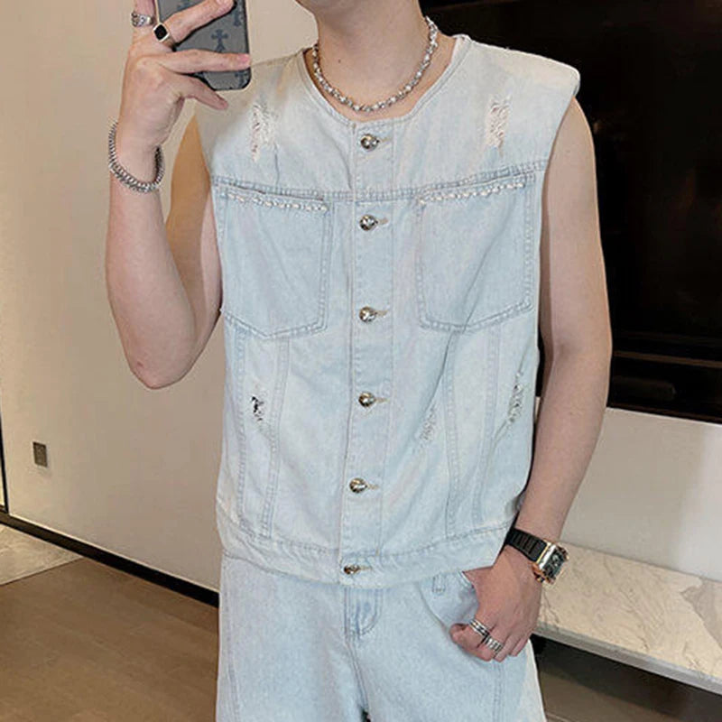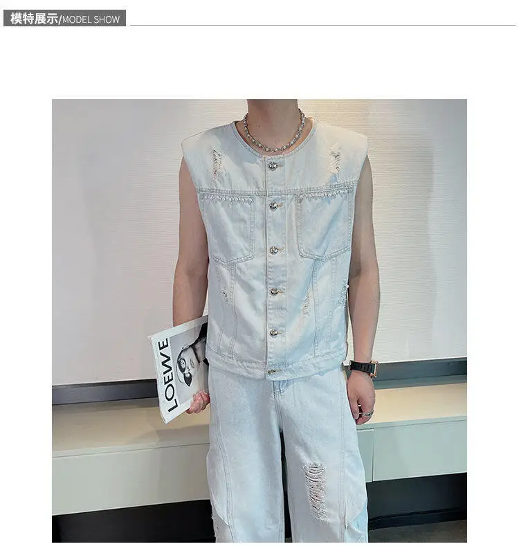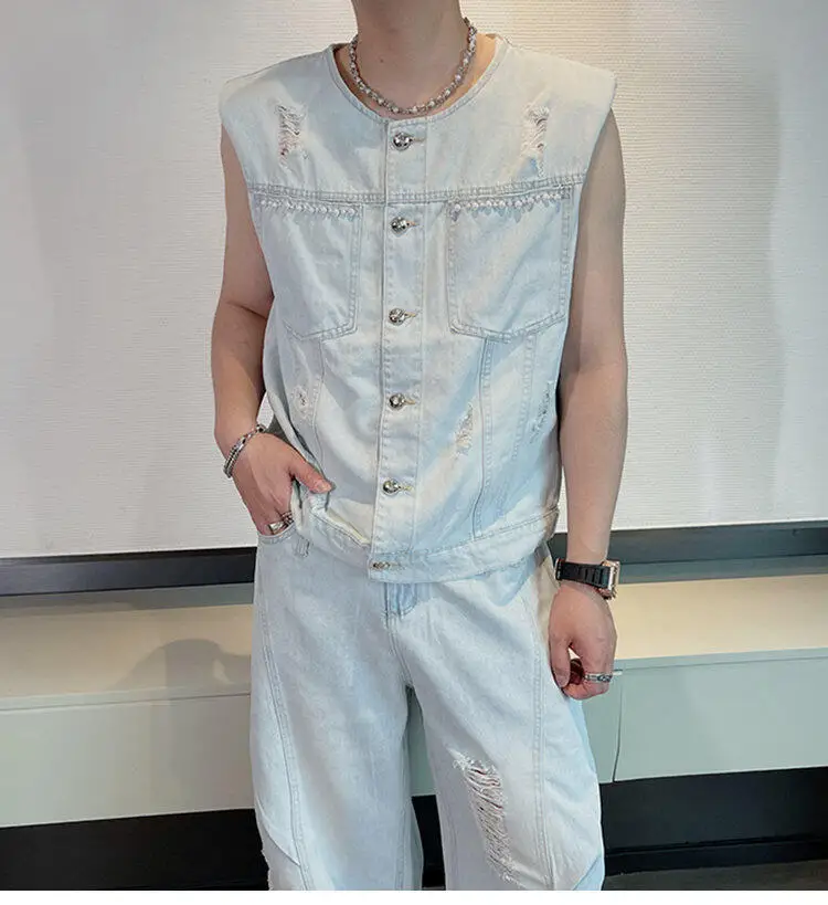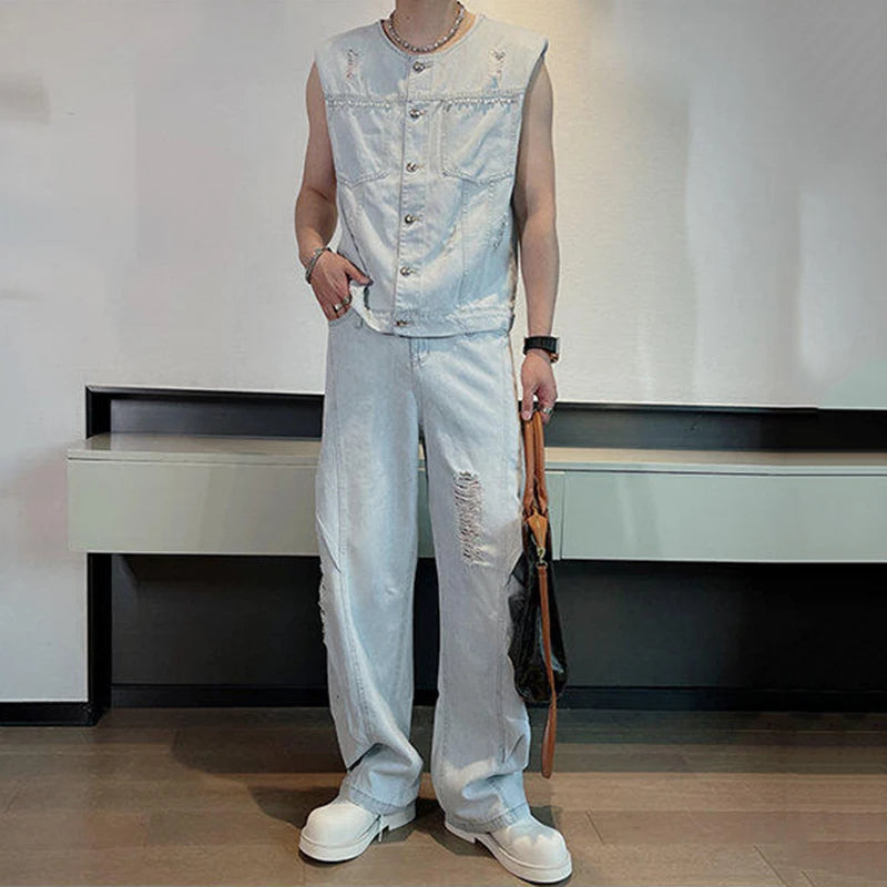 AIDASE - Denim Men's Sets Round Collar Solid Color Holes Design Single Breasted Sleeveless Vests Pleated Loose Male Jeans New 9W3269
