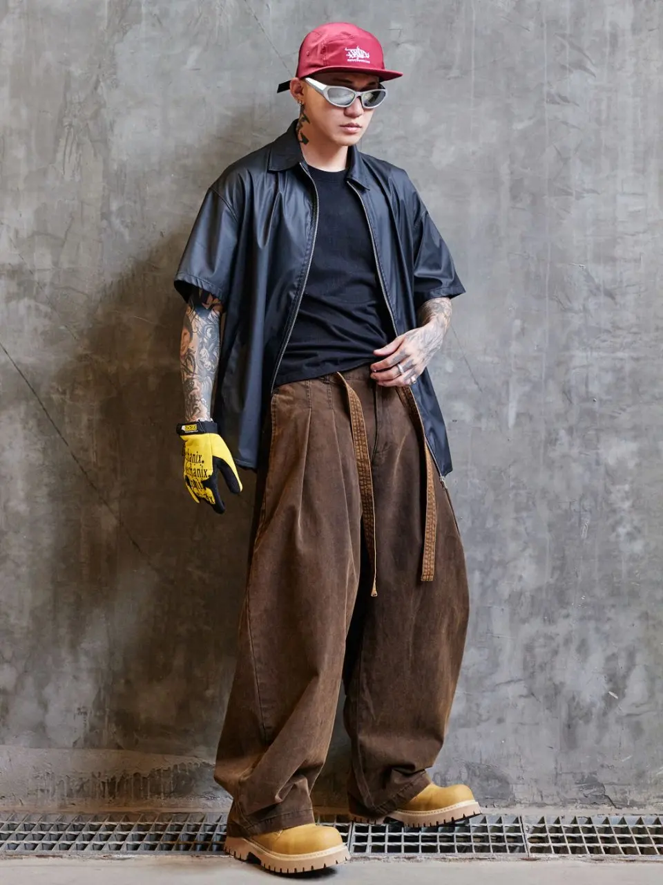 AIDASE  -  Distressed Wash Brown Denim Bending Knife Pants Jeans Men Streetwear Fashion Hip Hop Loose Casual Oversize Wide Leg Baggy Jeans