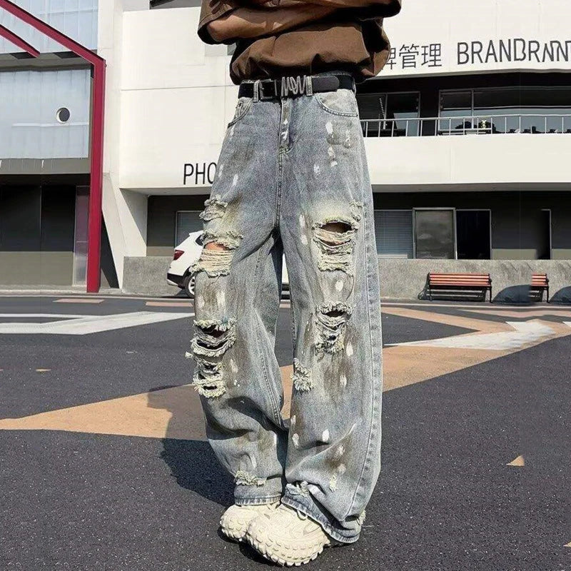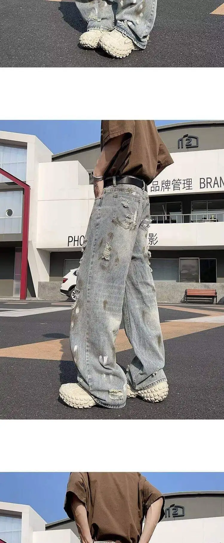 AIDASE - High Street Men's Ripped Jeans Hip-Hop Personality Straight Wide-Leg Denim Pants Trend Niche Handsome Menswear 21E6345