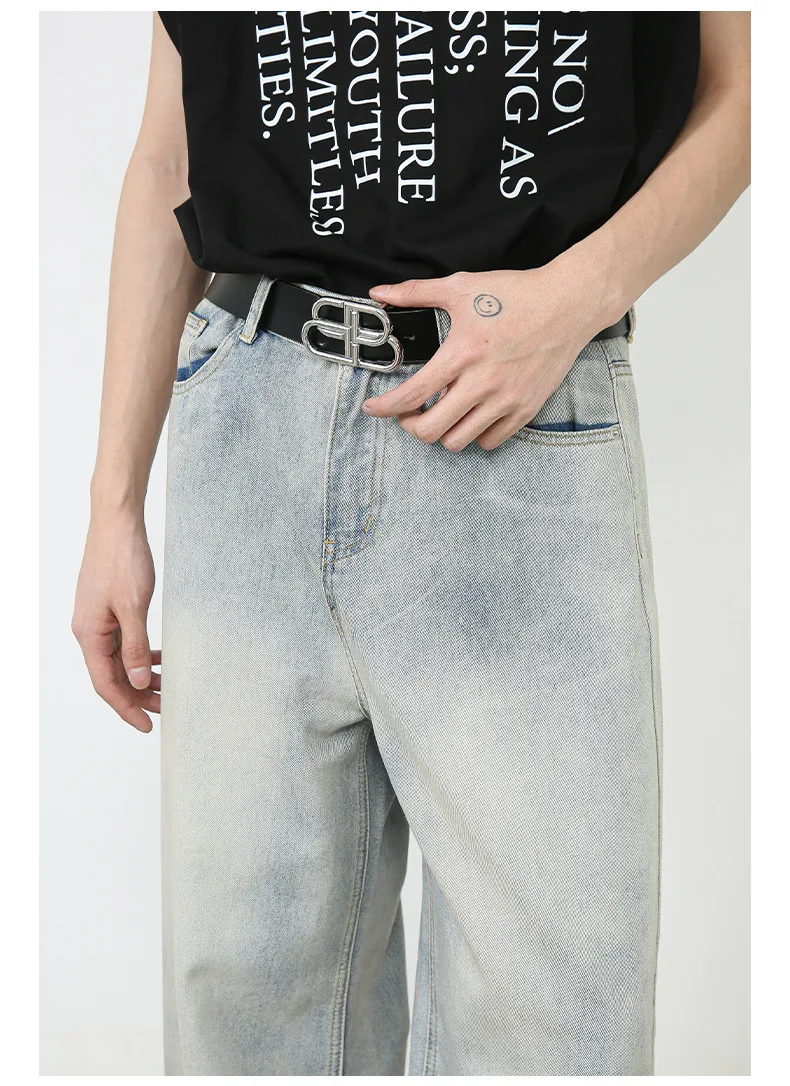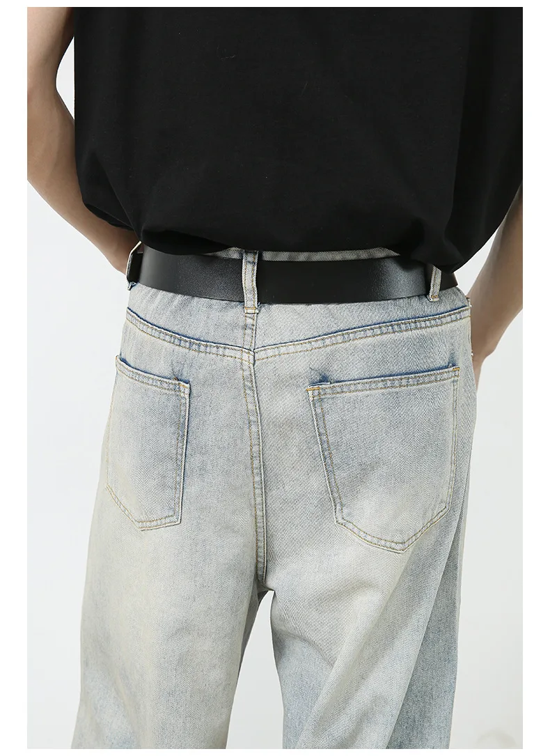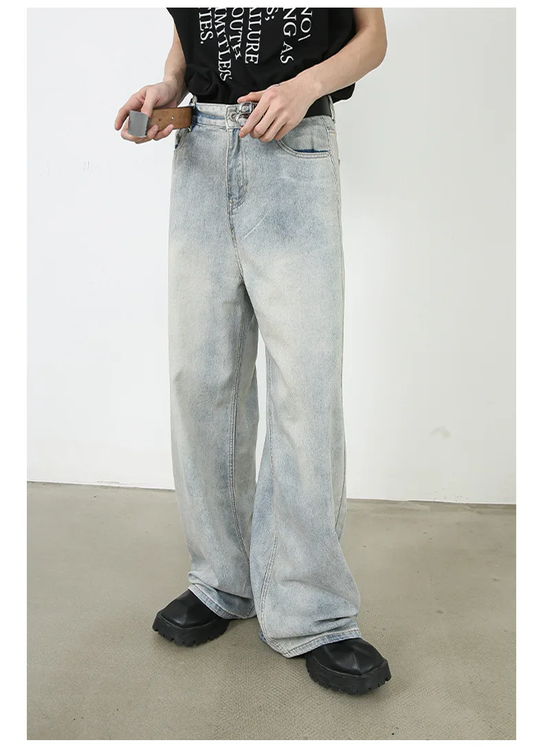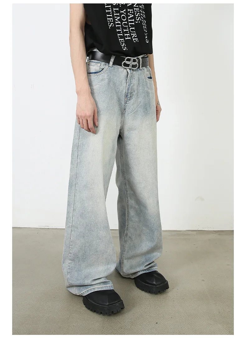 Aidase Korean Style Retro Fashion Distressed Light Blue Jeans Men Zippered Loose Casual Straight Leg Wide Leg Pants