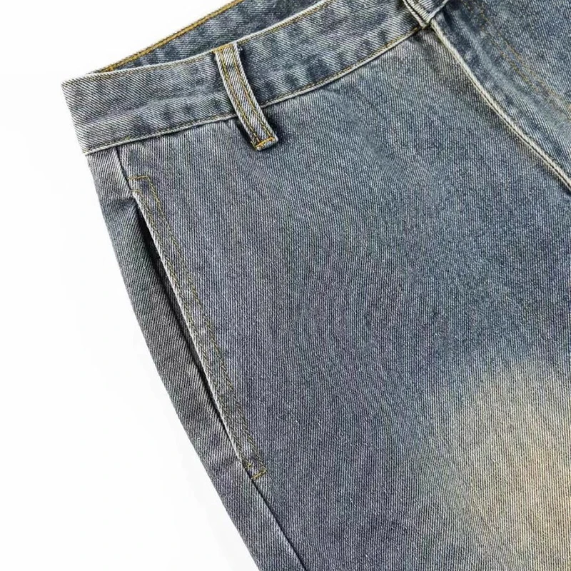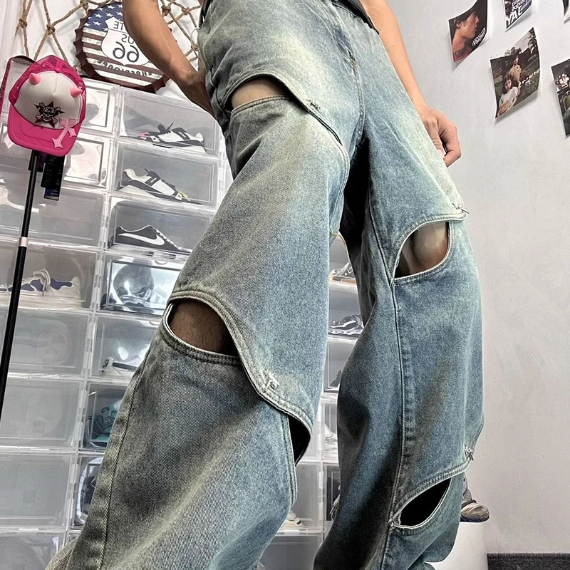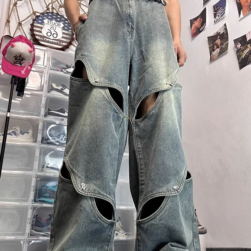 Aidase Niche Deconstructed Metal Button Design Wide-leg Jeans Korean Style Fashion Heavy Industry Hollow Loose Straight Pants Men Chic