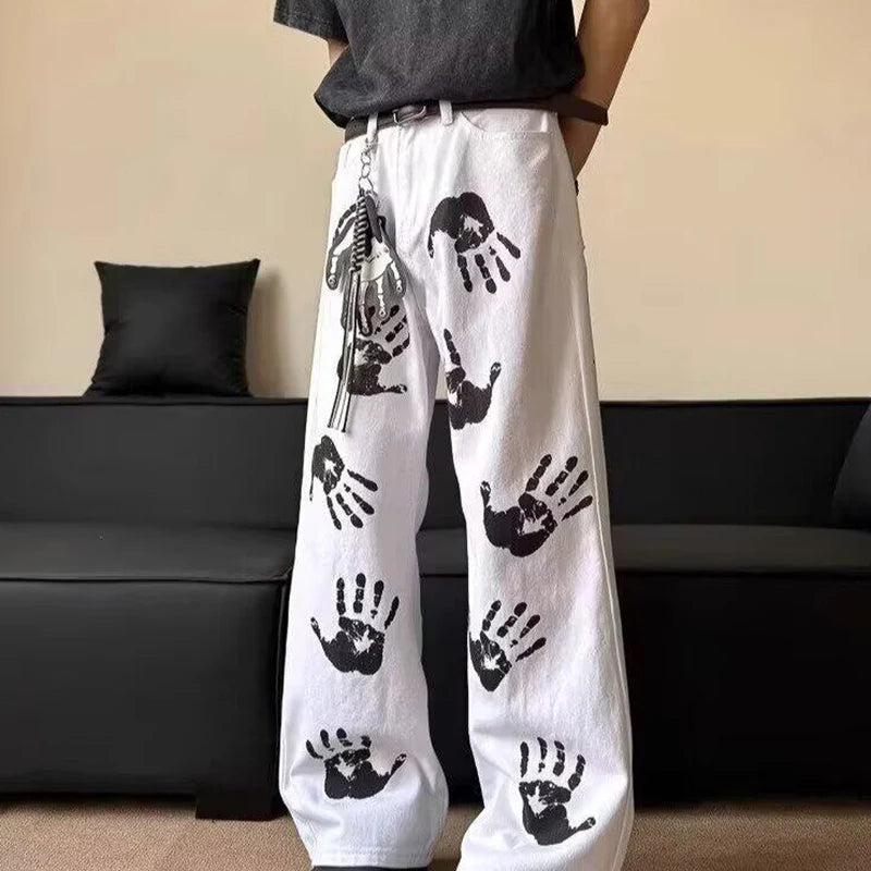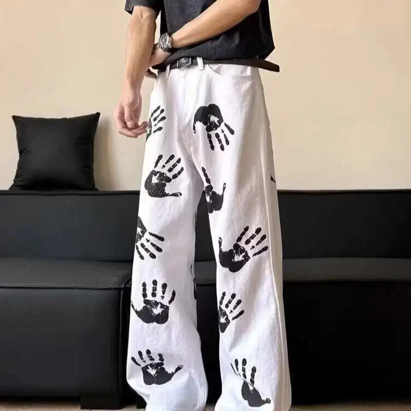 AIDASE - Palm Print Men Jeans American Hip-hop Street Style Handsome Straight Leg Loose Niche Male Trousers Summer New
