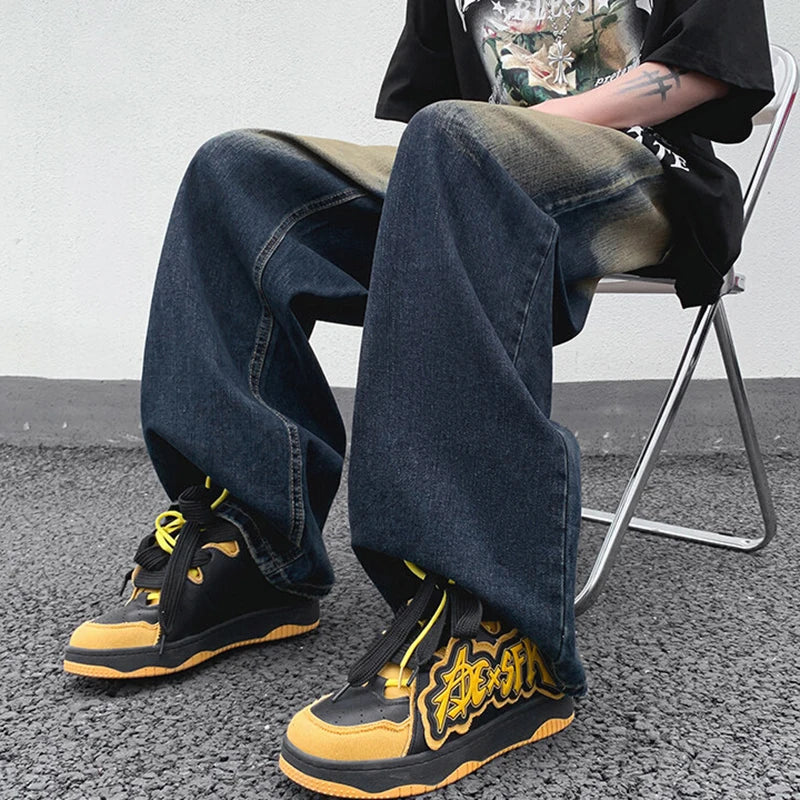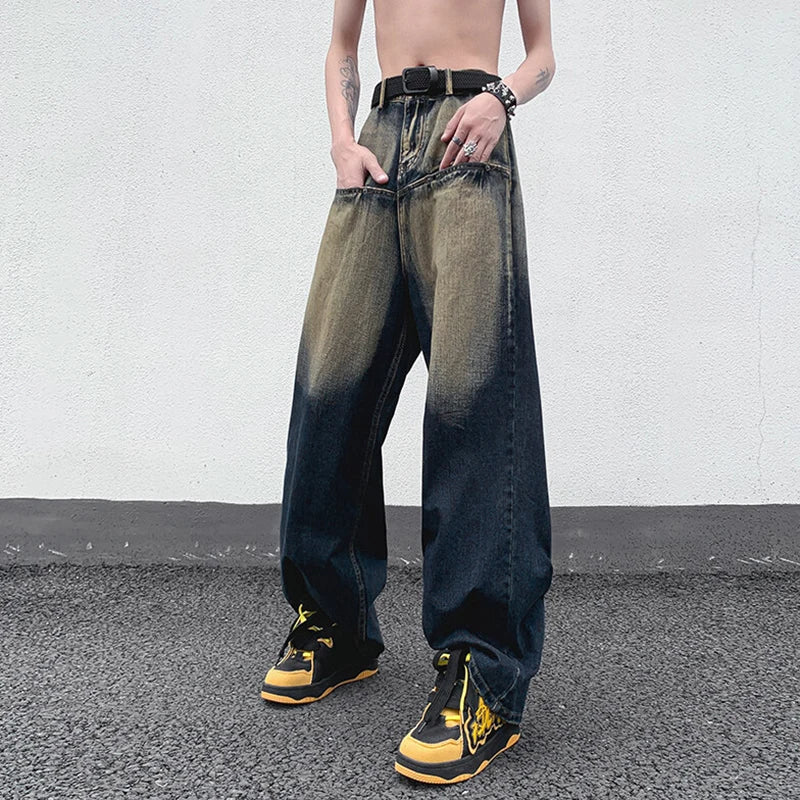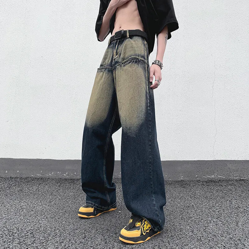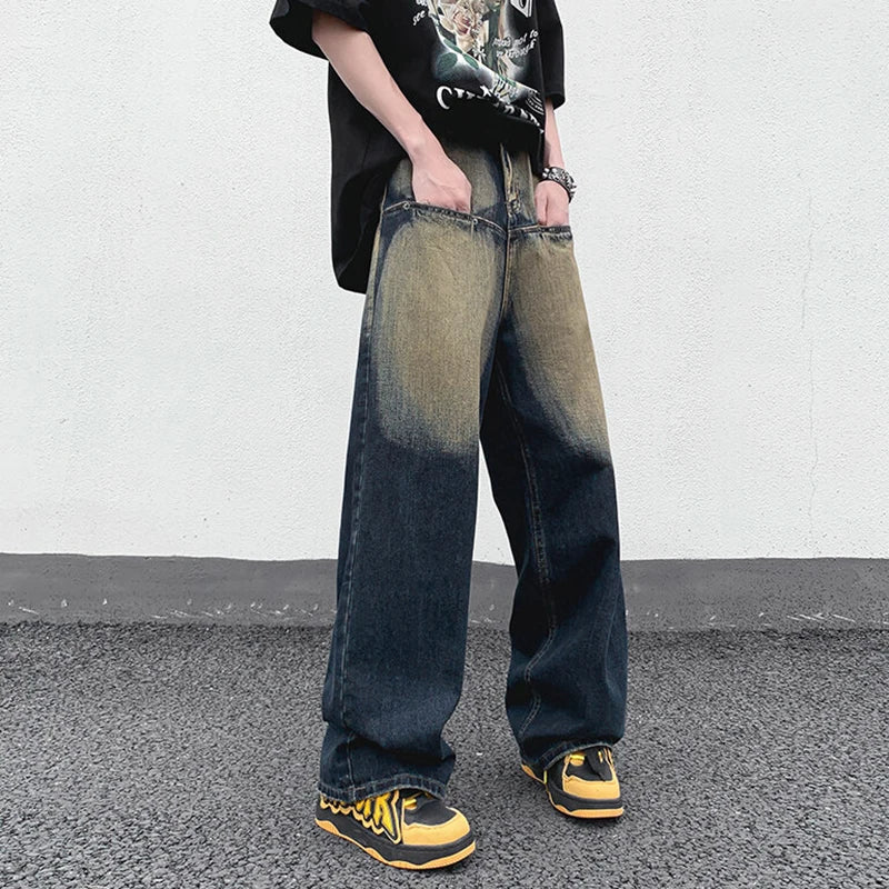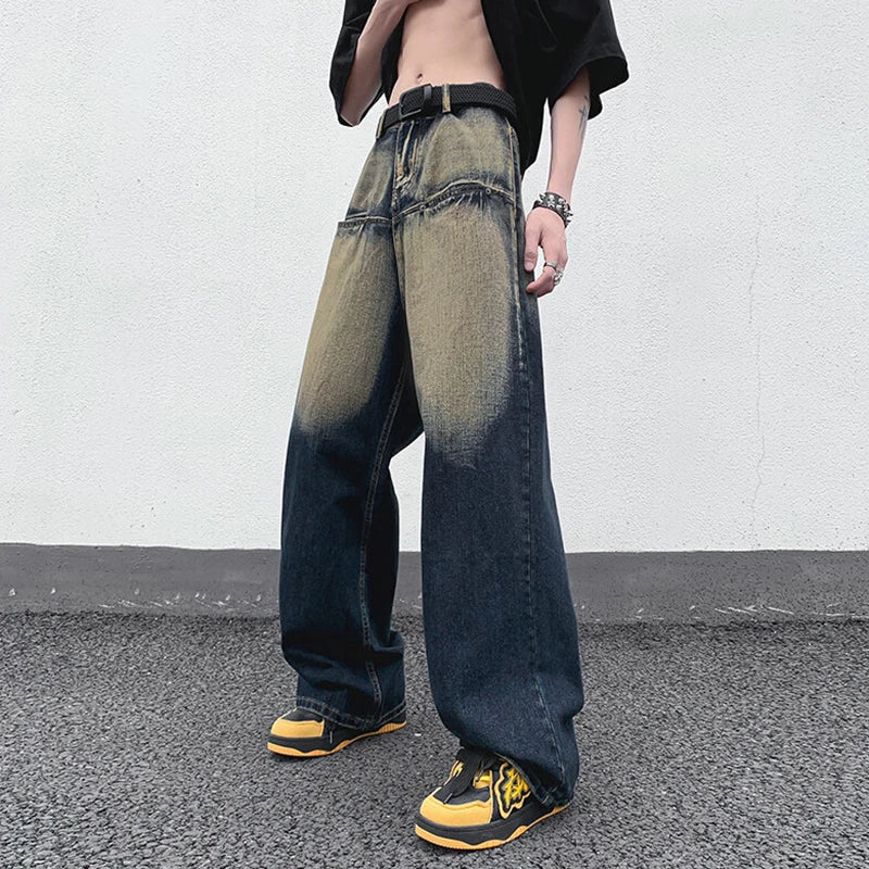AIDASE  -  Straight Leg Trendy Men Jeans American Style Loose Cool Washed Vintage Personality Spliced Design Denim Trousers 21E6535