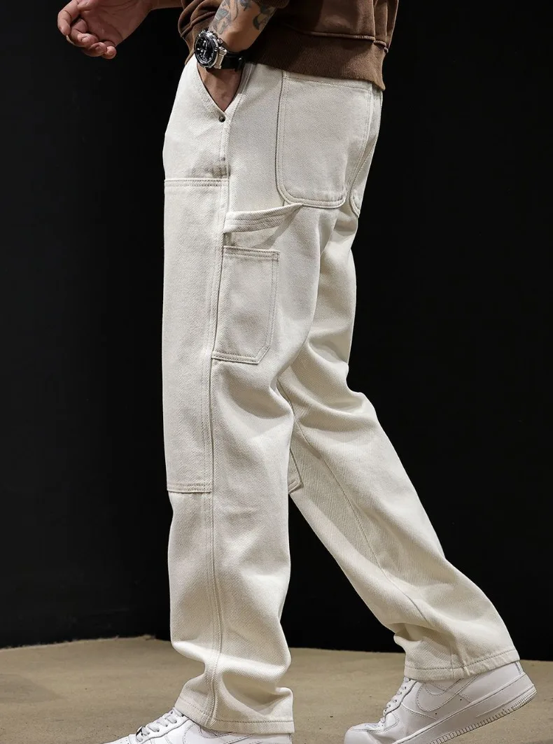AIDASE - White Workwear Thigh Patch Jeans Men's New Woodcutter Rivet Straight Denim Pants Spring Autumn American Retro Cotton Cargo Pants