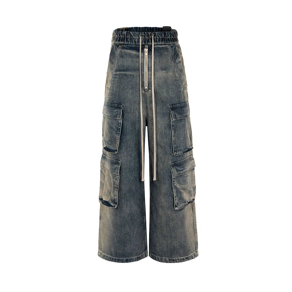 Style Gradient Ribbons Multi-pockets Drawstring Jeans for Men Harajuku Streetwear Baggy Y2K Denim Trousers Oversized Cargos
