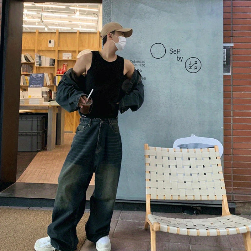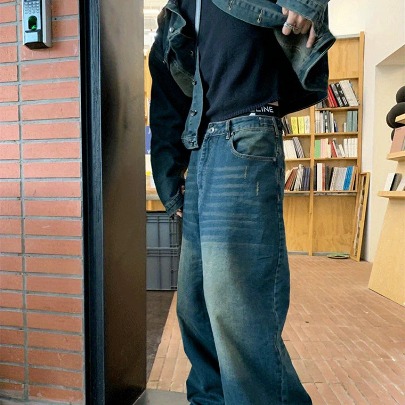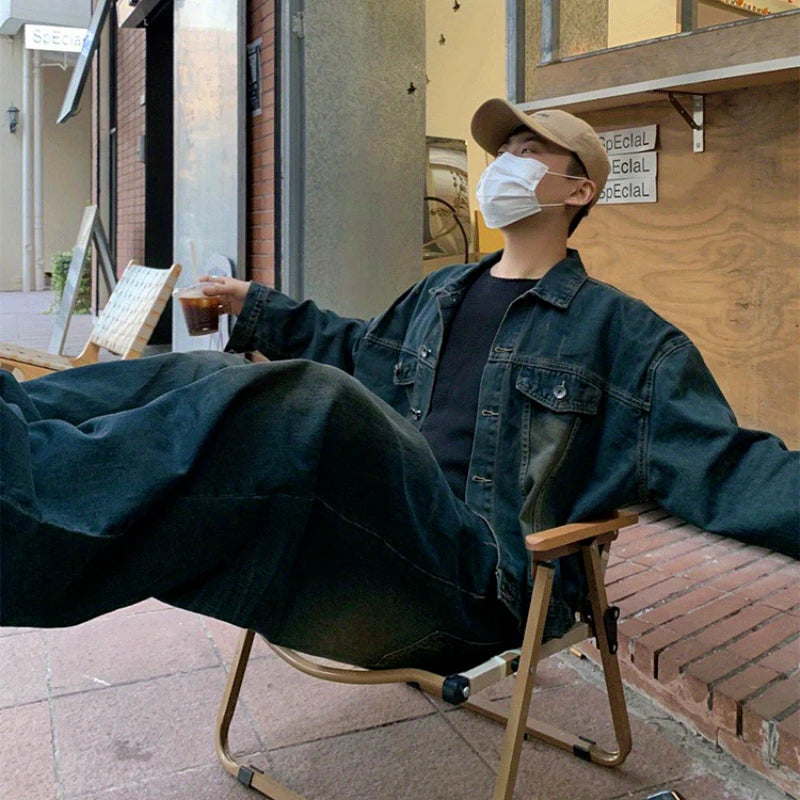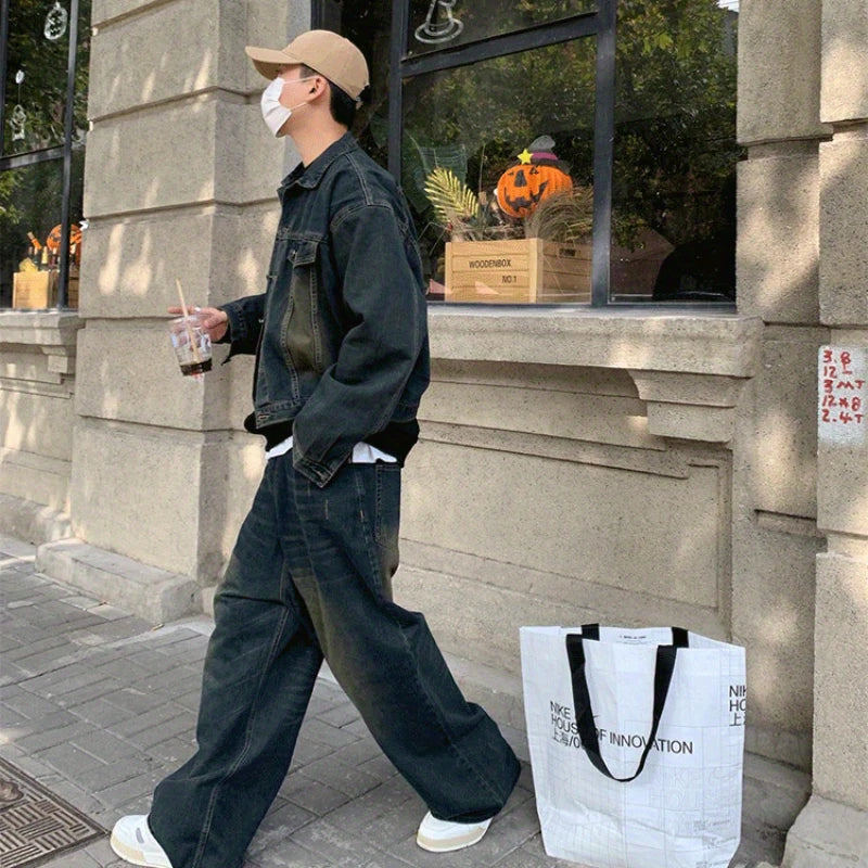 Two Piece Set/single Piece Spring Autumn Jackets Jeans Tracksuit Trendy Vintage Loose Washed Old Jeans Set Male Street Outerwear