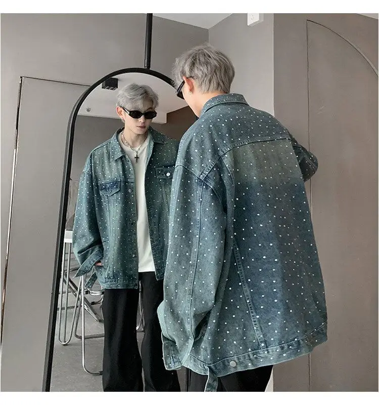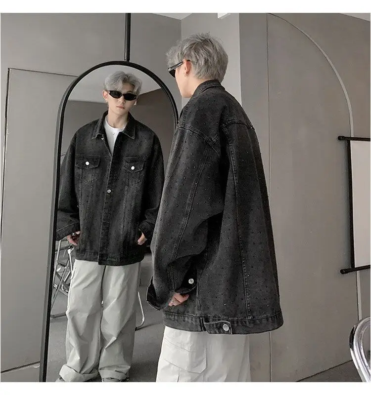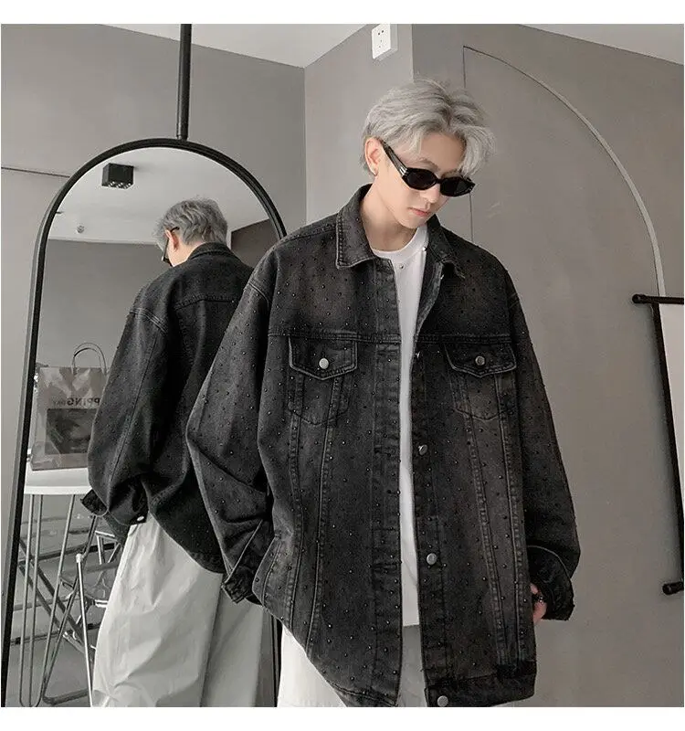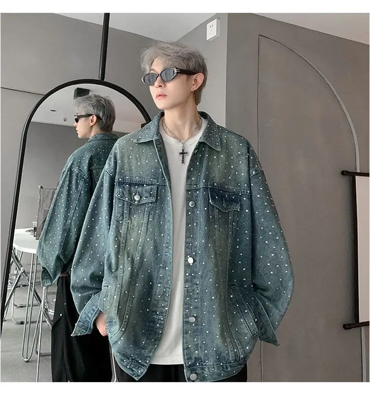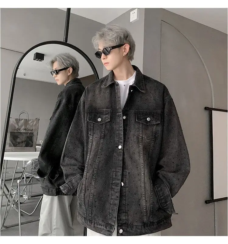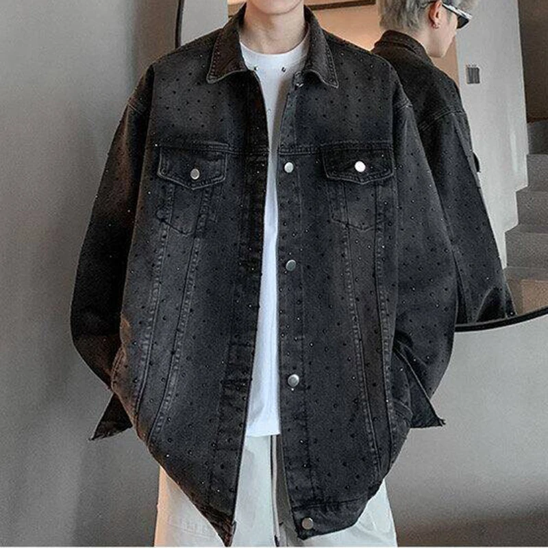AIDASE - Fashion Men's Denim Jacket 2025 New Diamond-studded Decoration Long Sleeve Lapel Single-breasted Men Coats Trend 21E6846