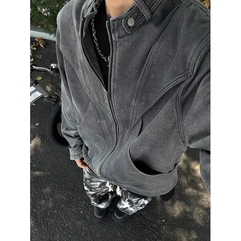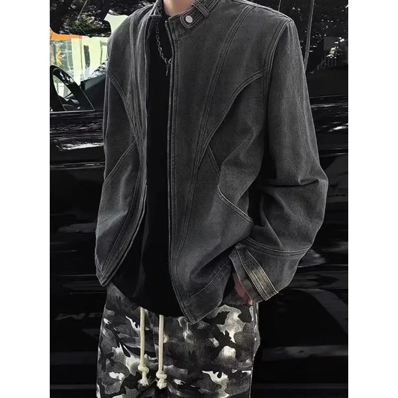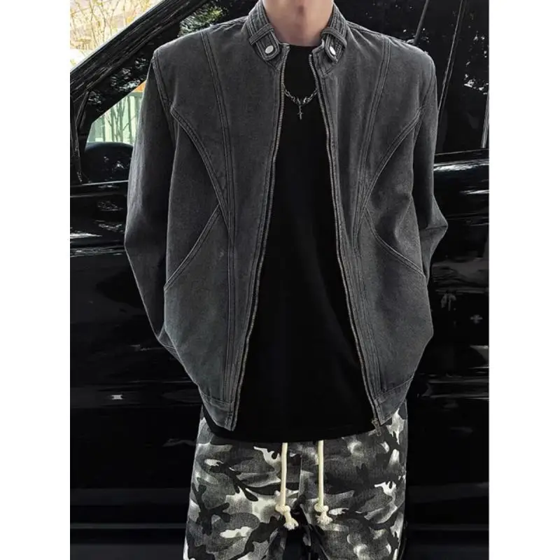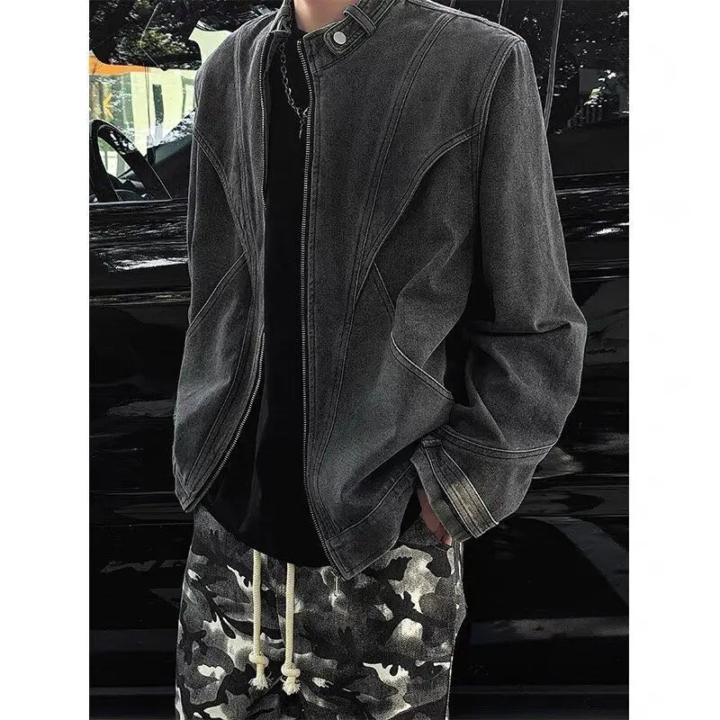 AIDASE - Fashion Men's Denim Jacket Personality Patchwork Design Stand Collar Long Sleeve Male Coats Zipper Tide Outerwear 21E7000