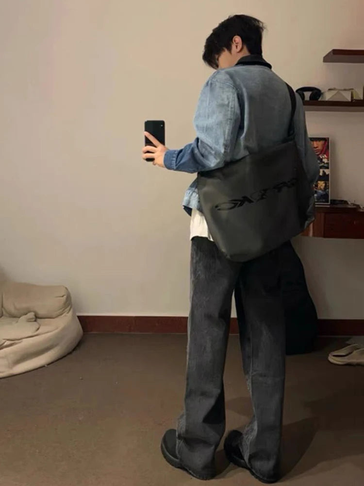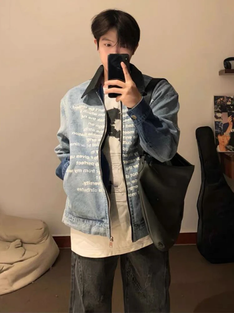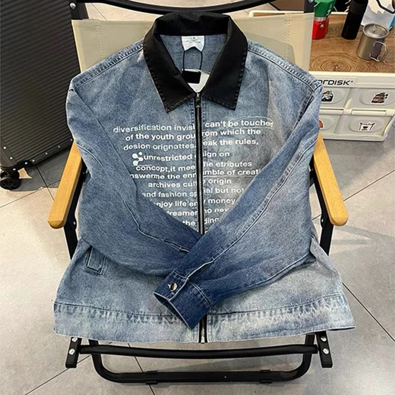 AIDASE - Men's Clothing Vintage Letter Zipper Denim Jacket Men's Spring And Fall Design Lapel Washed Biker Jacket Outerwears Coats Y2k
