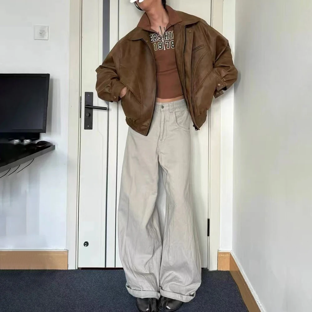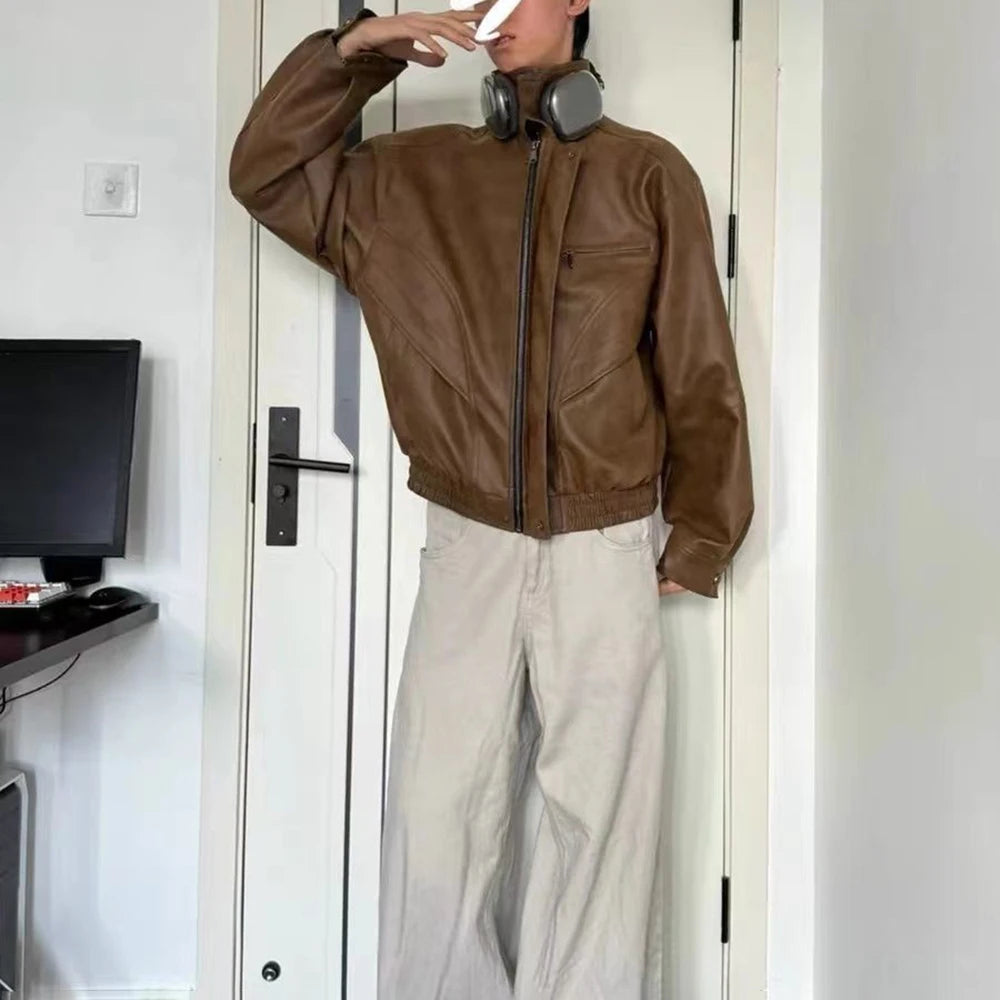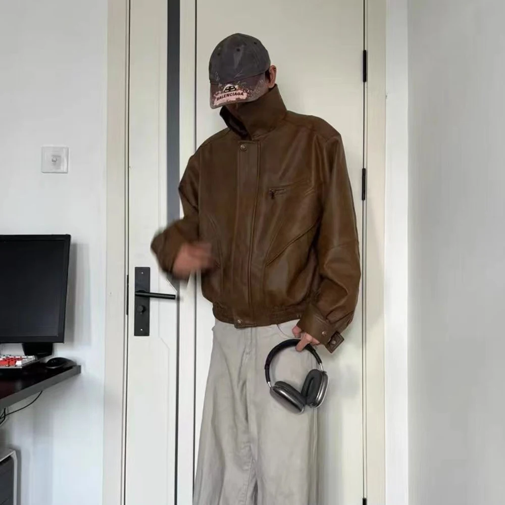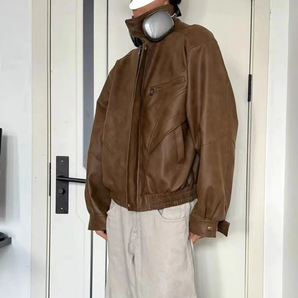 AIDASE - Mens Street Fashion Hip-Hop Niche Deconstruction Design Solid Color Pu Leather Jacket Autumn And Winter Unisex Handsome Y2k Coat