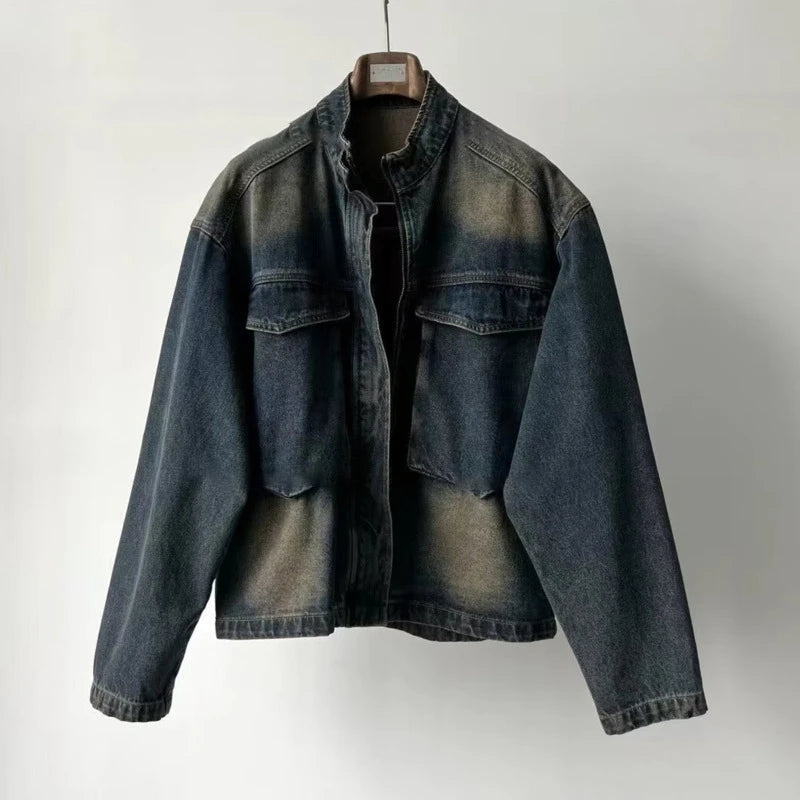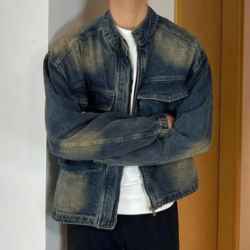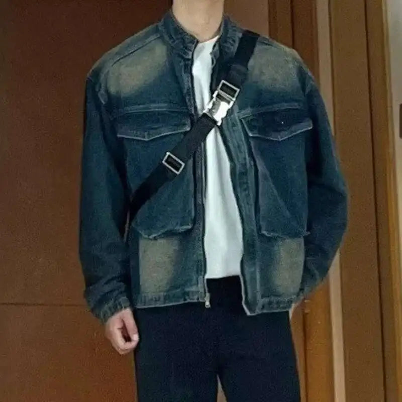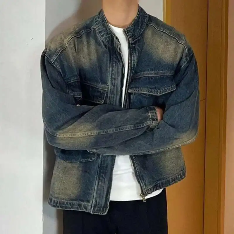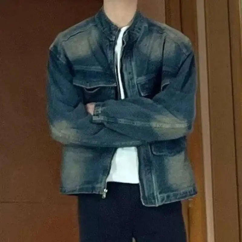 AIDASE  -  Spring Autumn New Men's Tide Punk Short Denim Jackets Loose Large Pockets Stand Collar Casual Zipper Top Trendy Coat