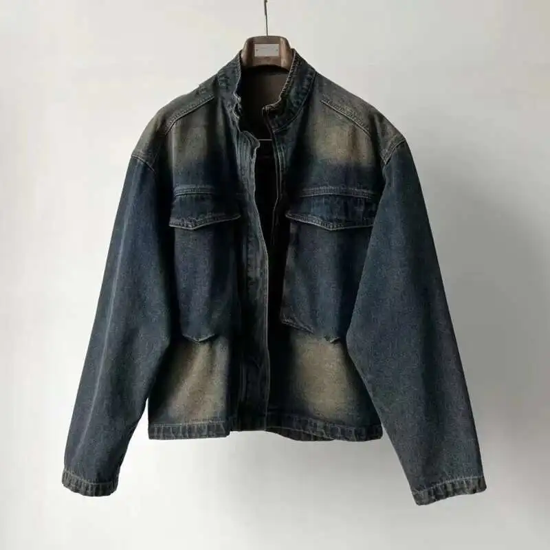 AIDASE - Spring Autumn New Men's Tide Punk Short Denim Jackets Loose Large Pockets Stand Collar Casual Zipper Top Trendy Coat