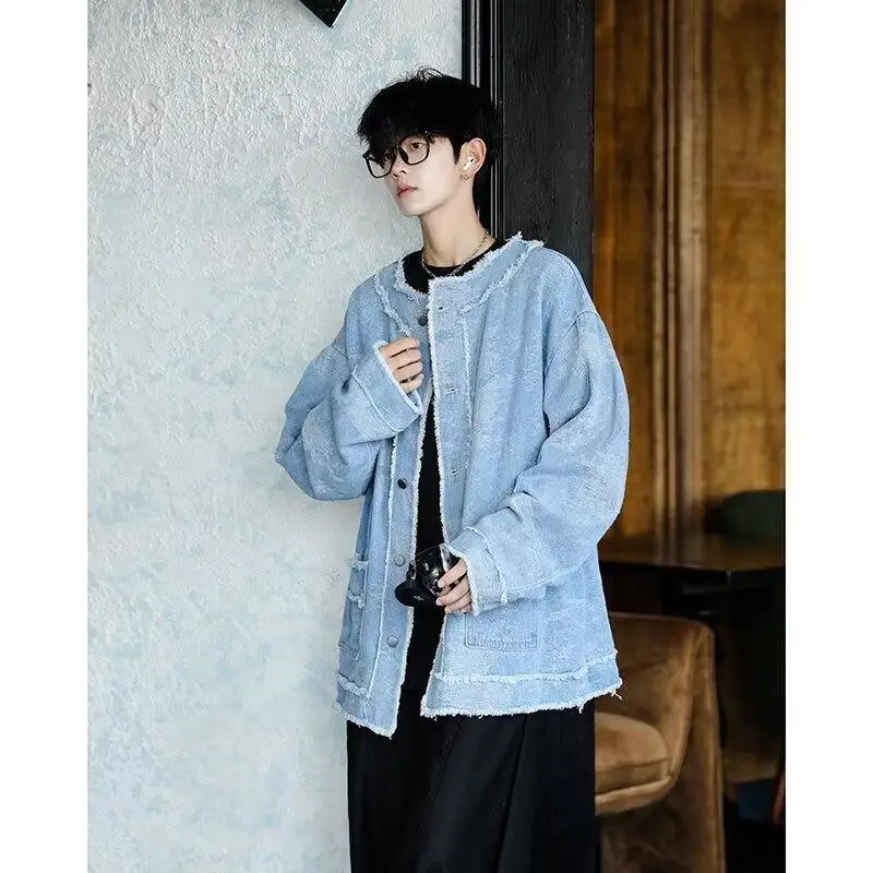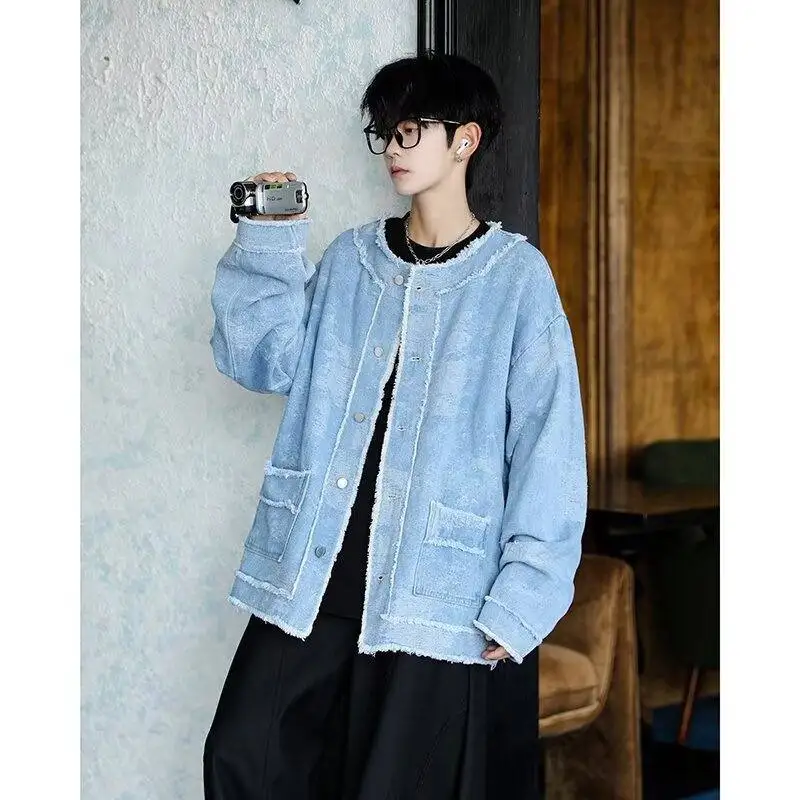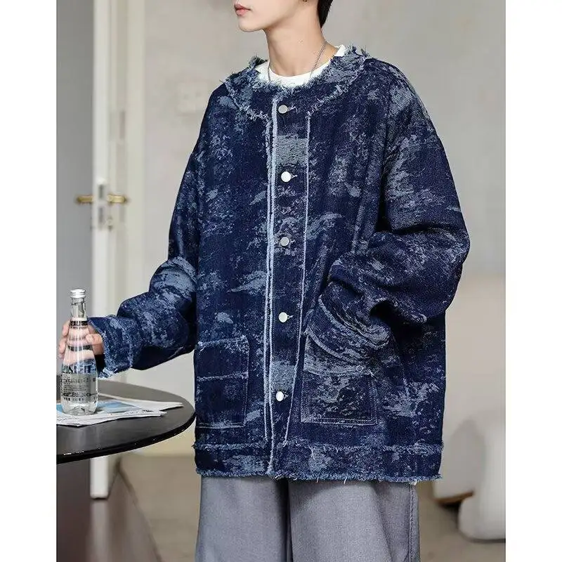 AIDASE - Trendy Men Denim Jacket American Style Fashion Full Print Jacquard Design Raw Edge Long Sleeve Round Neck Coats 21E7627