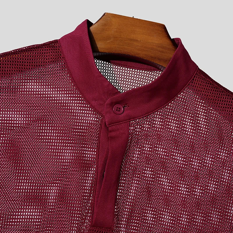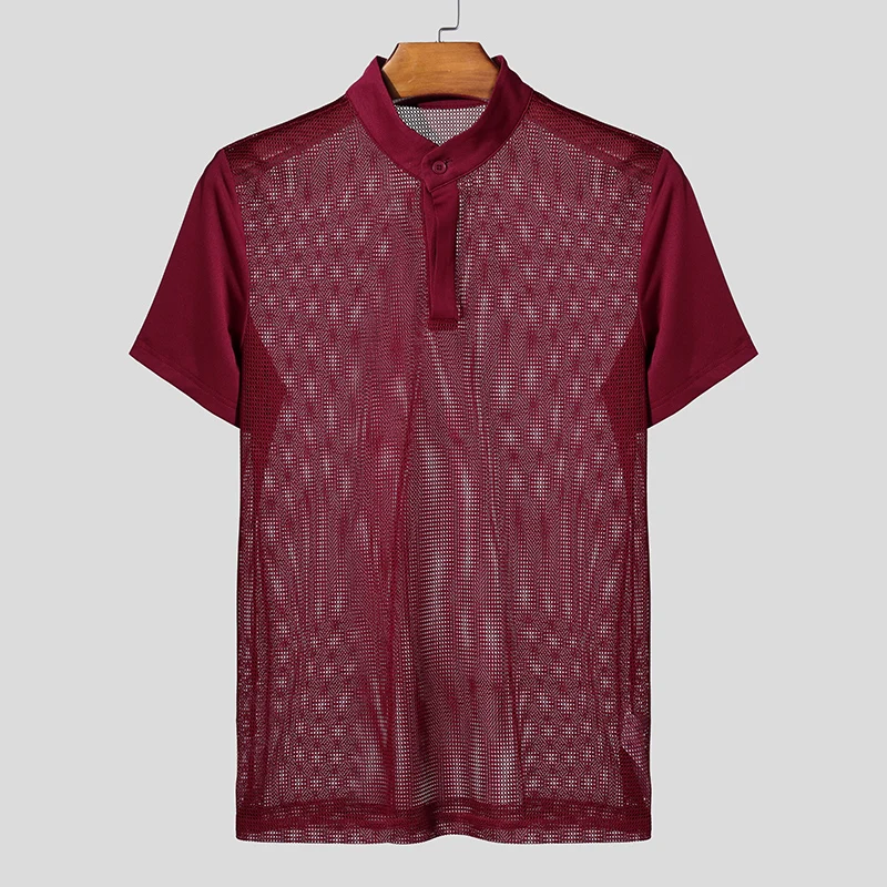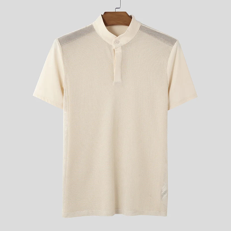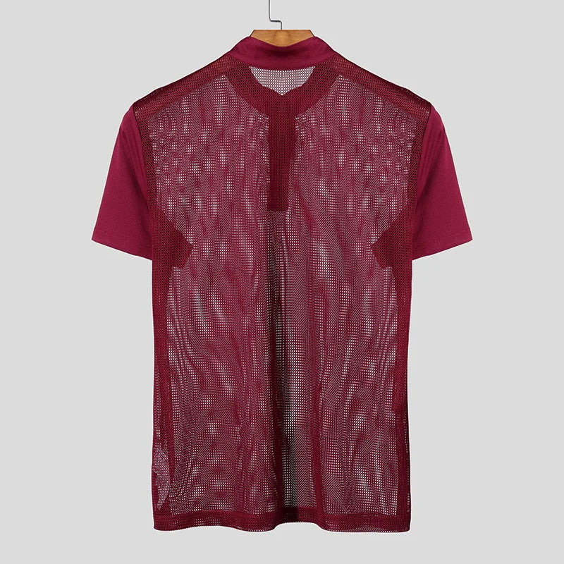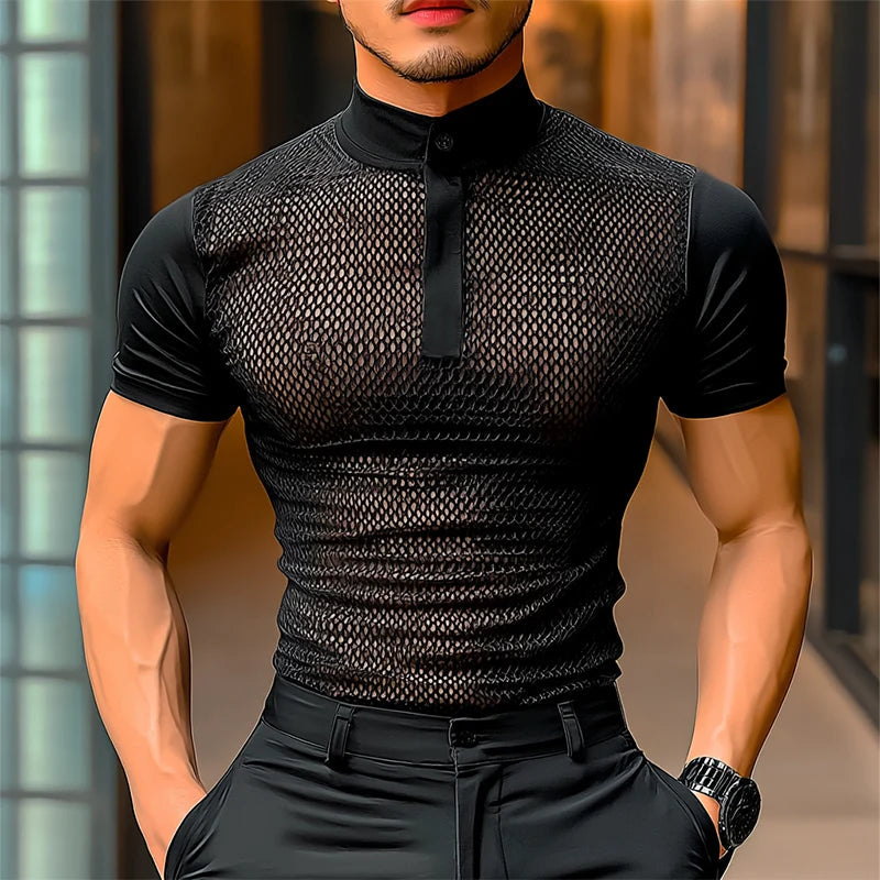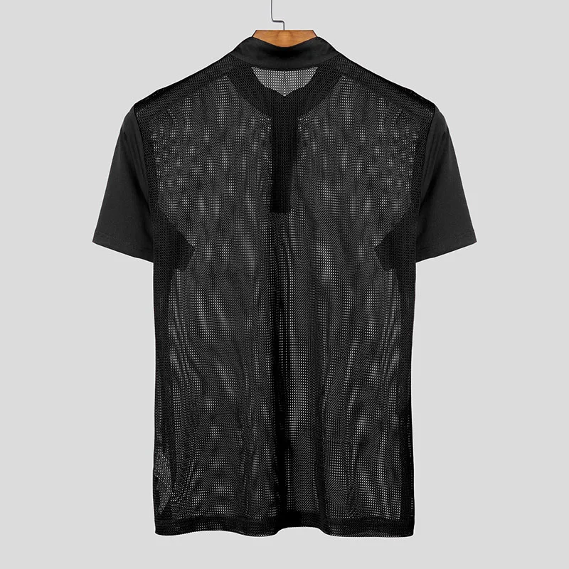AIDASE - Men T Shirts Mesh Patchwork Transparent Turtleneck Short Sleeve Casual Camisetas Streetwear 2025 Fashion Sexy Tee Tops