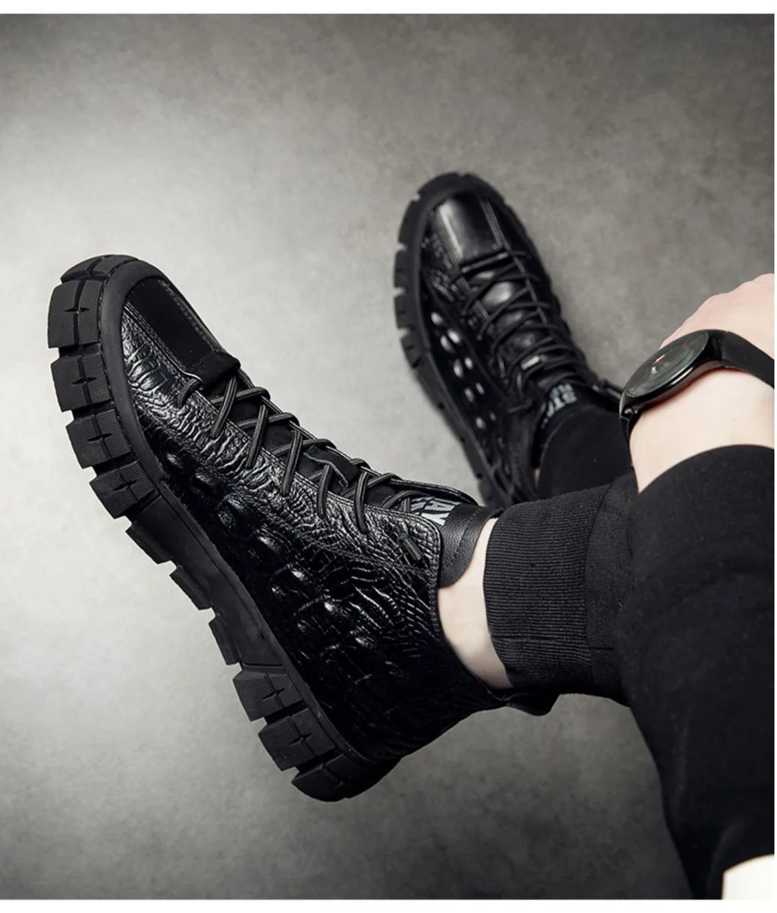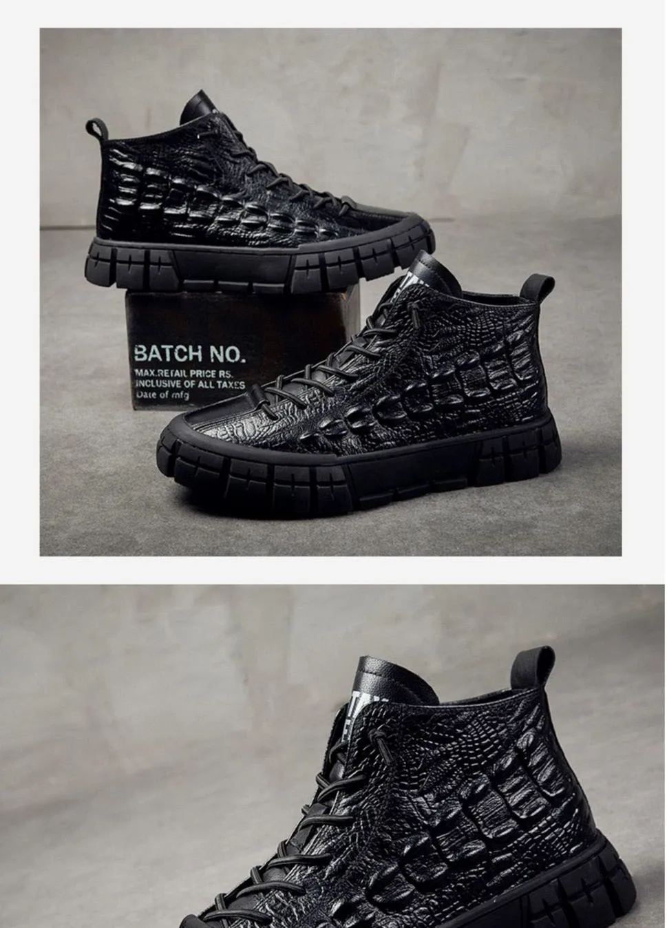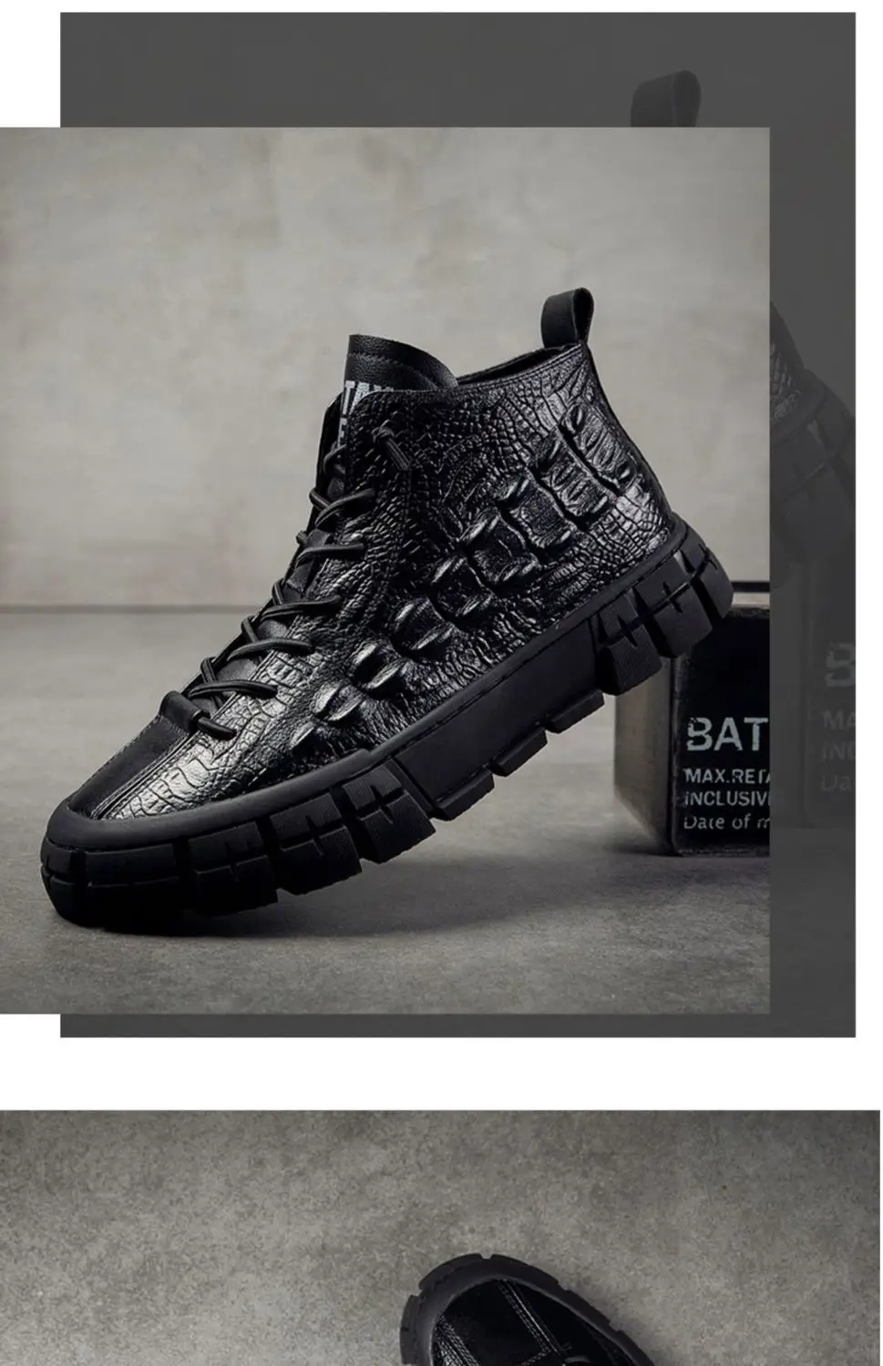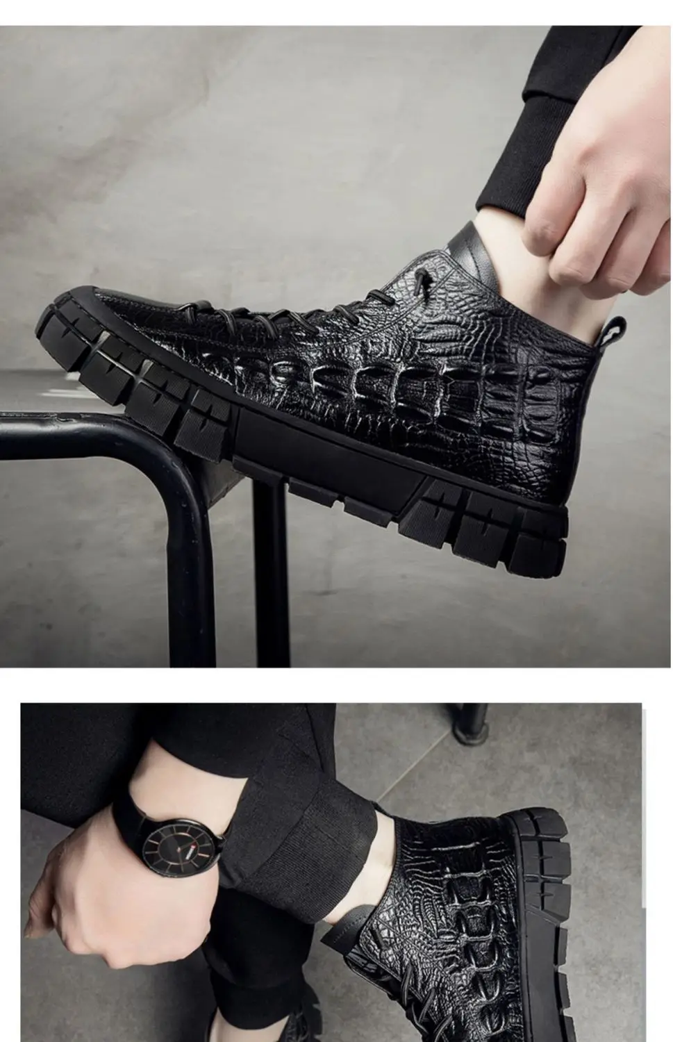 Black Uneven Leather Winter Boots Men Cool Casual Fur Boots for Youth Boys Alligator Print Platform Sneakers Men Autumn Shoes