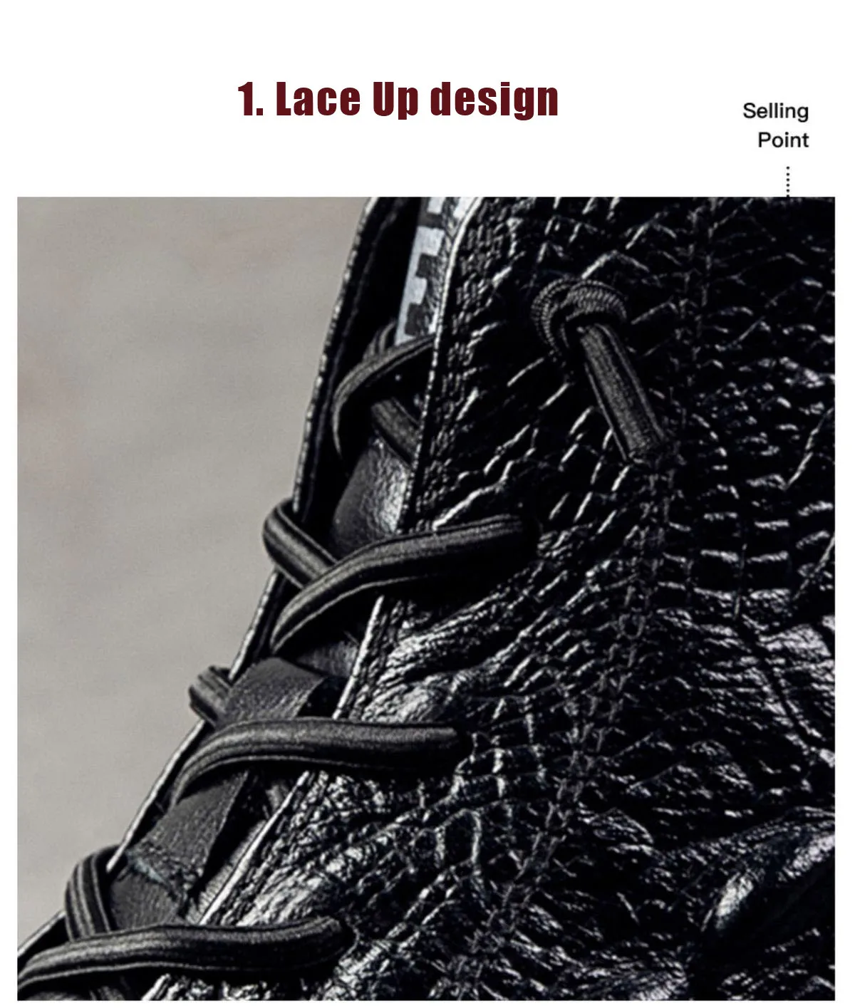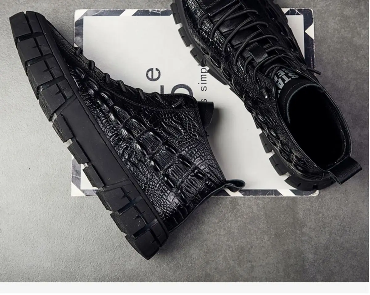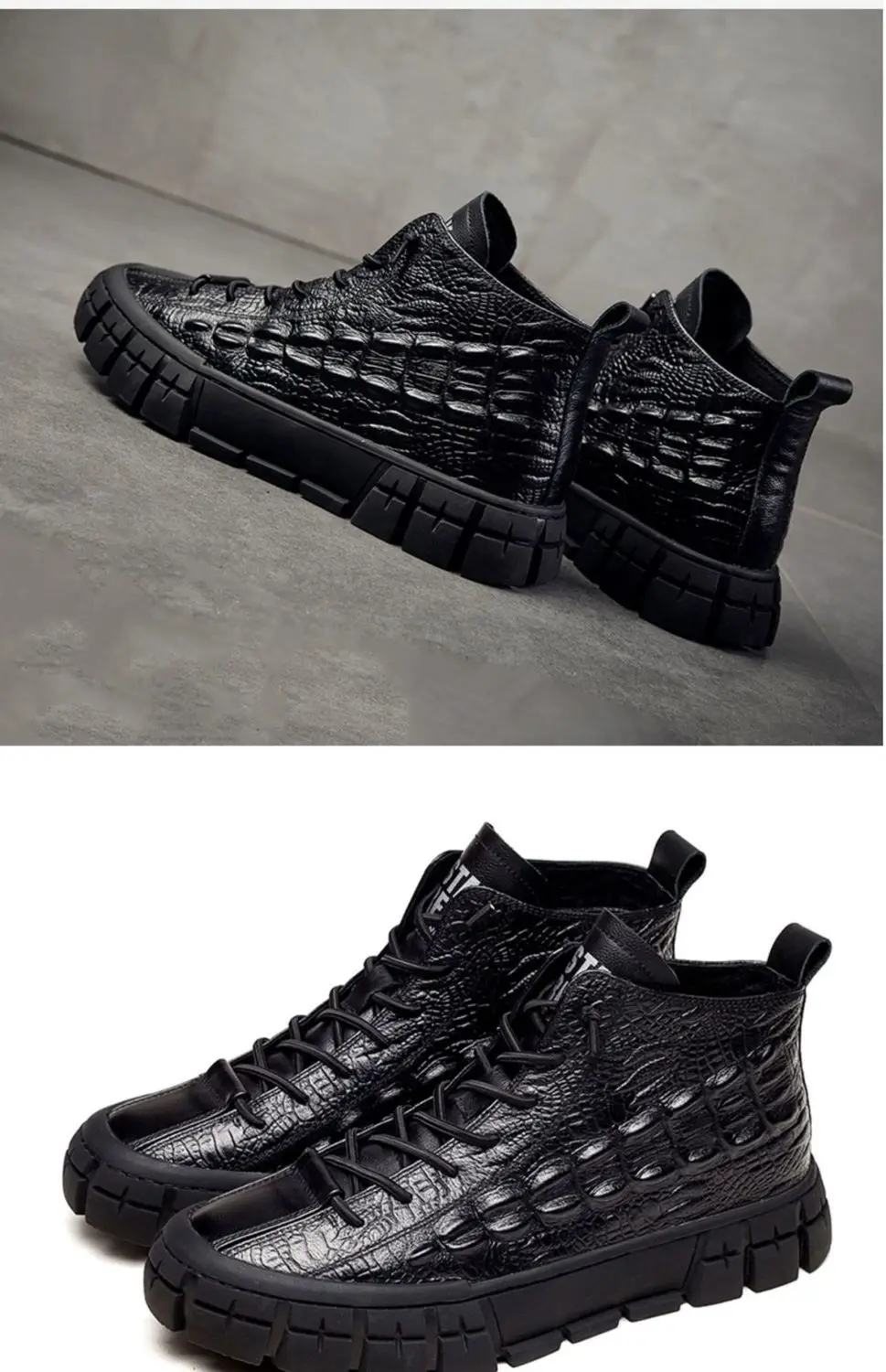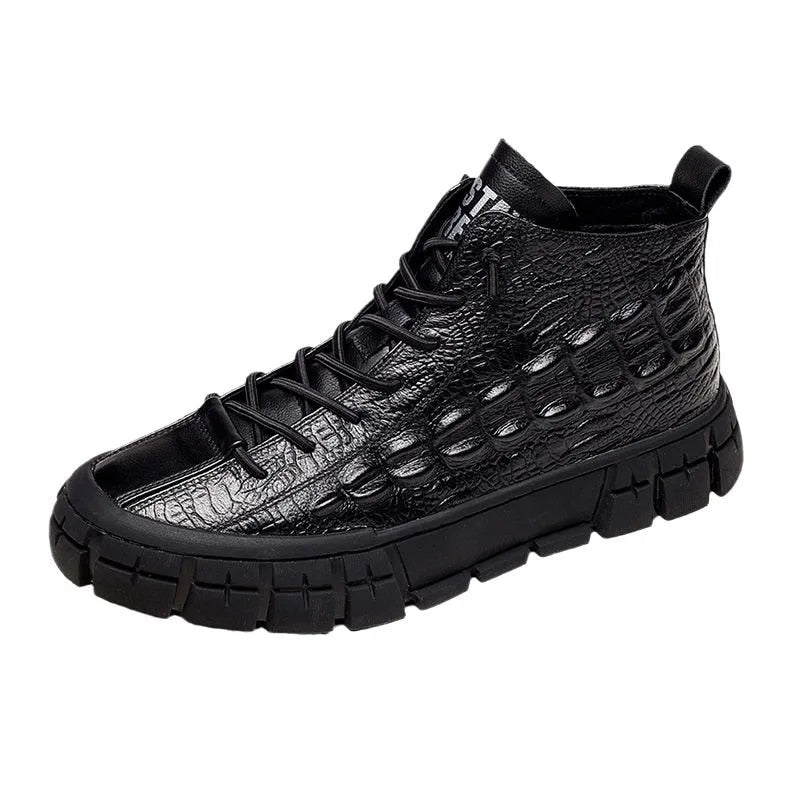 Black Uneven Leather Winter Boots Men Cool Casual Fur Boots for Youth Boys Alligator Print Platform Sneakers Men Autumn Shoes