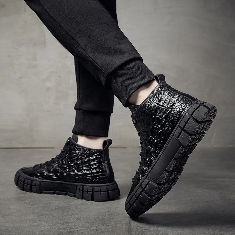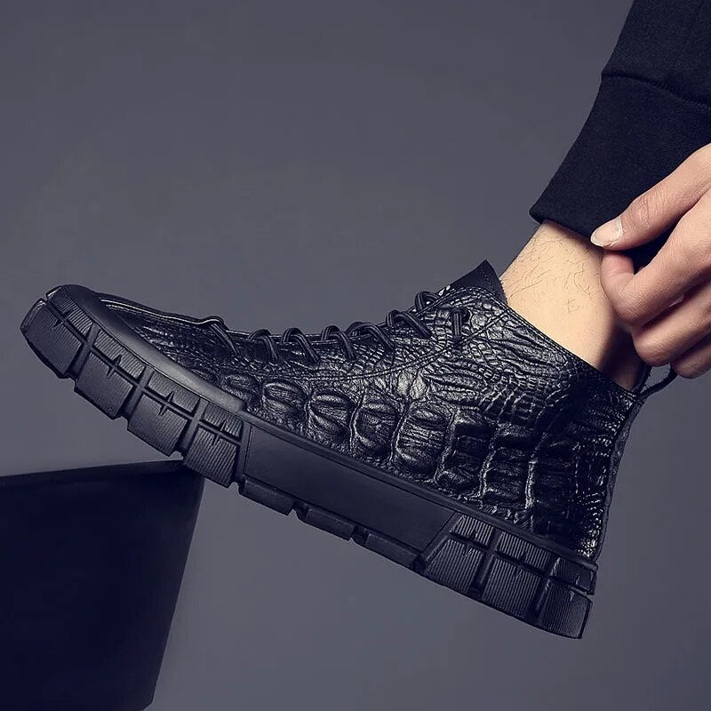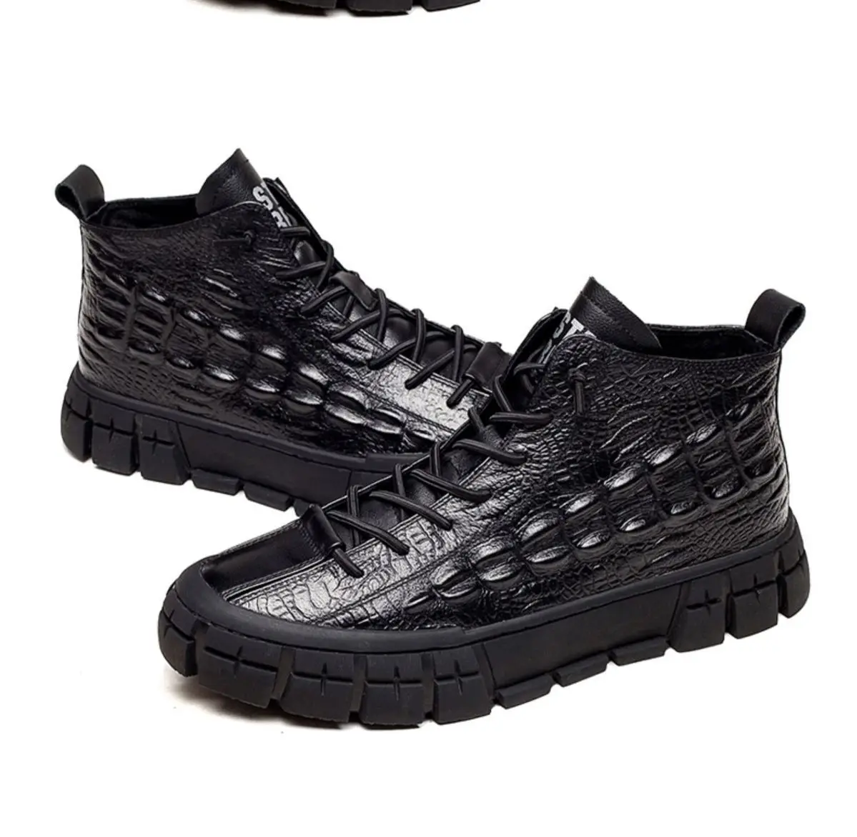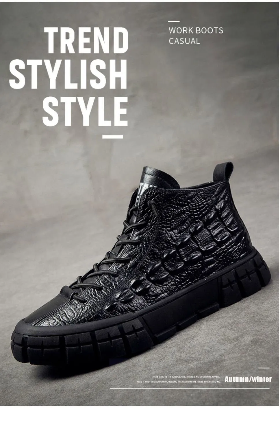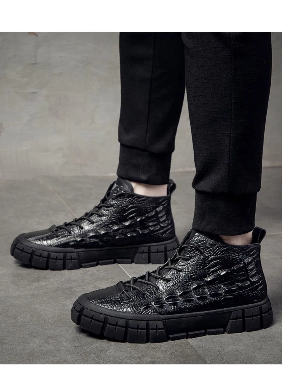 Black Uneven Leather Winter Boots Men Cool Casual Fur Boots for Youth Boys Alligator Print Platform Sneakers Men Autumn Shoes
