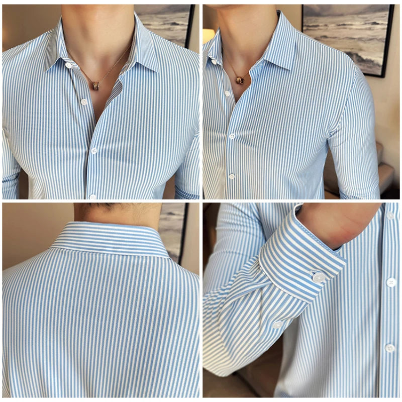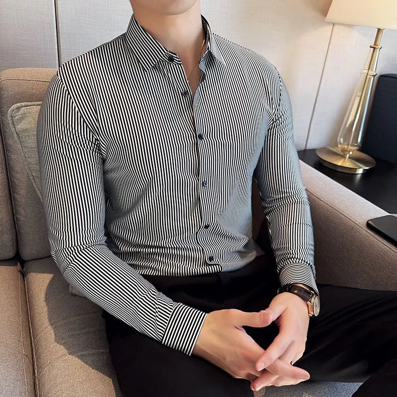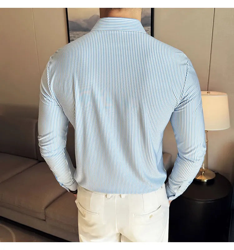 High-Grade Elasticity Traceless Adhesive Draping Striped Long-Sleeved Shirt Men's Slim Shirt Black New 2024 Cool