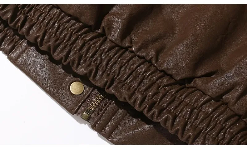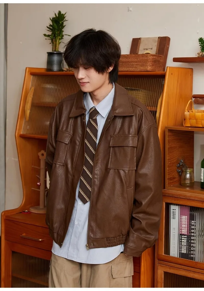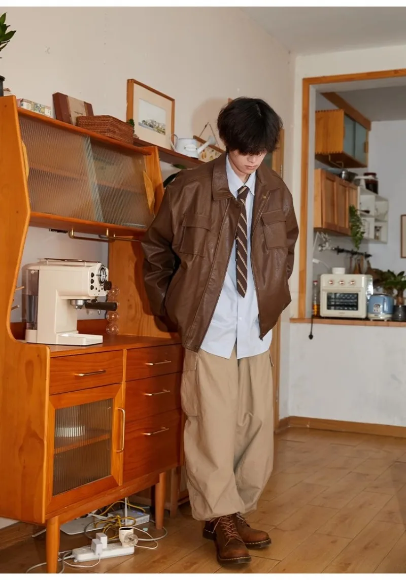 Aidase Japanese Mens Leather Jacket 2024 New Harajuku Retro Motorcycle Loose Couple Coat Big Pocket Lapel Bomber Outwear Y2k Trend