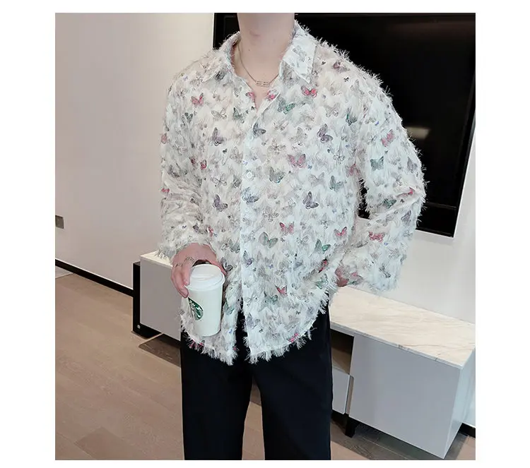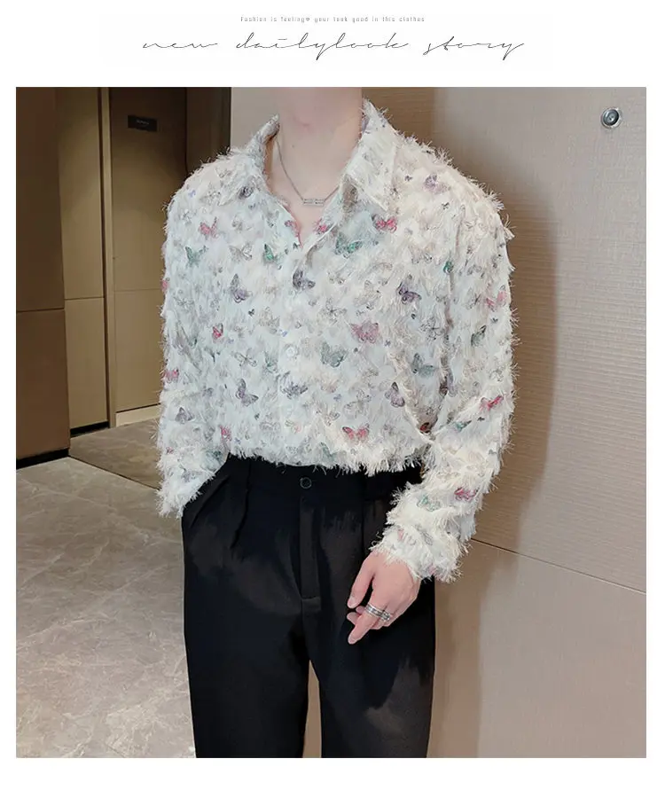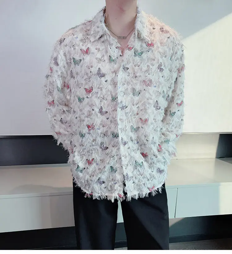 Summer Shirt New Butterfly Long Sleeve Shirt Tassel Casual Turn-down Collar Fashion Male Clothing 2024 Trendy
