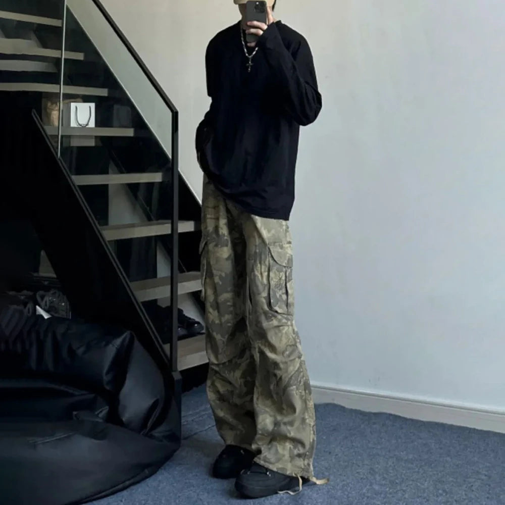 Aidase Mens Y2k American Retro Pocket Camouflage Straight Pants Genderless Trendy Hip-Hop Workwear Style Loose Wide-Leg Pants Unisex
