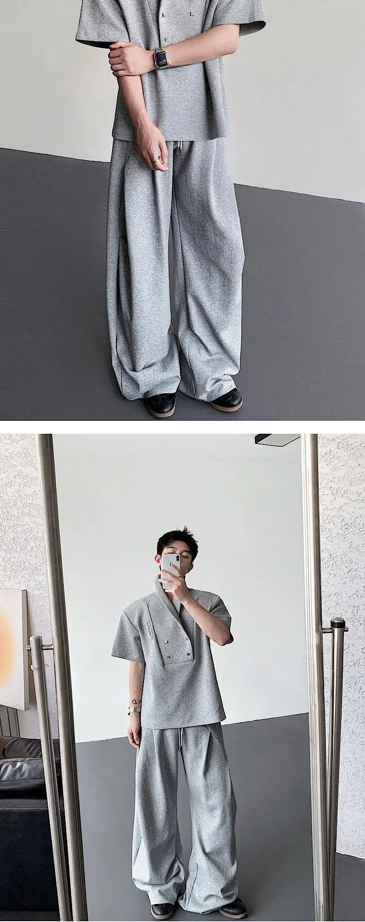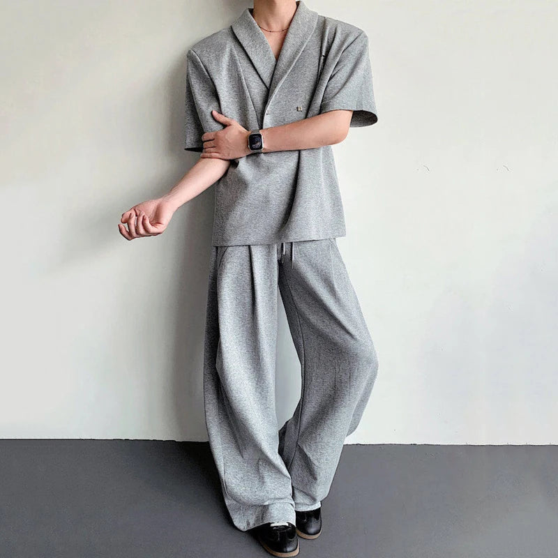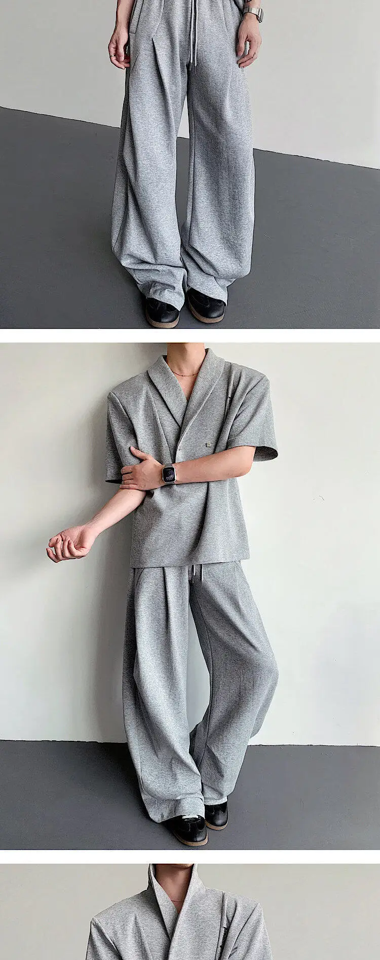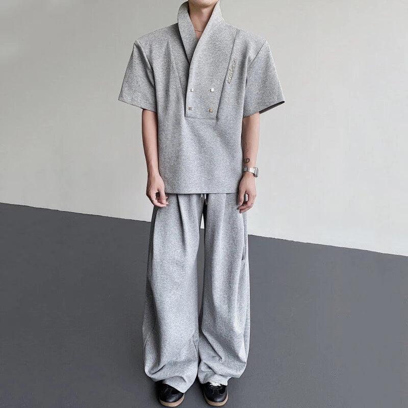 AIDASE - Simple Men's Two-piece Shawl Collar Short Sleeved Shoulder Pads Short Sleeved T-shirts Drawstring Loose Male Pants 9W3272