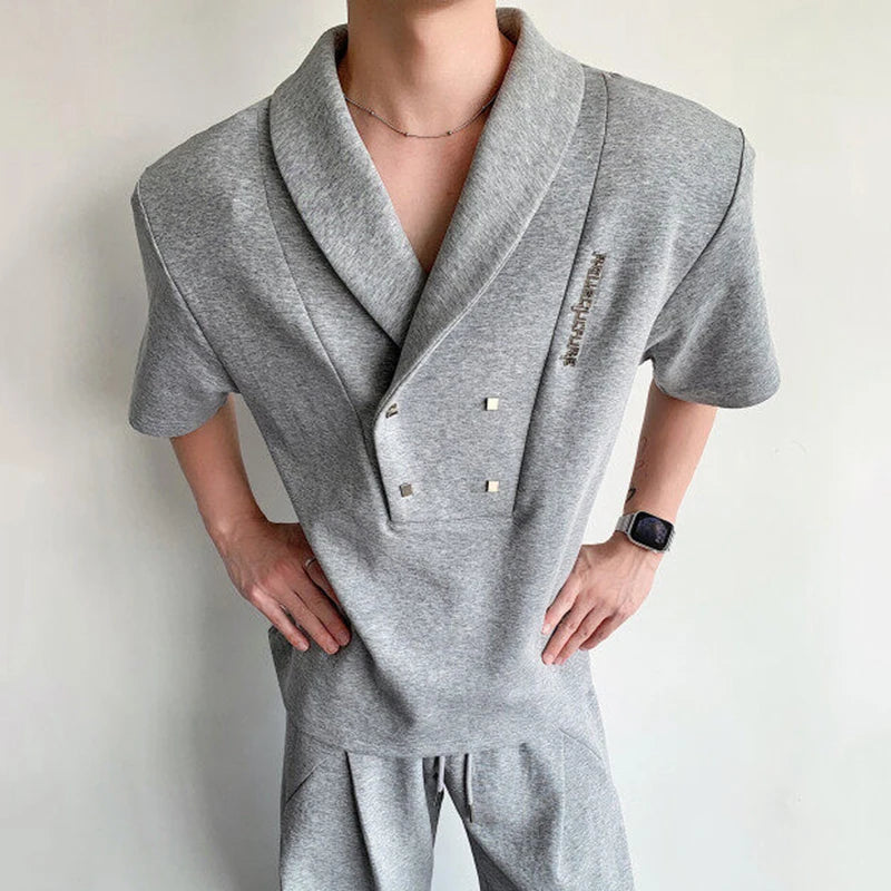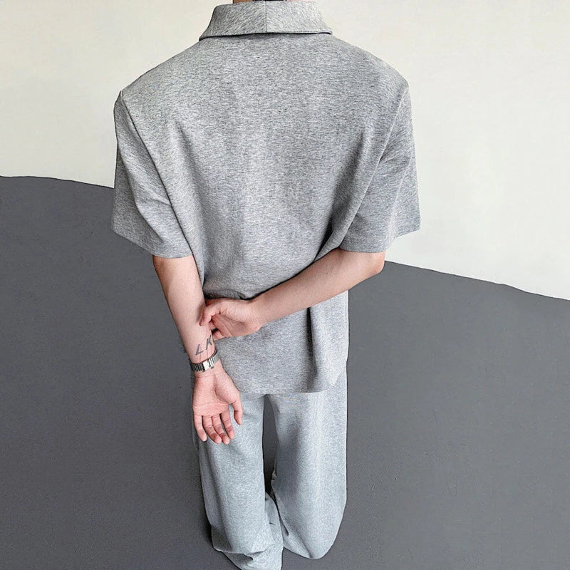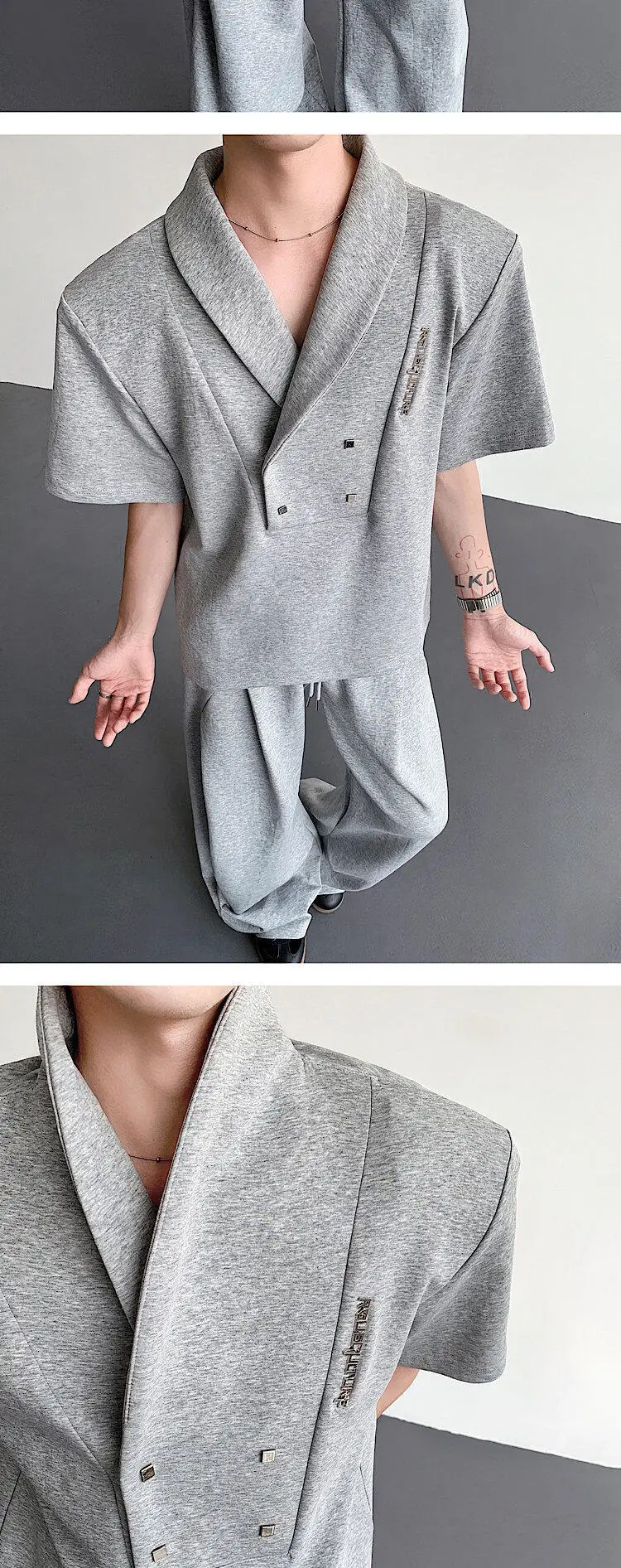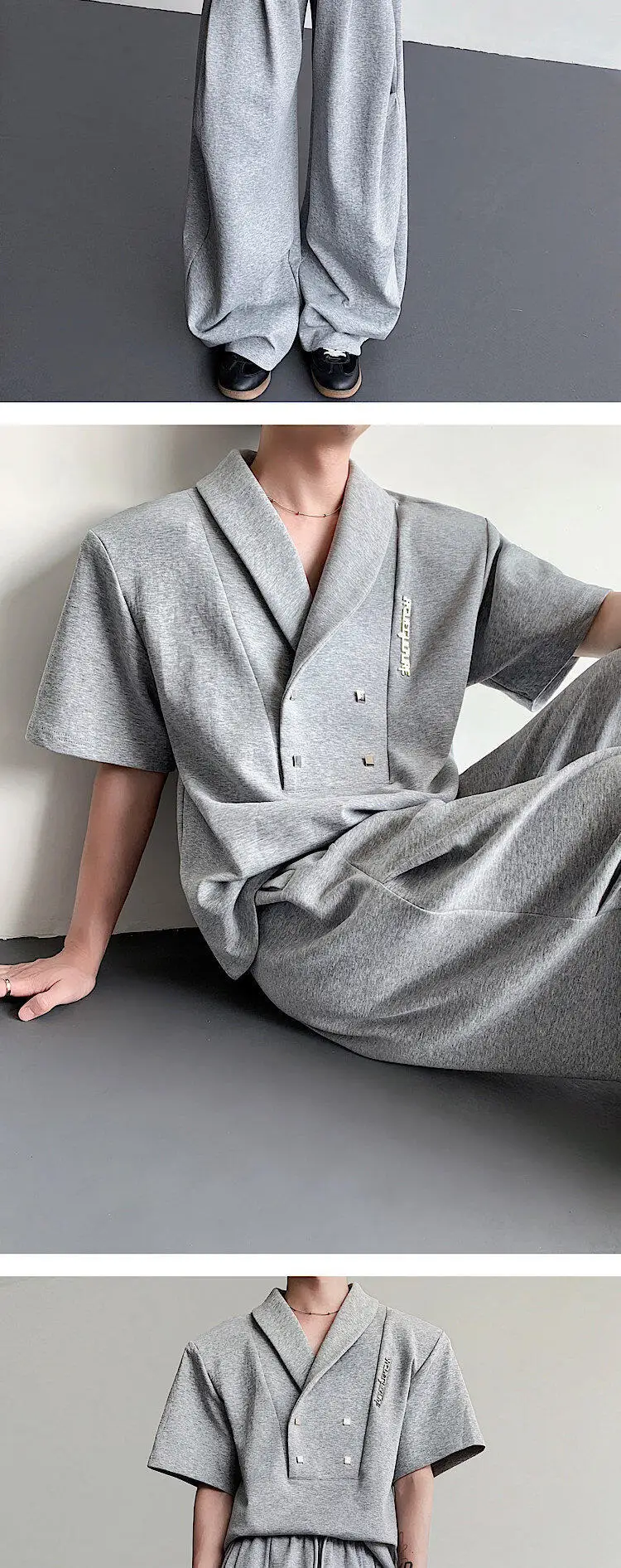AIDASE - Simple Men's Two-piece Shawl Collar Short Sleeved Shoulder Pads Short Sleeved T-shirts Drawstring Loose Male Pants 9W3272