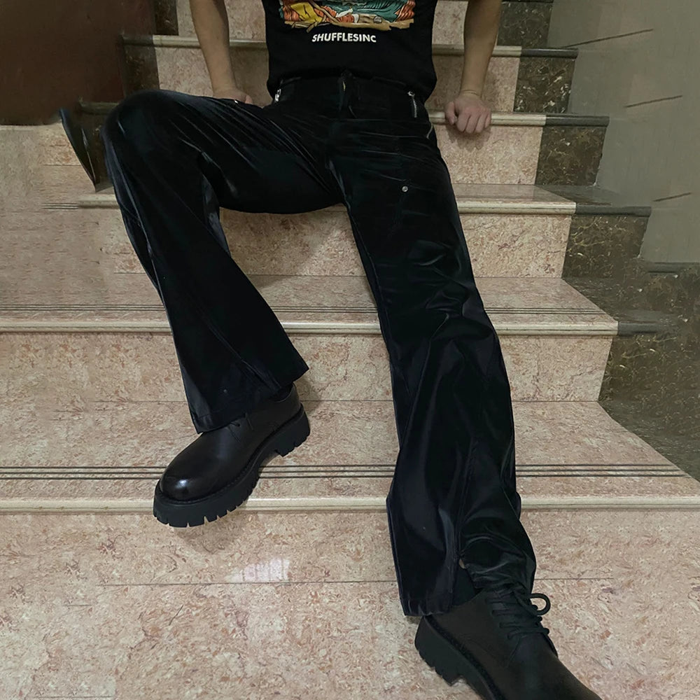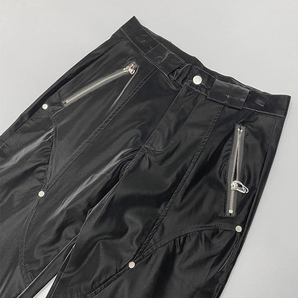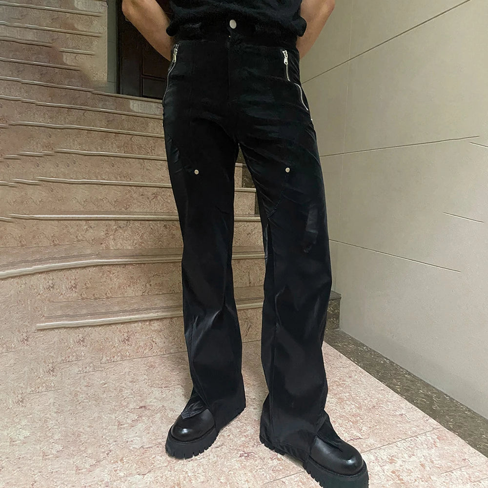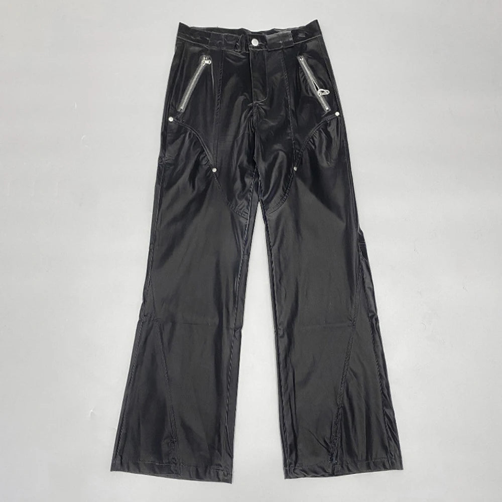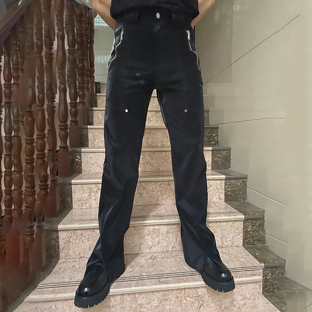 Street Y2K Pants American Retro Faux Leather Pants Men's Punk Rivet Design Trousers Trend High Waist Loose Gloss Straight Pants
