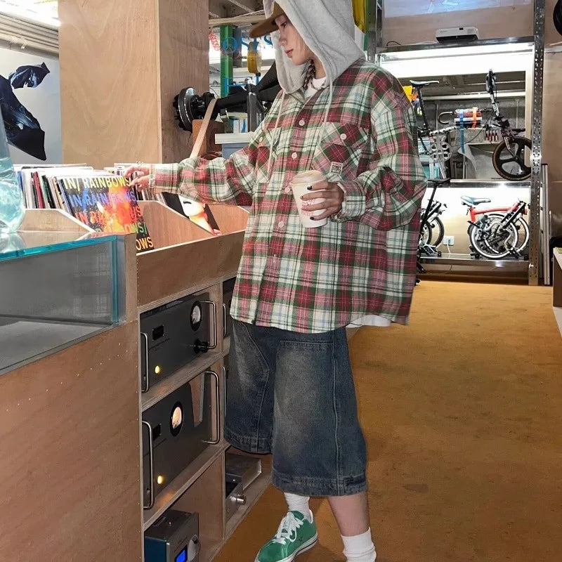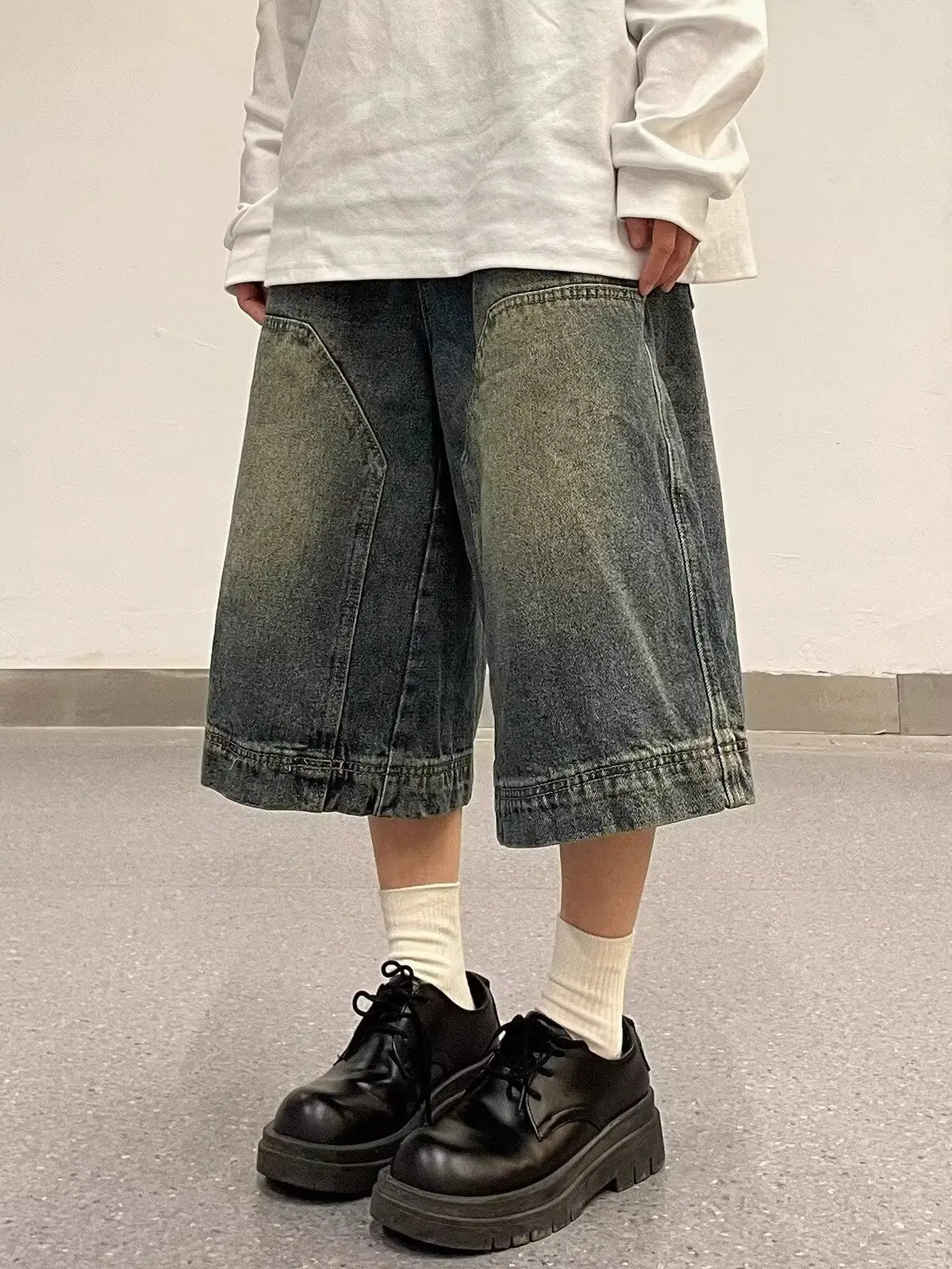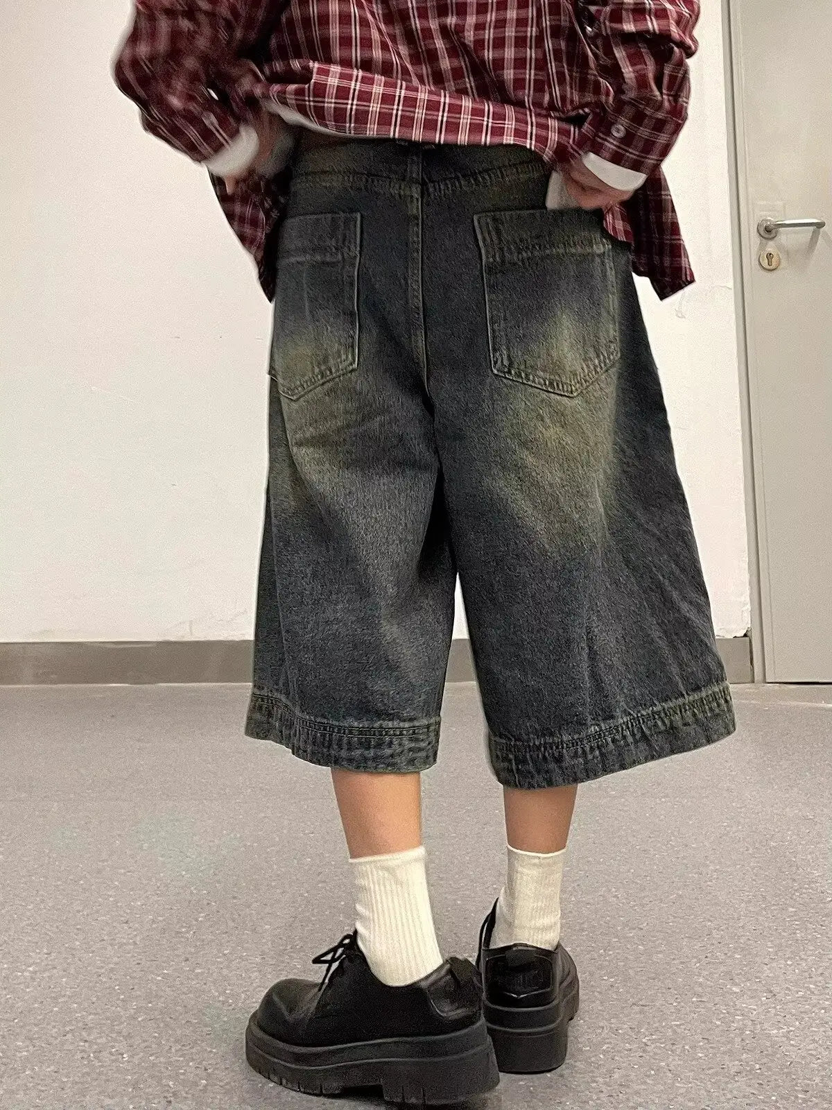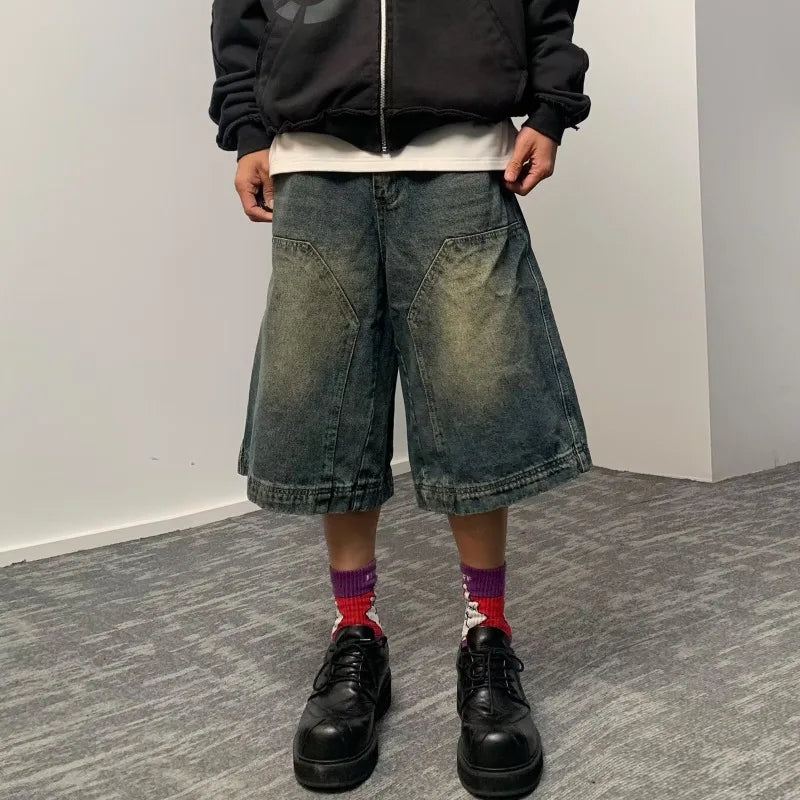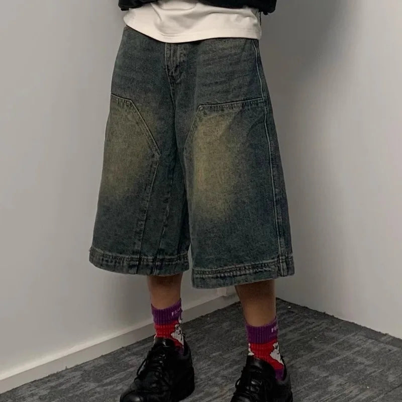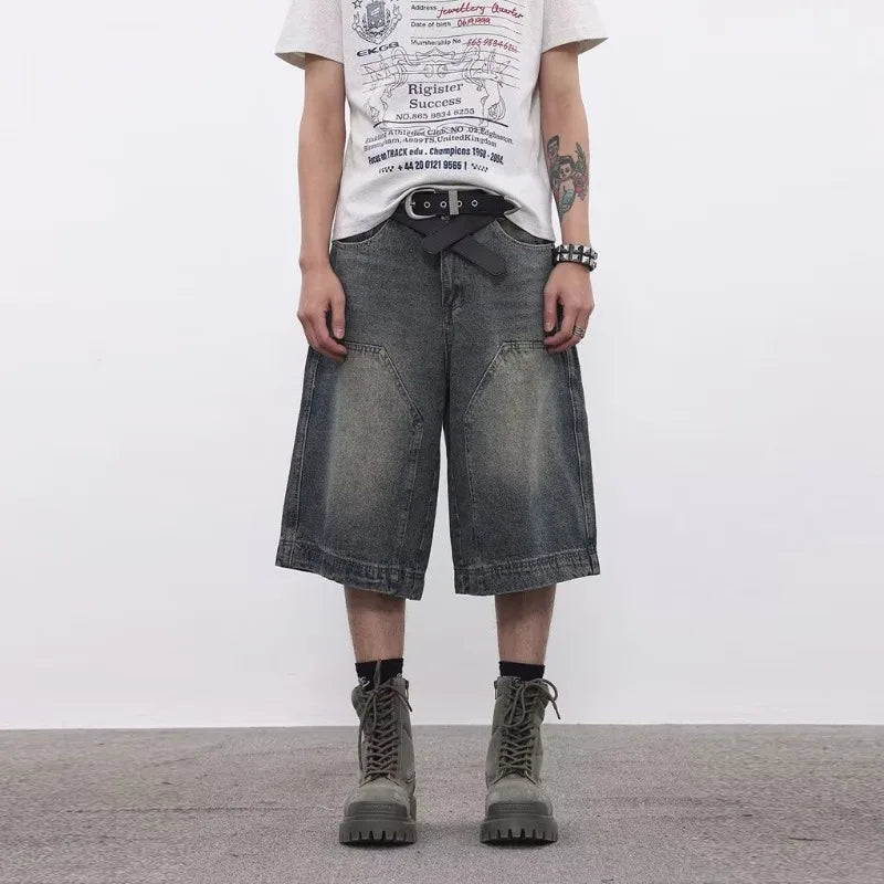 Aidase American Retro Blue Denim Shorts Men Korean Style High Waist Loose Straight Jeans Summer Chic Streetwear Knee-length Pant New