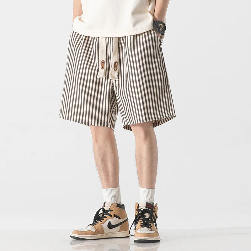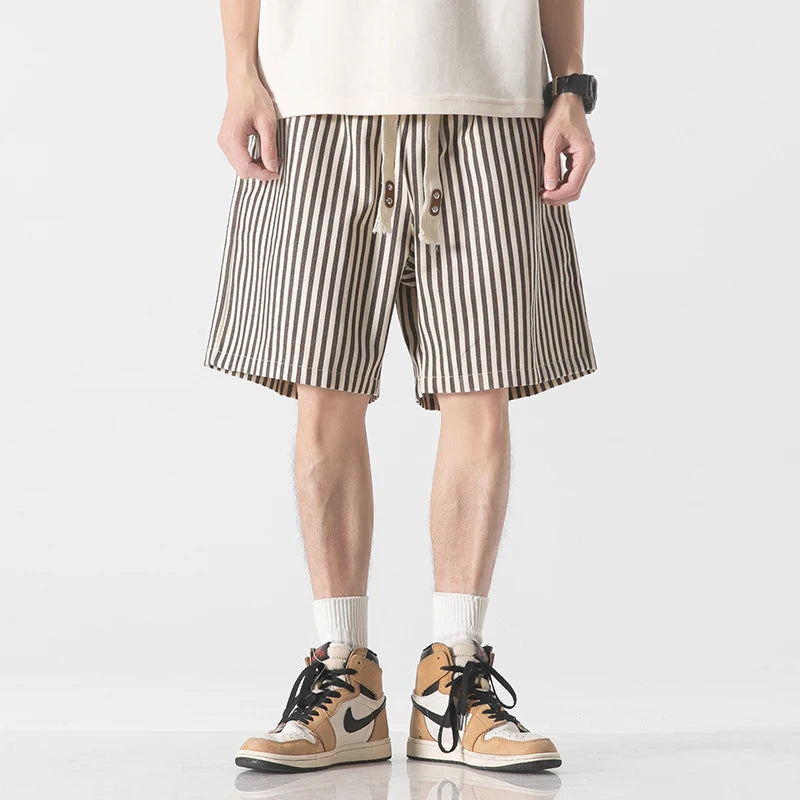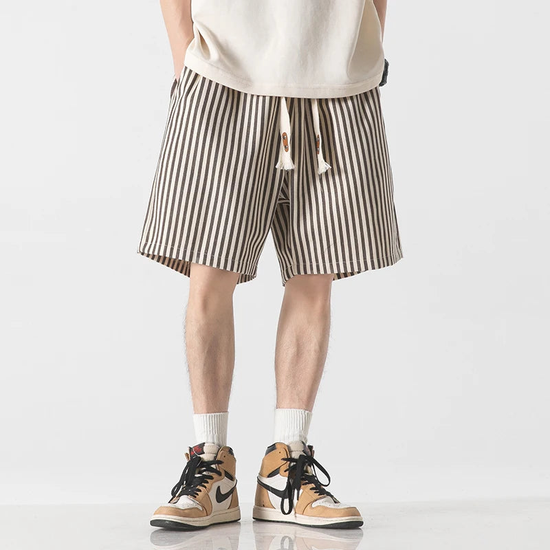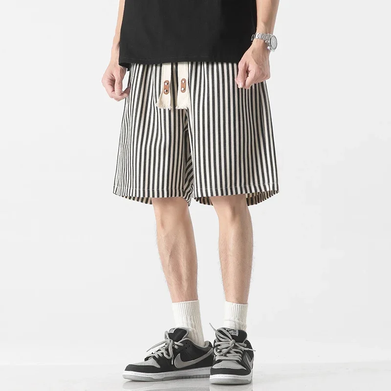 AIDASE - Korean Simplicity Summer Casual Shorts Men's Striped Elastic Waist Drawstring Pockets Youthful Vitality Loose Knee Length Pants