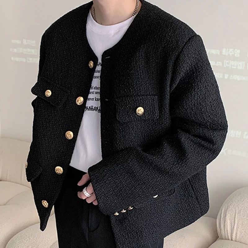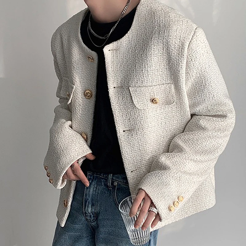 Aidase Korean Style Fashionable Tweed Round Neck Jacket Men Japanese Trendy High-end Single-breasted Short Jacket with Temperament