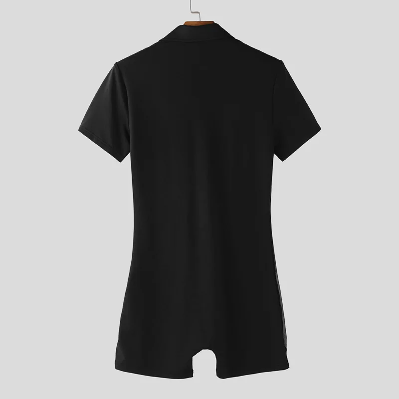 AIDASE  -  Men Bodysuits Mesh Patchwork Zipper Lapel Short Sleeve Male Rompers Playsuits Sexy See Through Fashion Bodysuit S-3XL