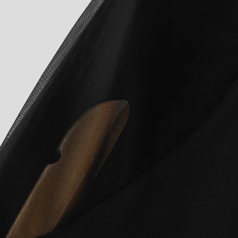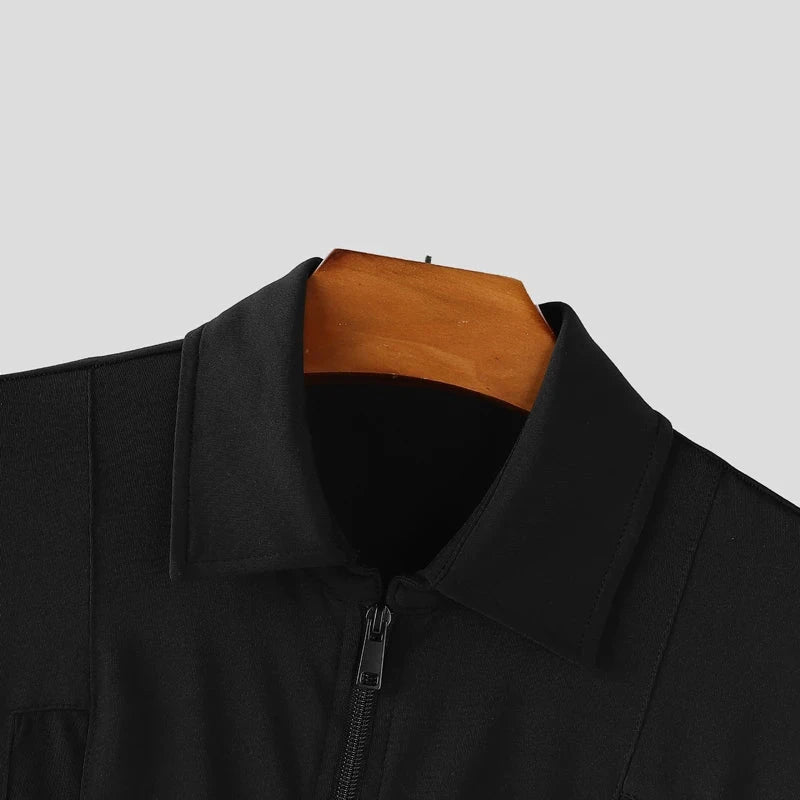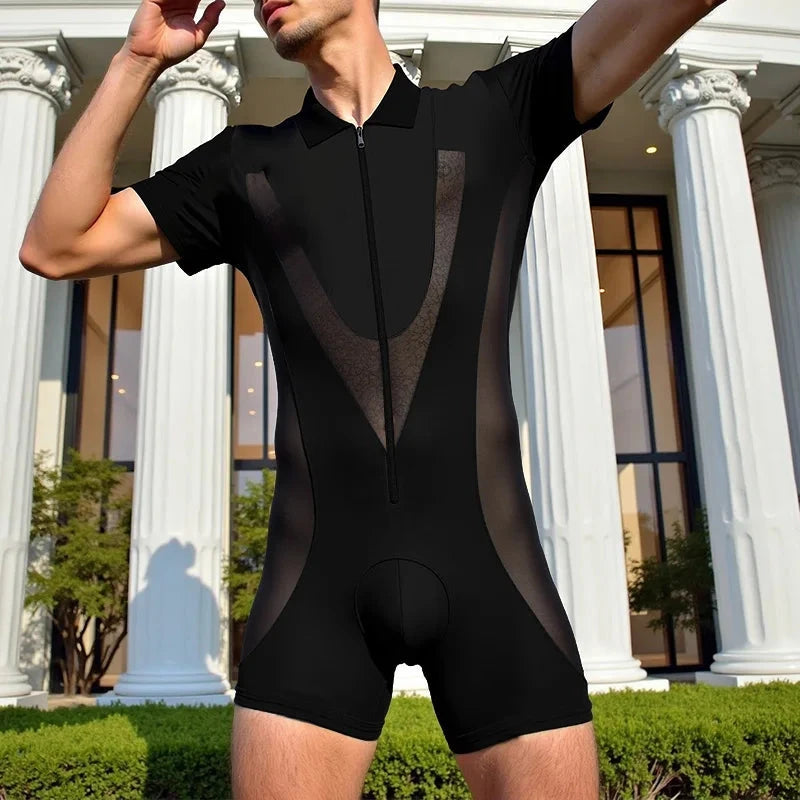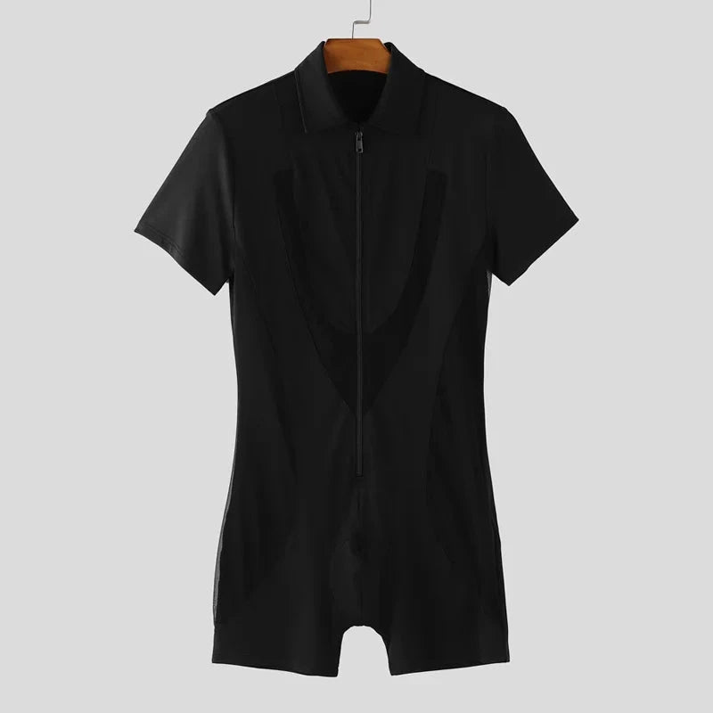 AIDASE - Men Bodysuits Mesh Patchwork Zipper Lapel Short Sleeve Male Rompers Playsuits Sexy See Through Fashion Bodysuit S-3XL