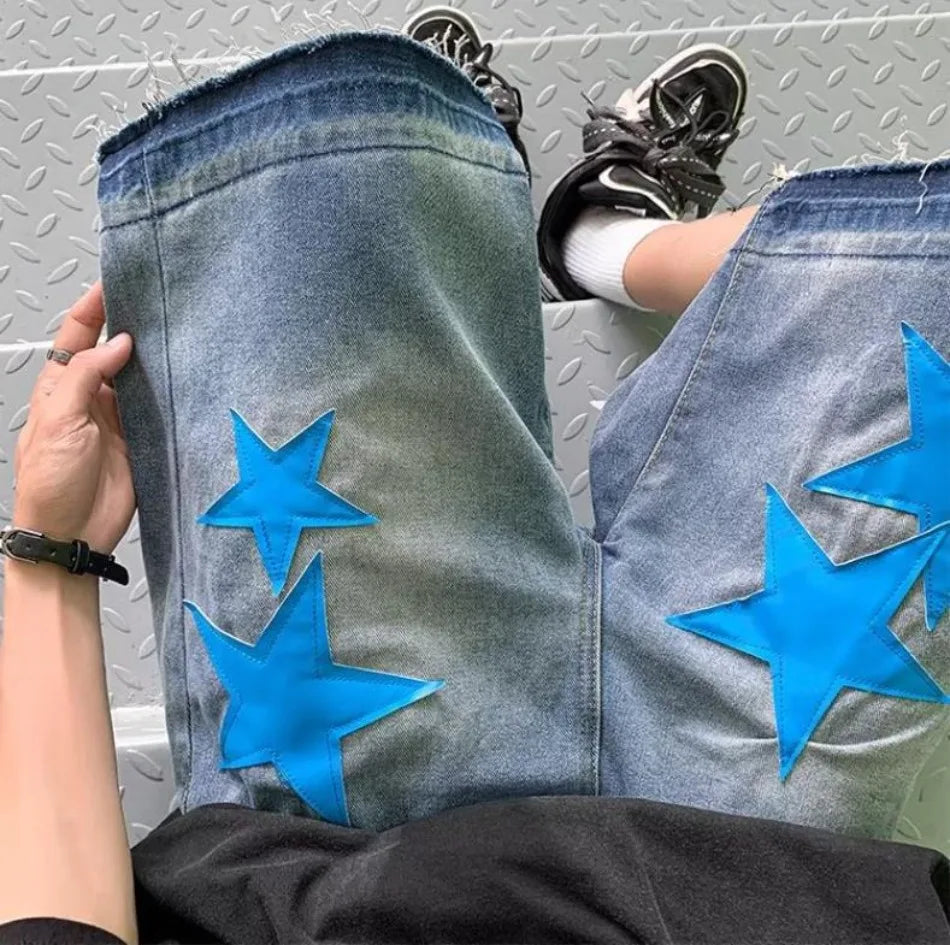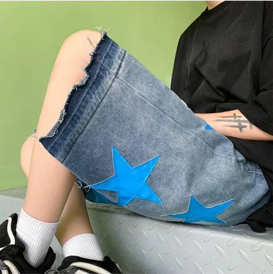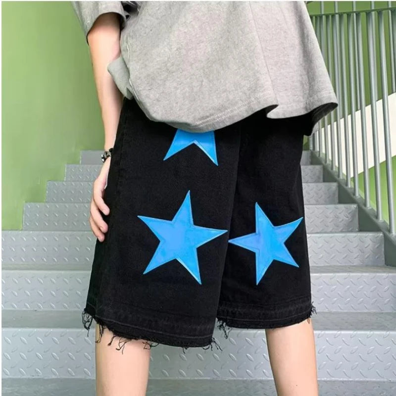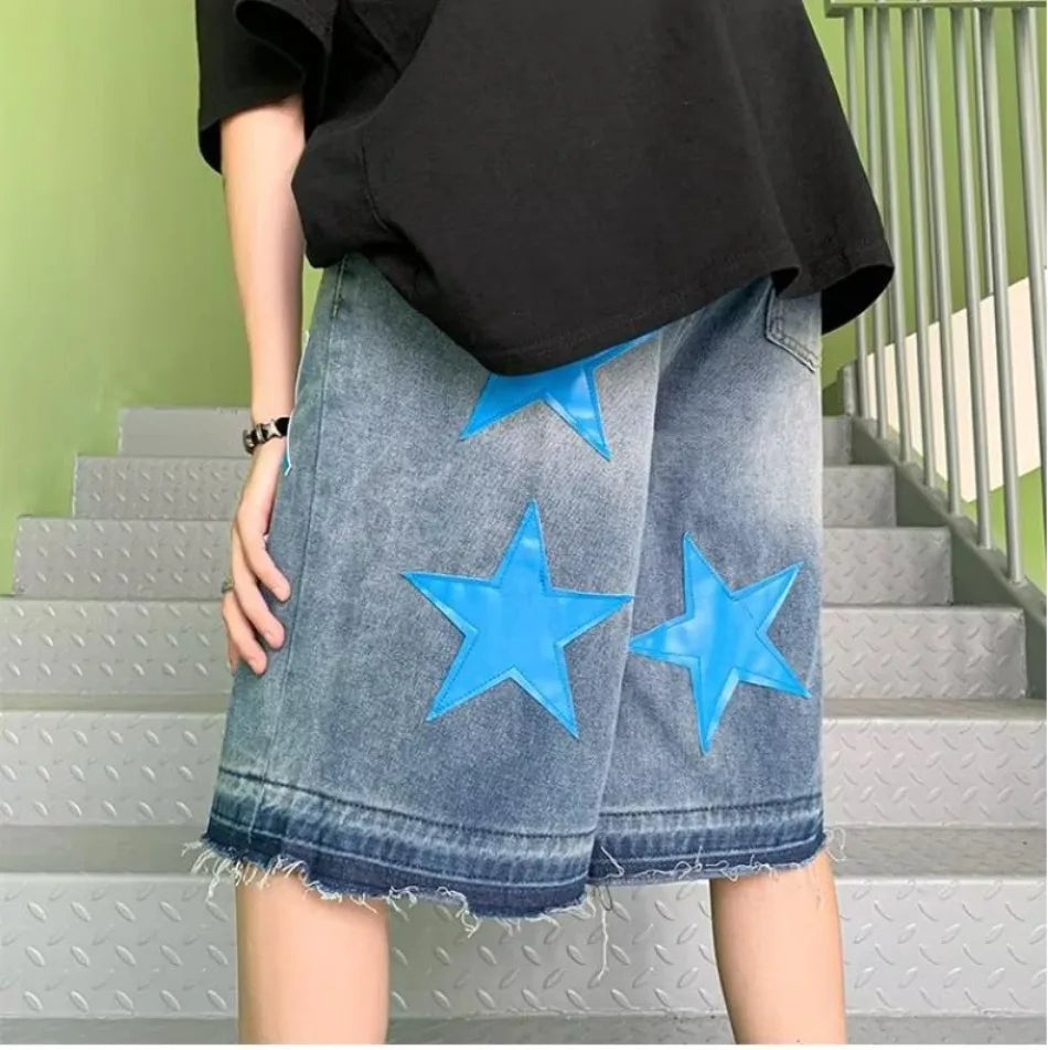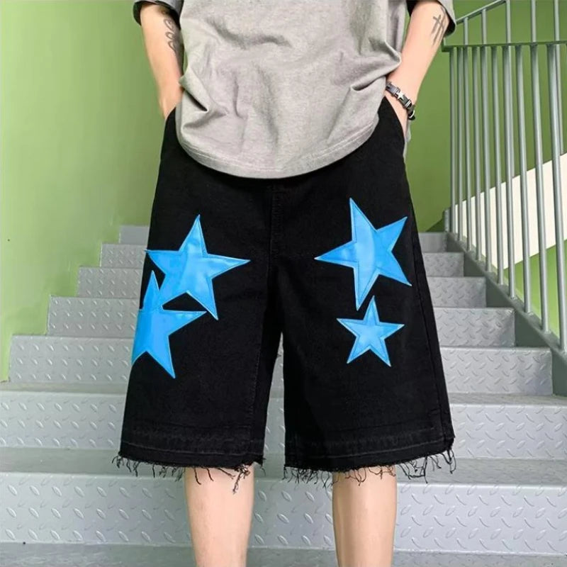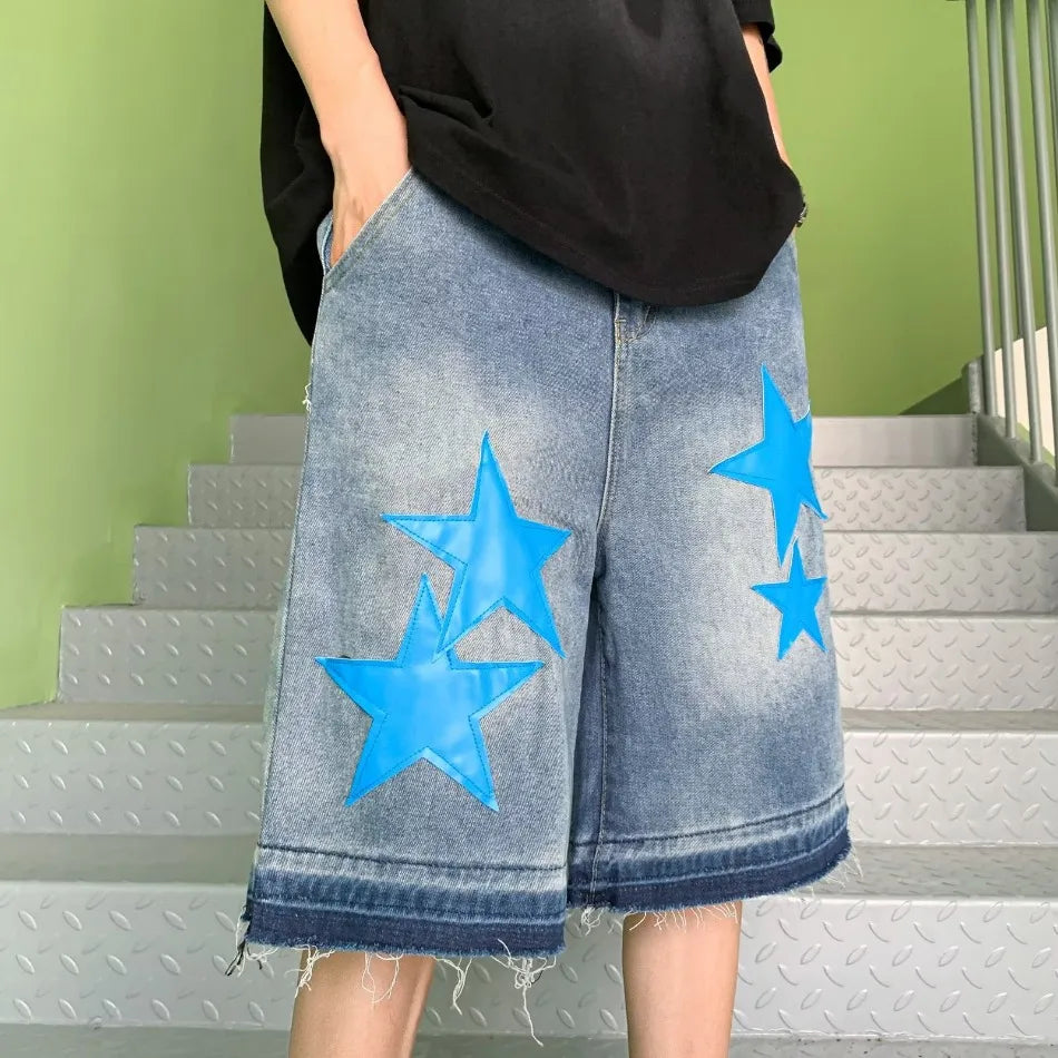 New Summer Oversized Denim Shorts Mens American Street Star Pattern Washed Cowboy Capris High Street Straight Wide Leg Capris