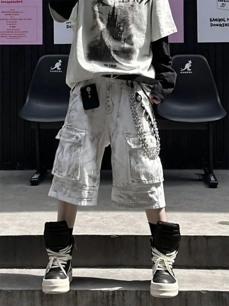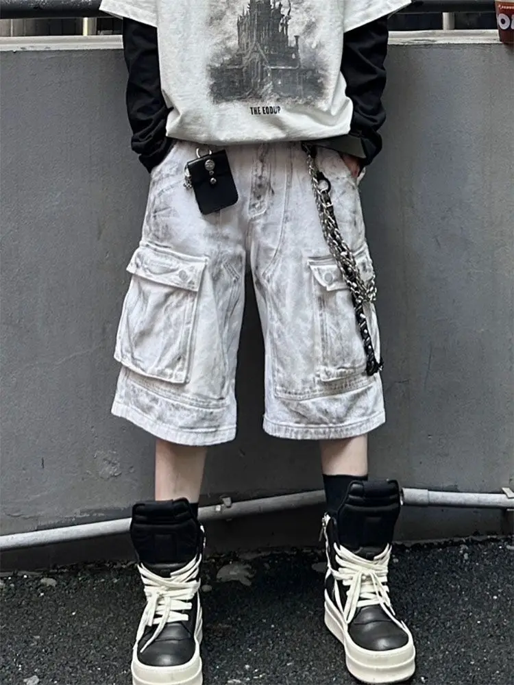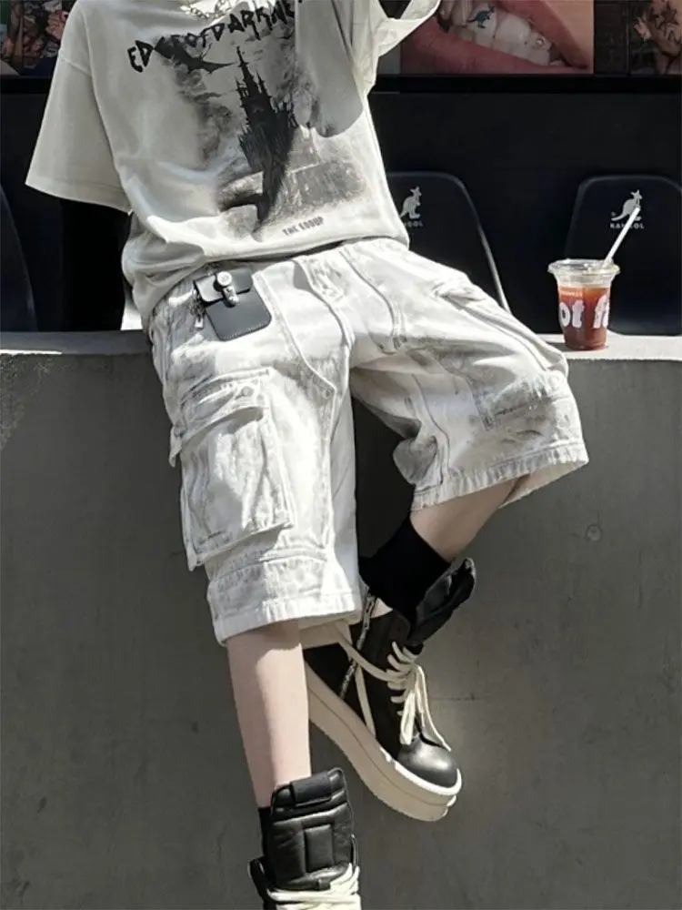 AIDASE - Old Workwear Pocket Denim Pants Loose Straight Wash Shorts for Men and Women